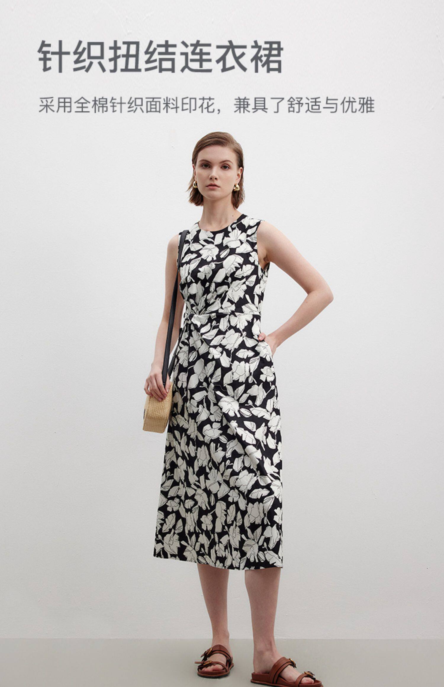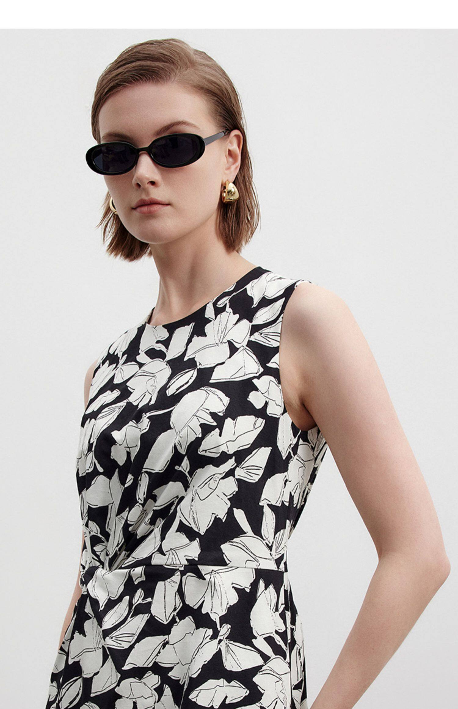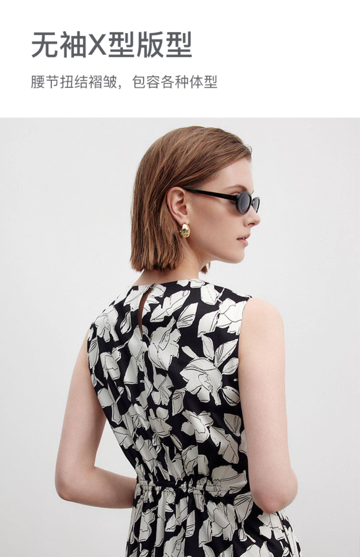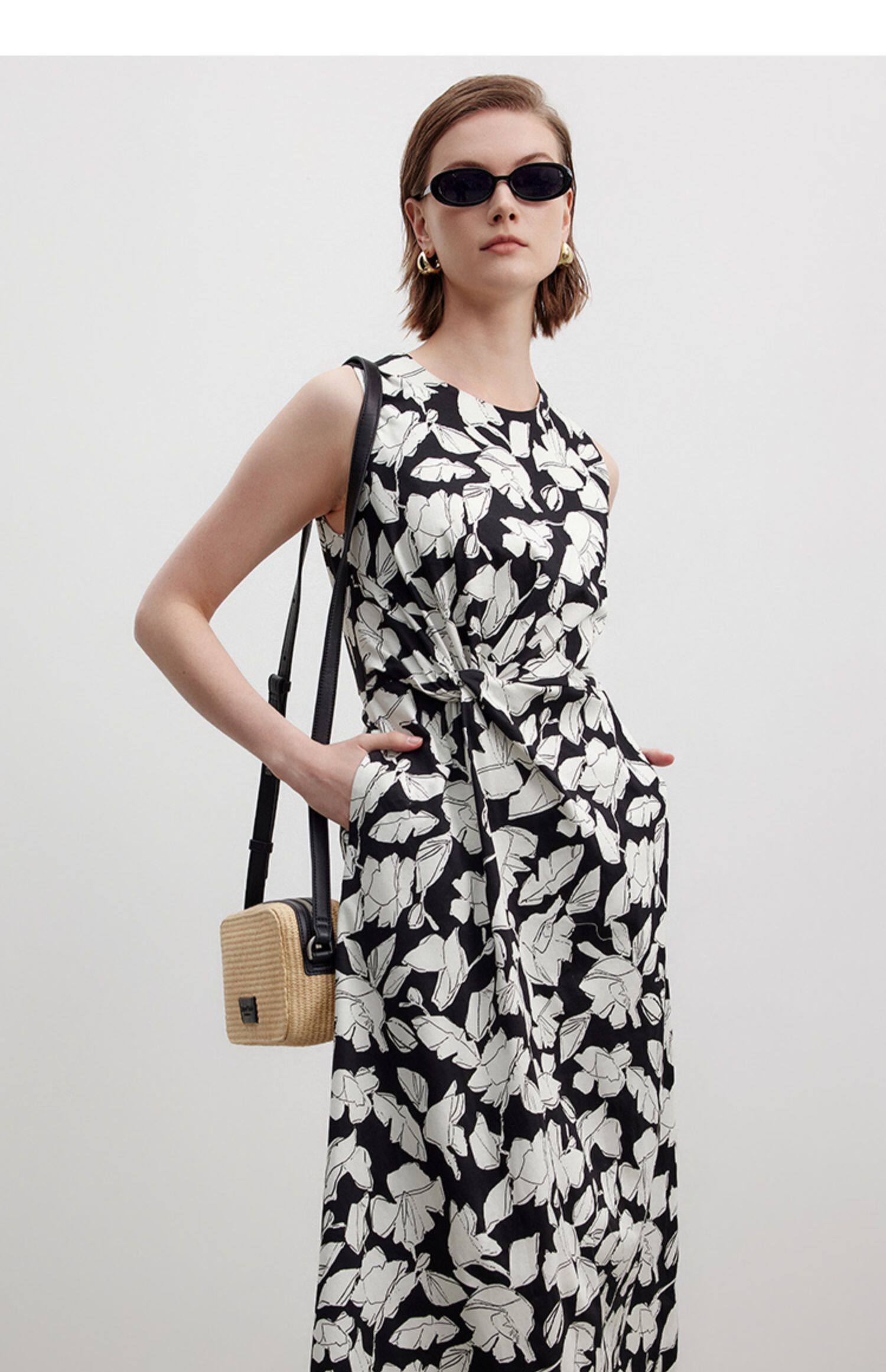 Marc O'Polo/MOP夏季新款好看黑白自然植物印花长款无袖连衣裙女