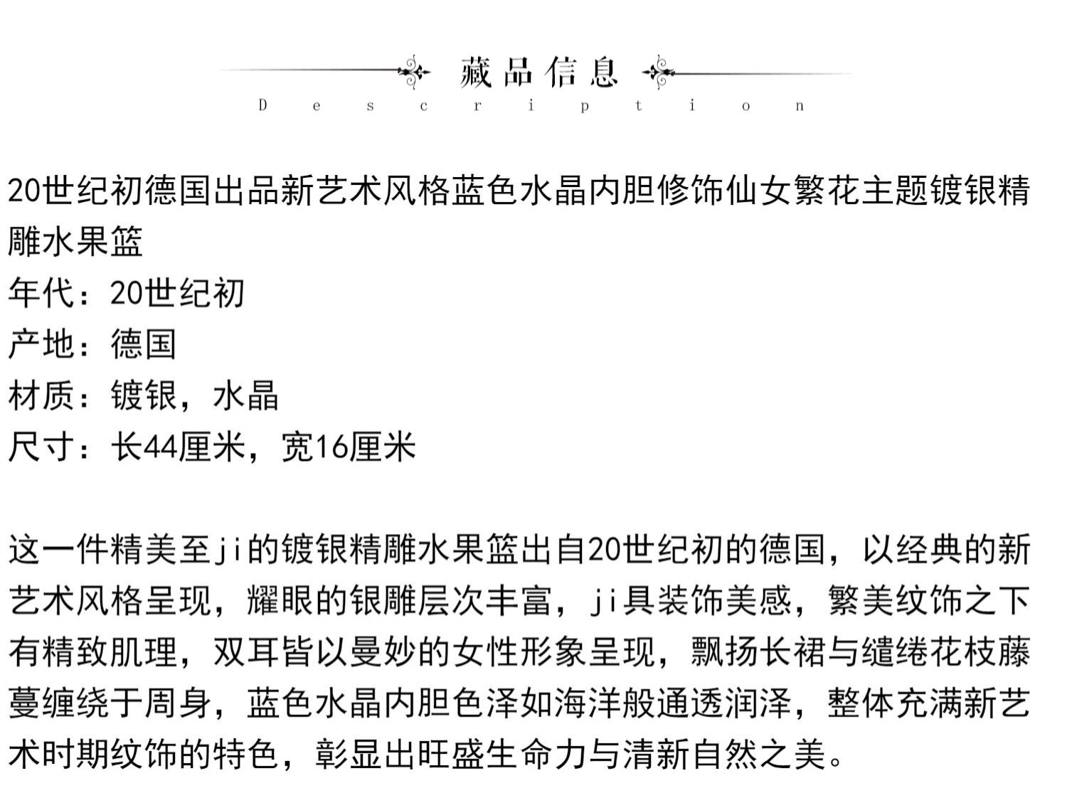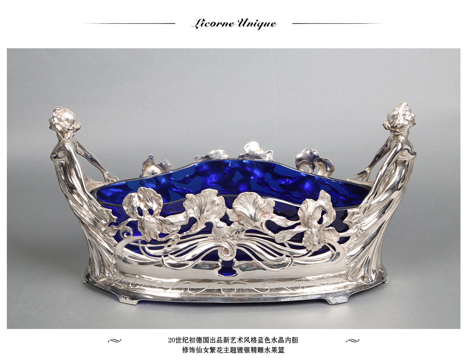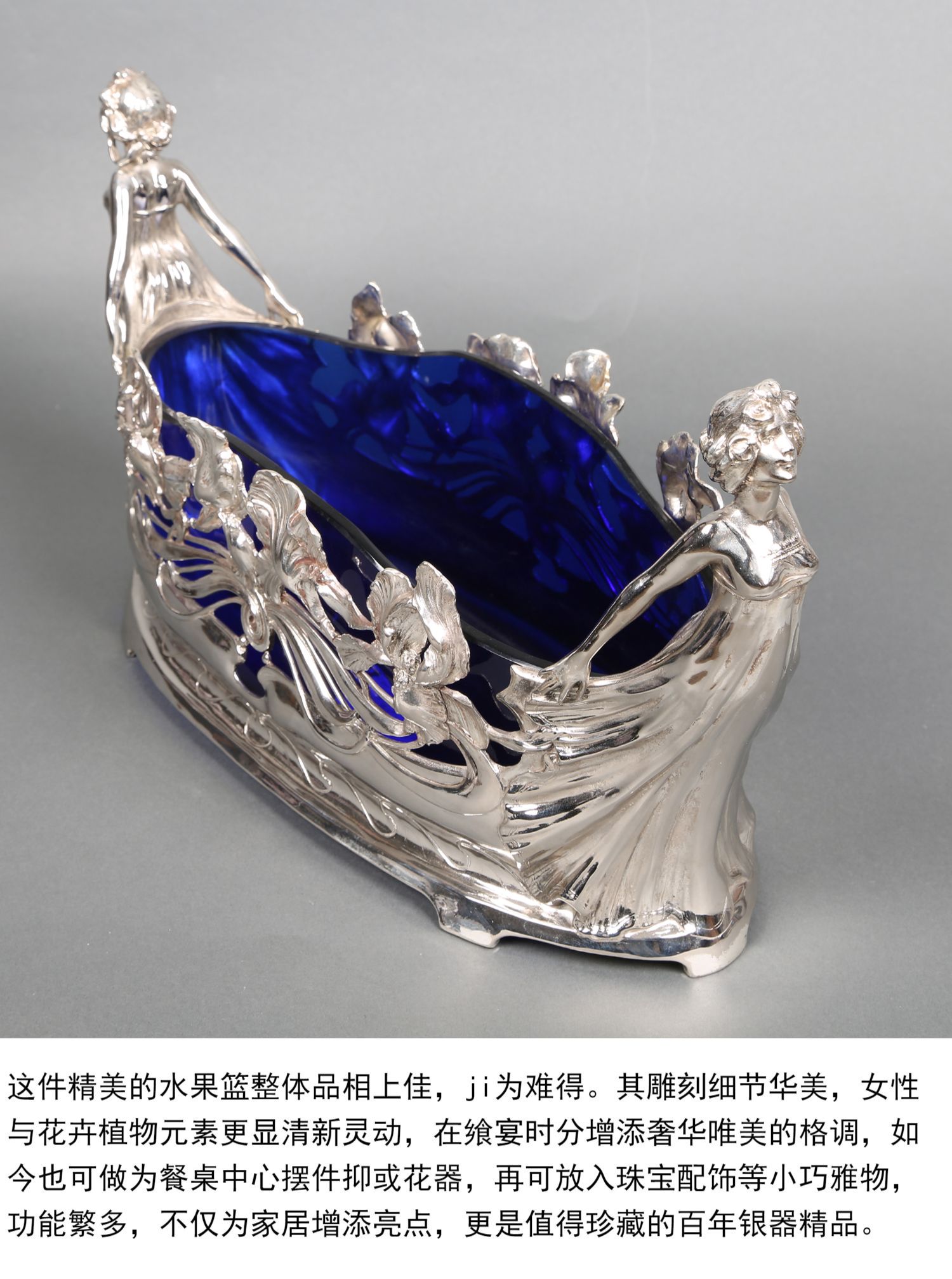 独角鹿西洋古董德国新艺术风蓝色水晶仙女繁花镀银精雕水果篮