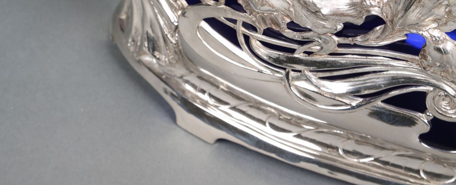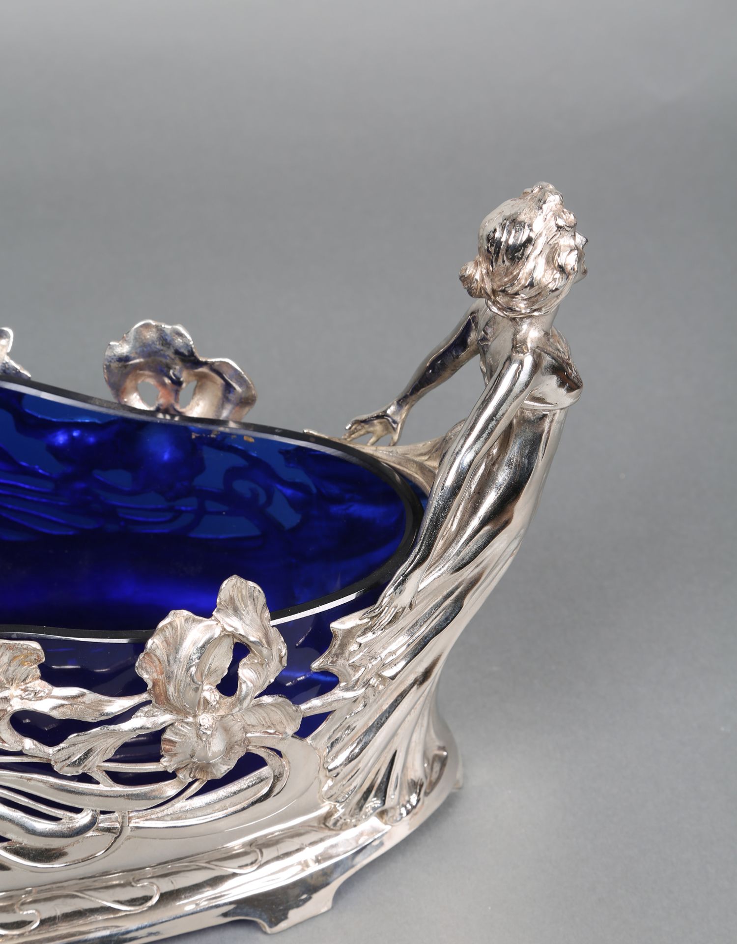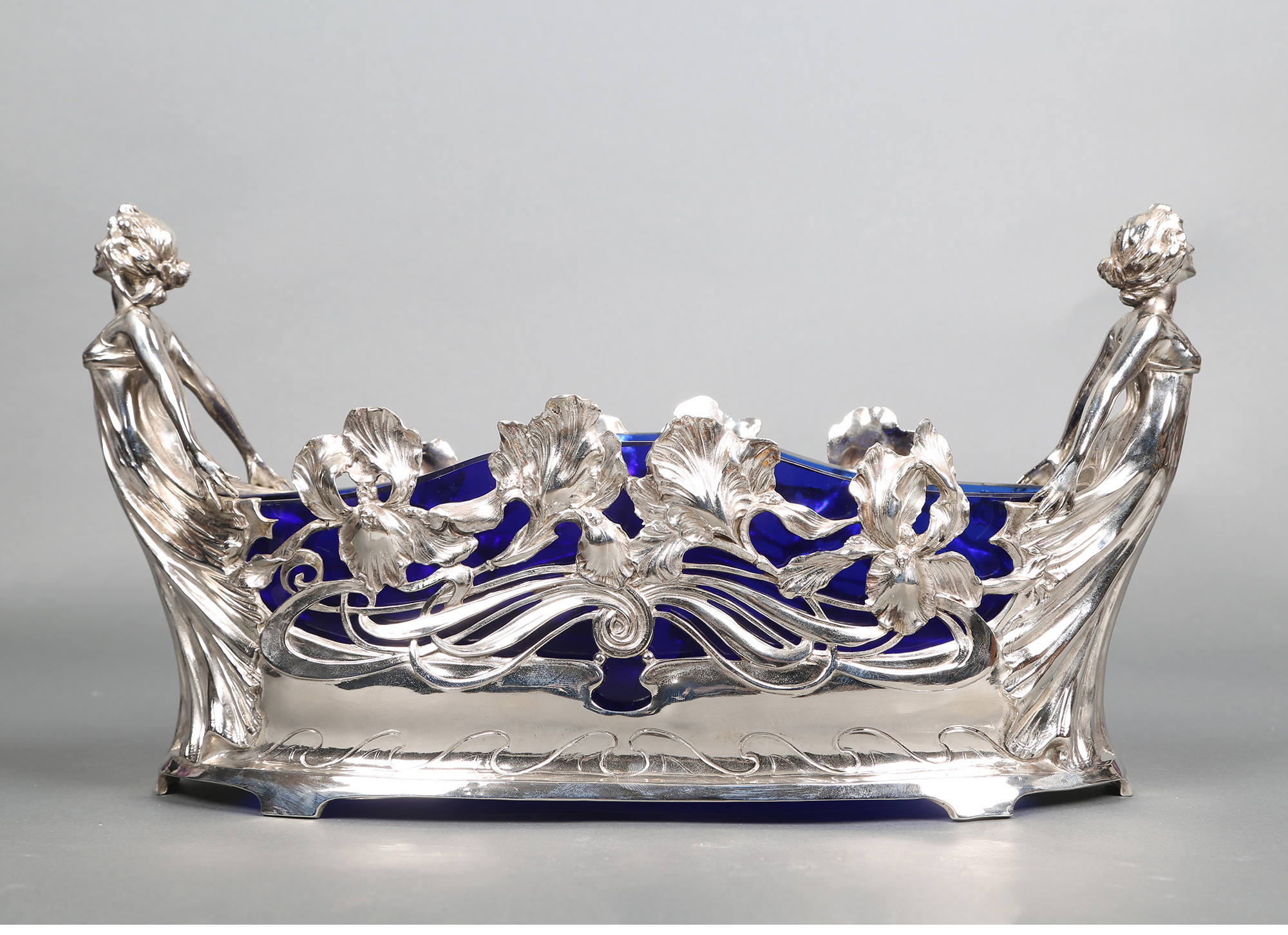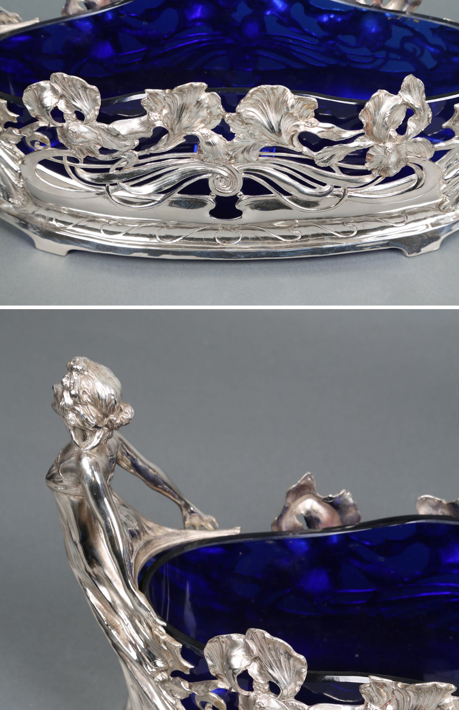 独角鹿西洋古董德国新艺术风蓝色水晶仙女繁花镀银精雕水果篮