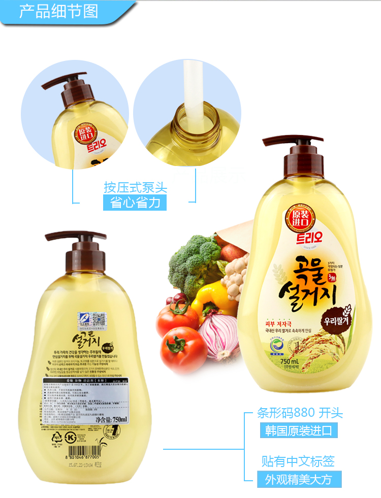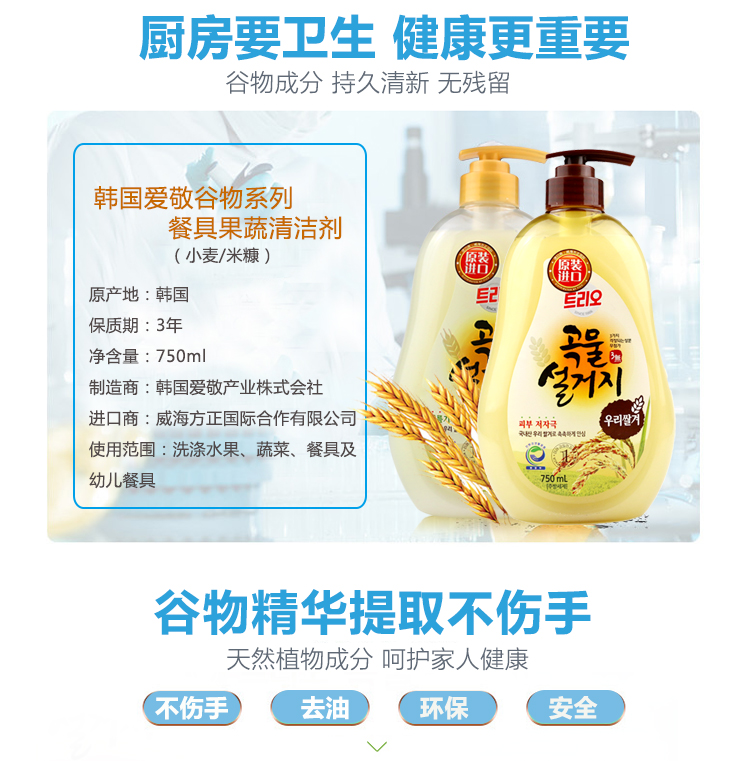 韩国爱敬进口宝宝洗洁精 清洗餐具水果谷物婴儿孕妇可用洗涤剂 750ml