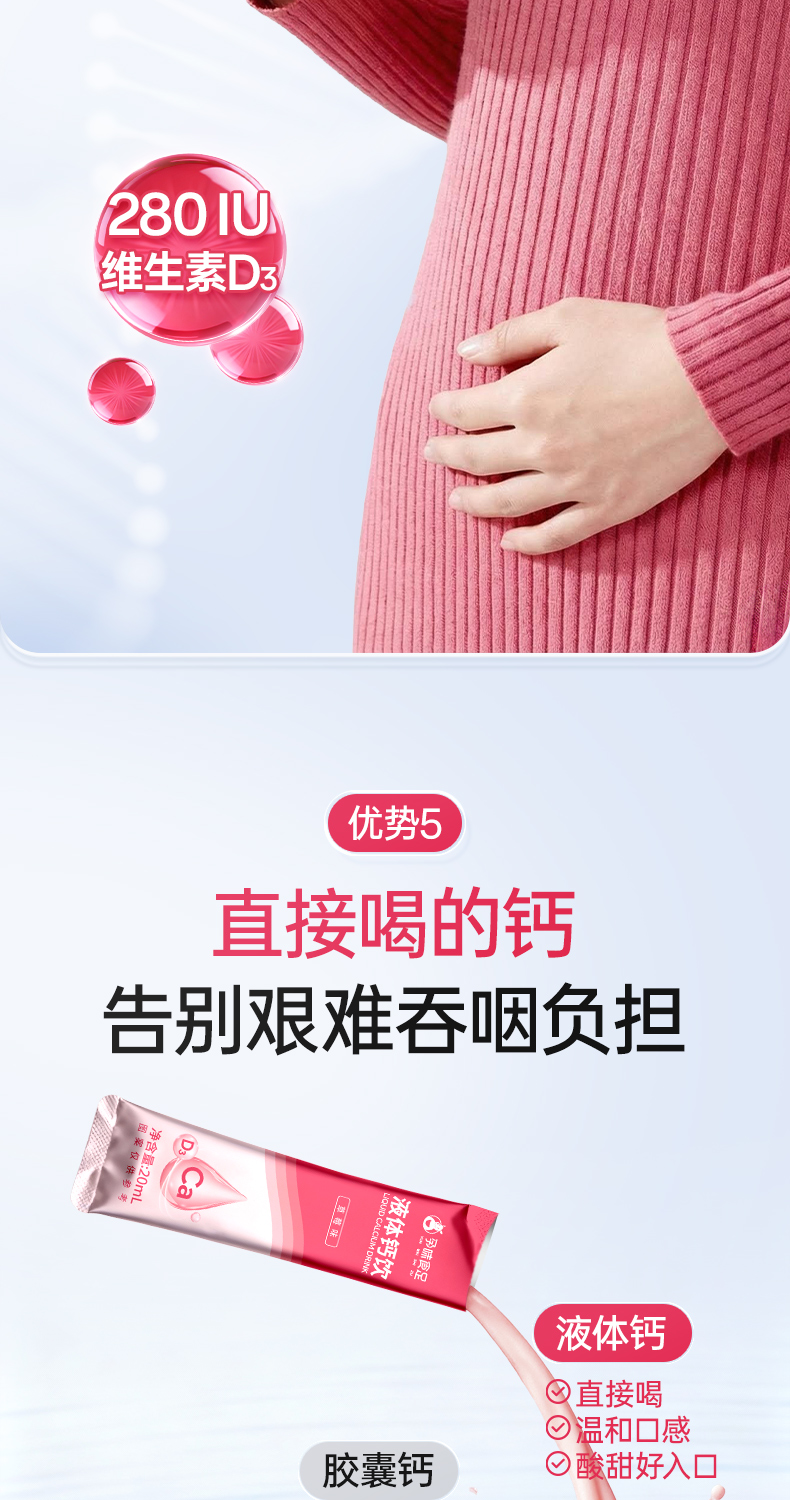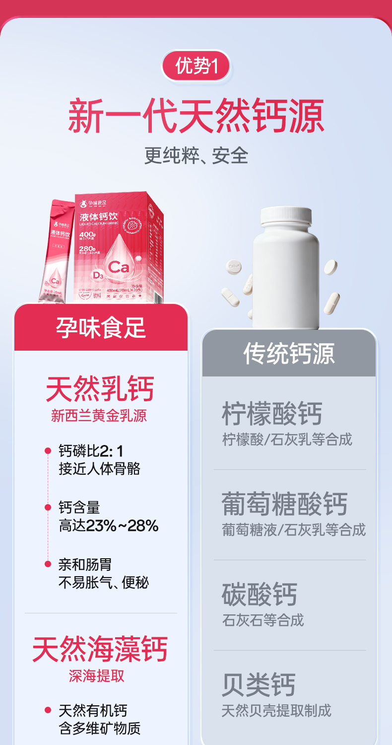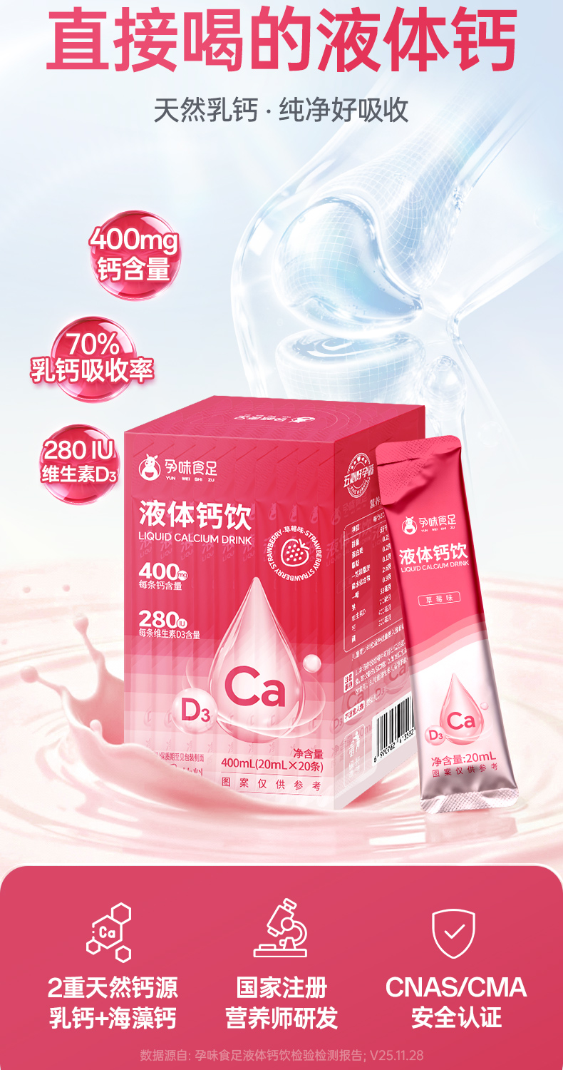 孕味食足液体钙饮 天然乳钙+海藻钙,双优质钙源,吸收率高达70%(优质钙源 + VD促吸收 + 水解蛋黄粉)三效科学配比 400ml/盒(20ml*20条)