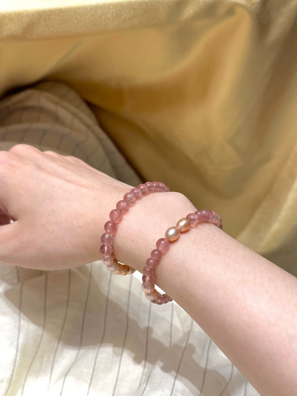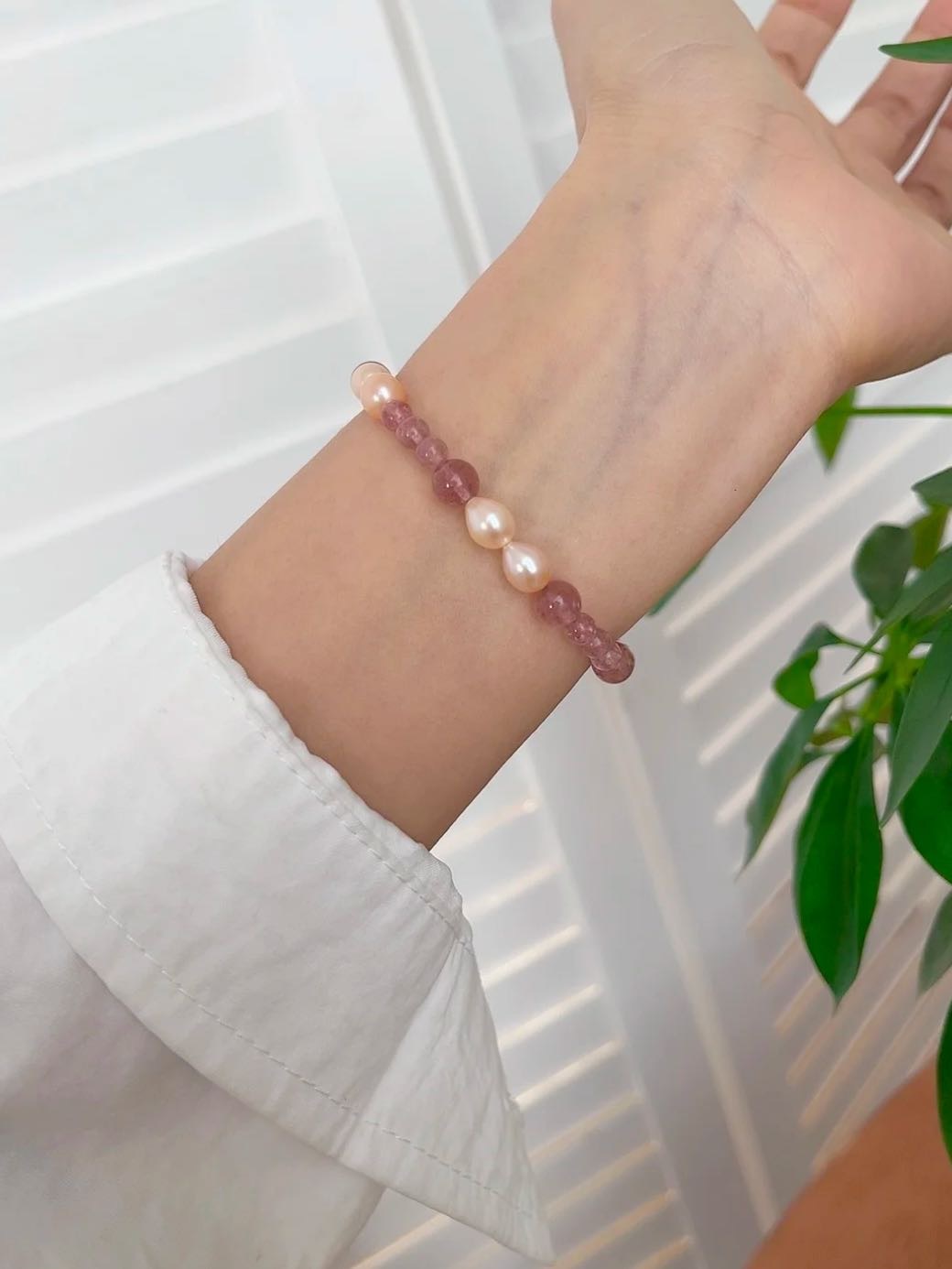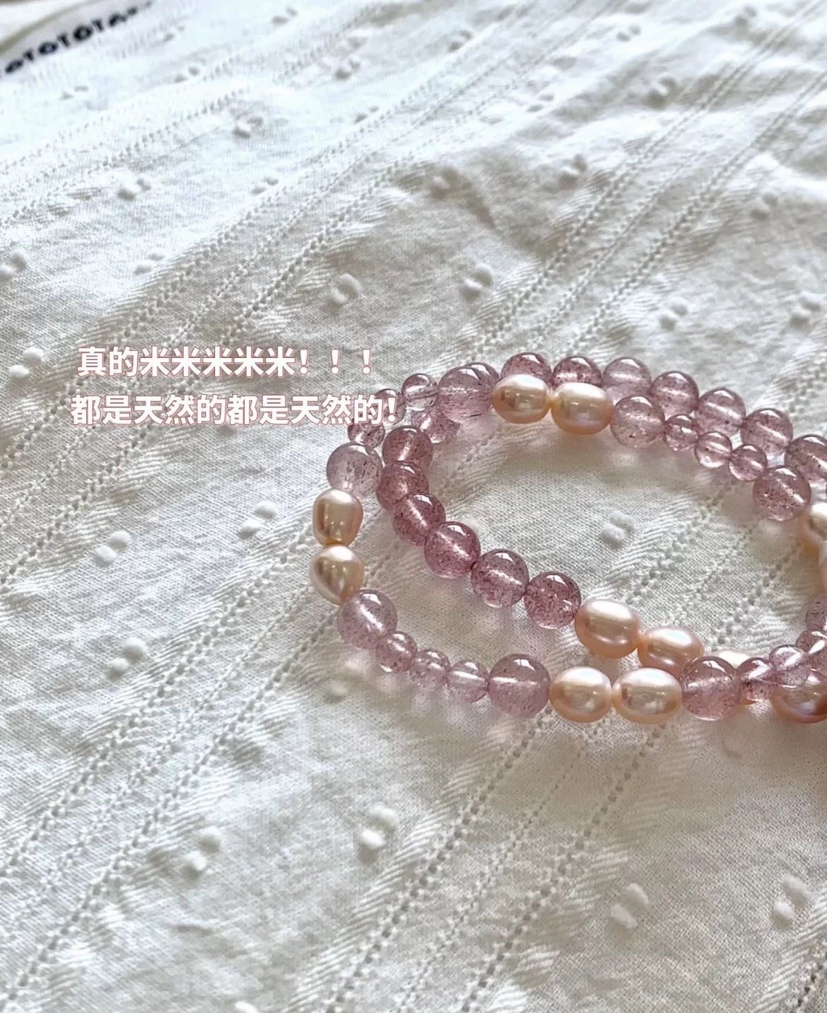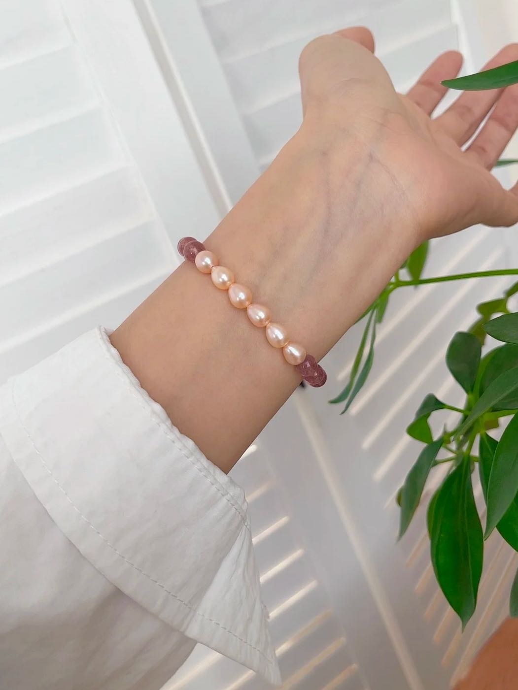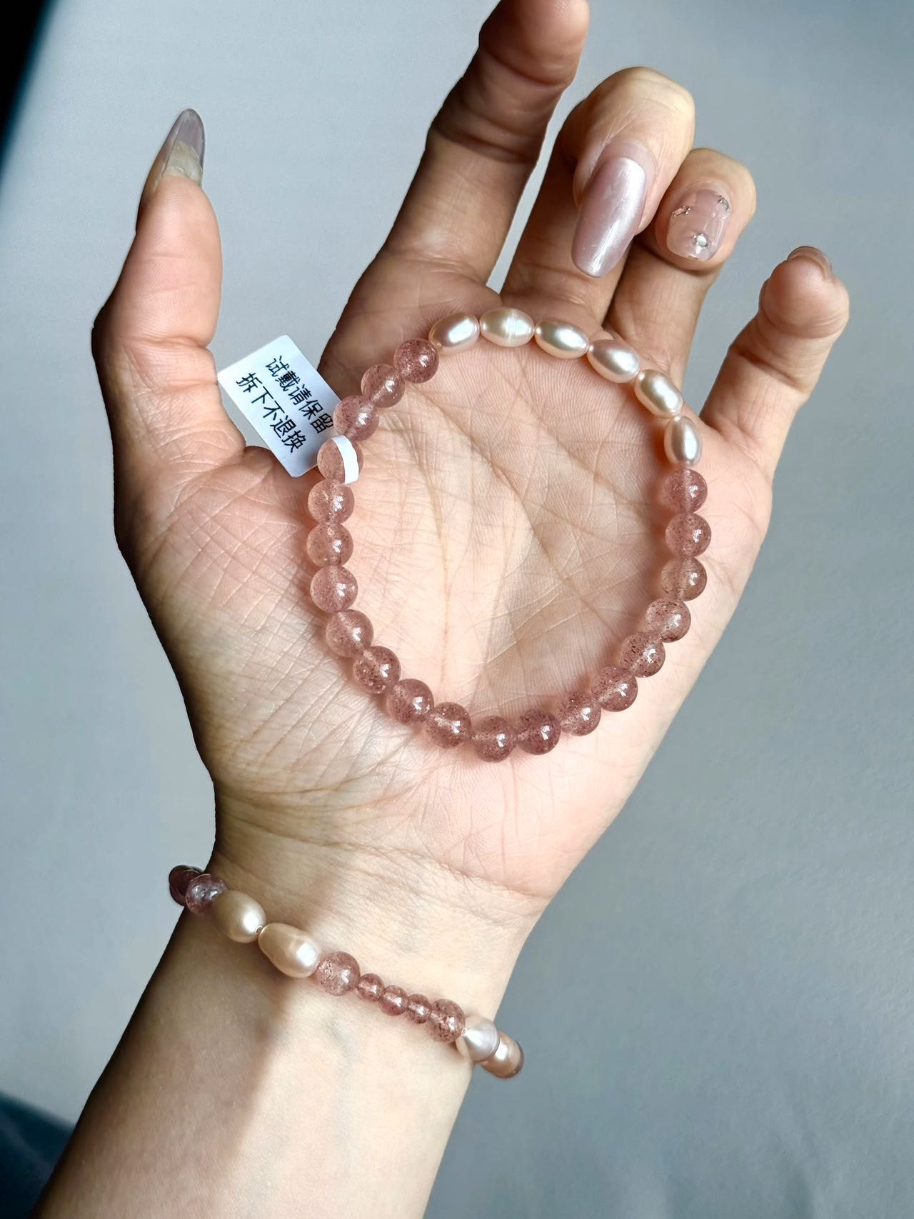 ✅尺寸:草莓晶5/6MM,珍珠约6-6.5mm,弹力设计,约14-16手围可戴