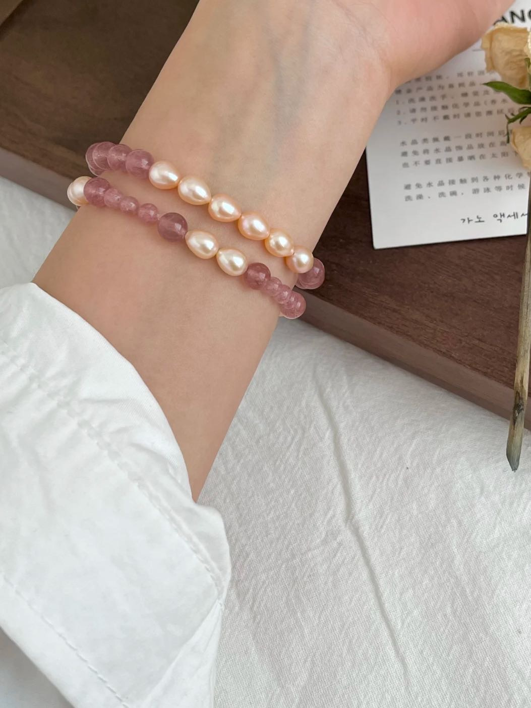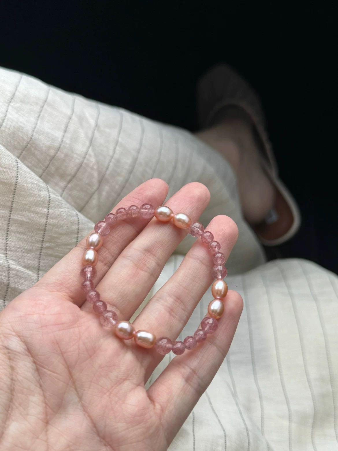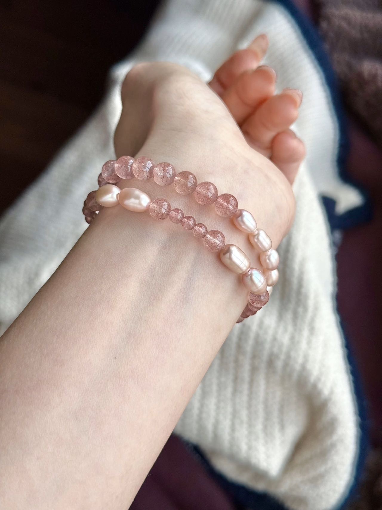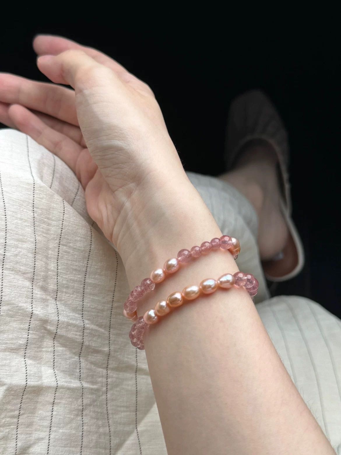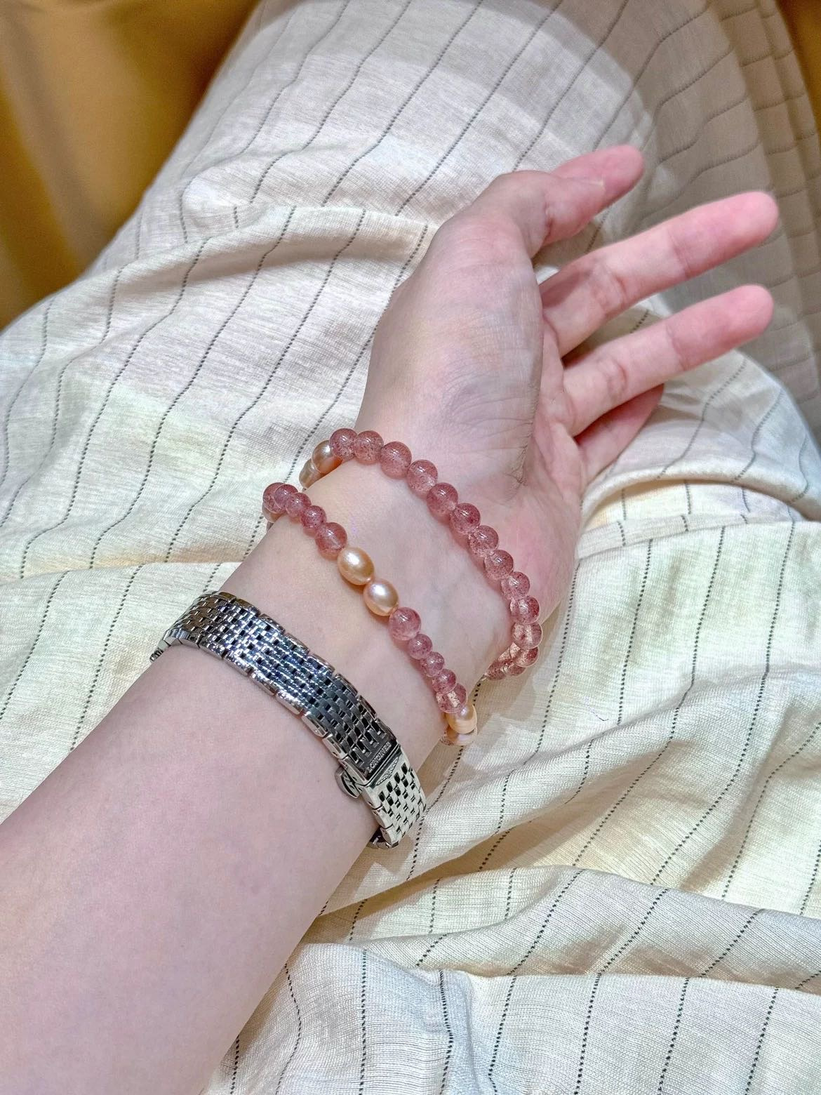 ✅尺寸:草莓晶5/6MM,珍珠约6-6.5mm,弹力设计,约14-16手围可戴