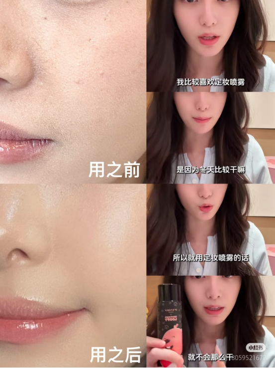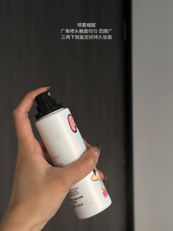 使用前记得先摇一摇哦! 喷出来的水雾真的好细腻!! 喷上脸的时候感觉像微风吹过那样不会不呲脸扇面喷出 可以均匀覆盖全脸不会破坏底妆在脸上成膜好快!喷上即成膜!