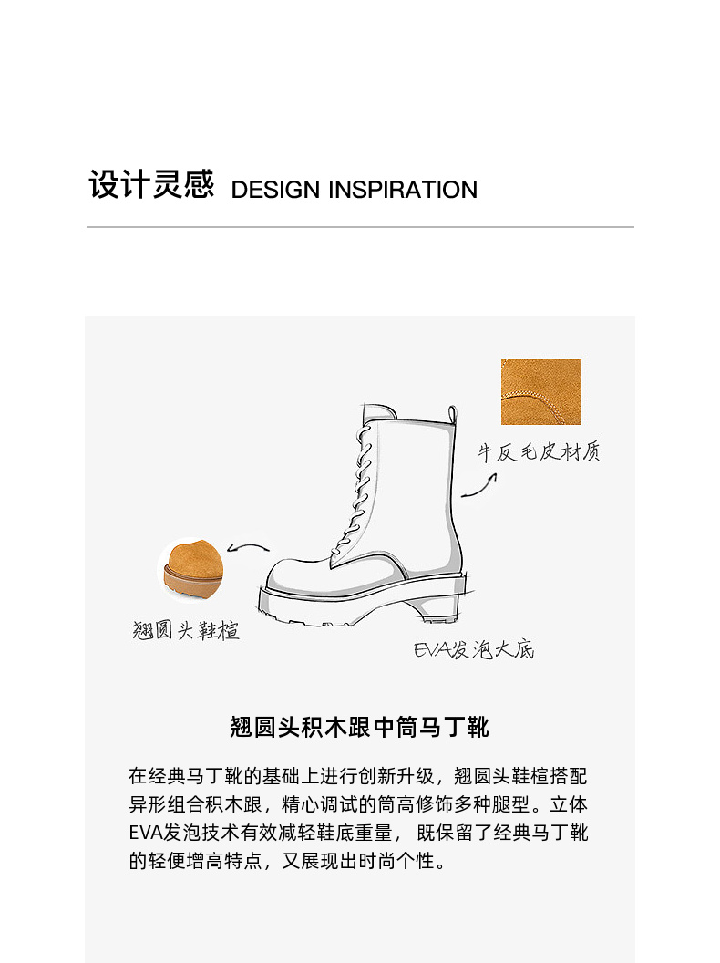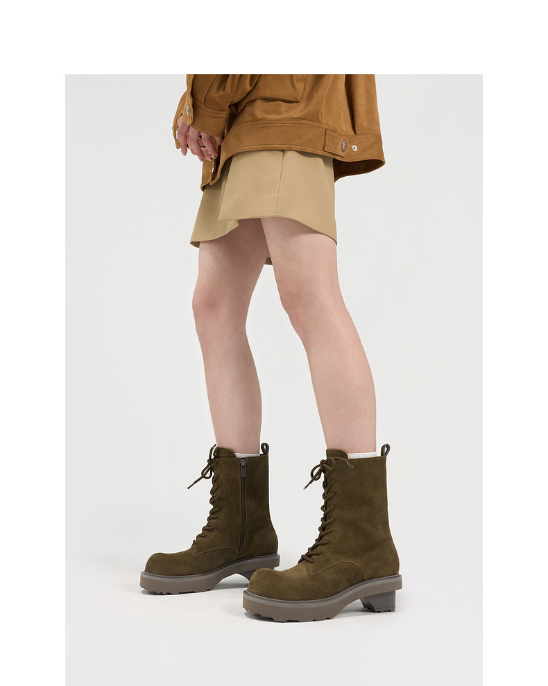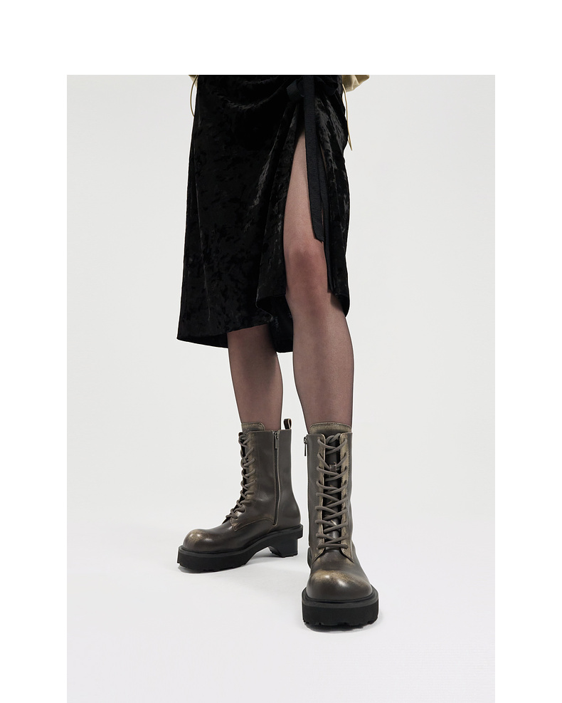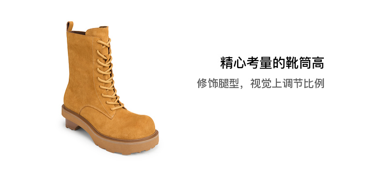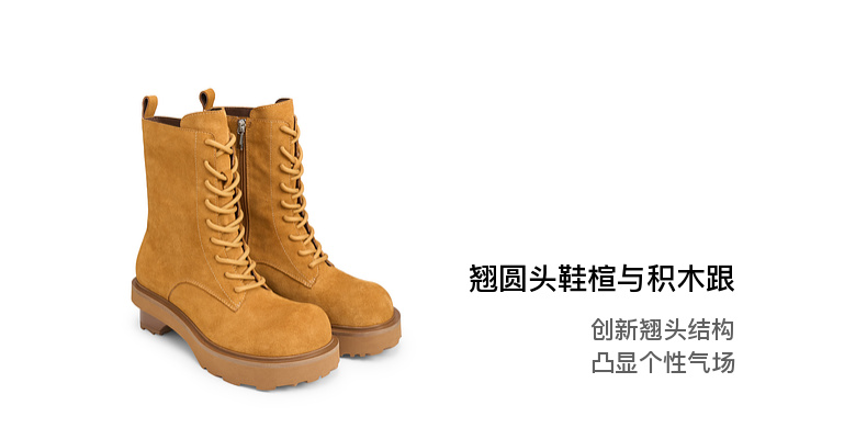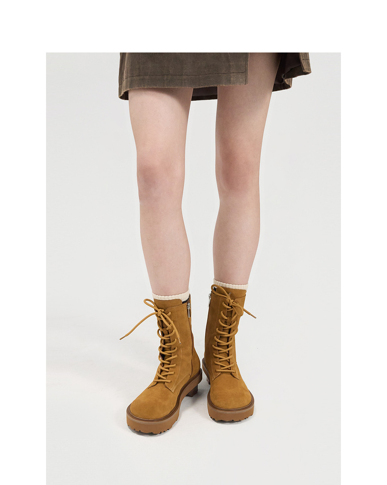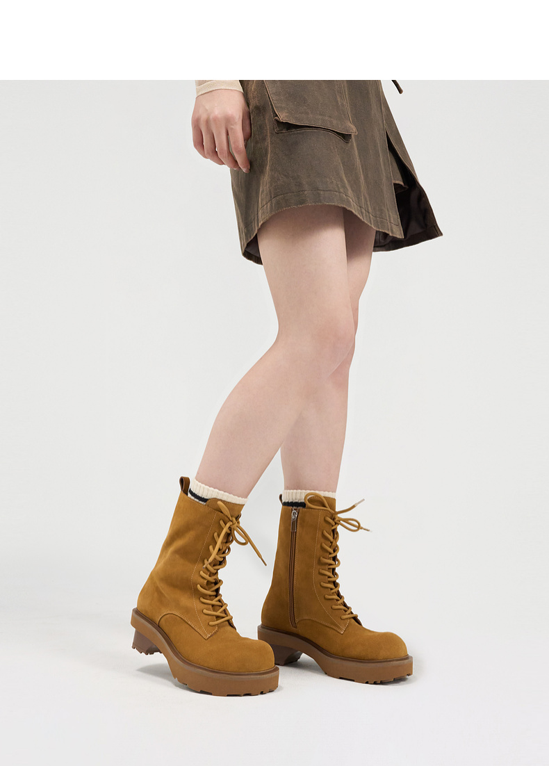 lost in echo2024秋季新款翘圆头积木跟中筒真皮马丁靴大黄靴女