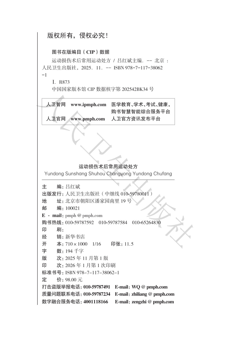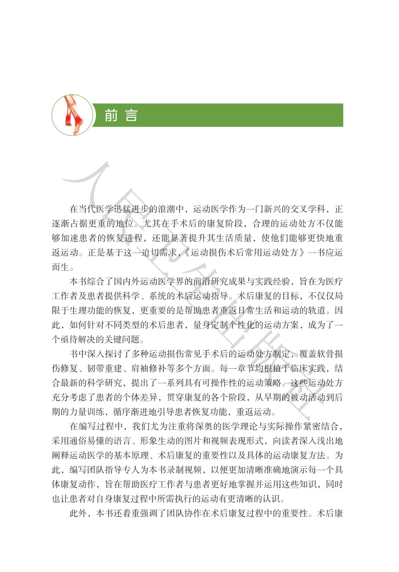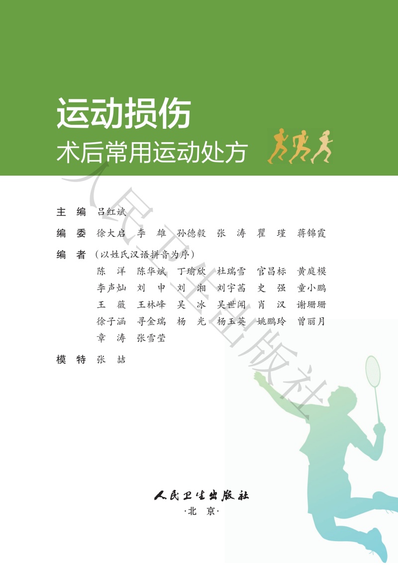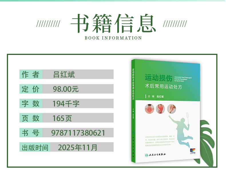 运动损伤术后常用运动处方 附视频 吕红斌 主编 本书的“居家锻炼”为医务人员和患者提供了基本的家庭自我康复方案人民卫生出版社