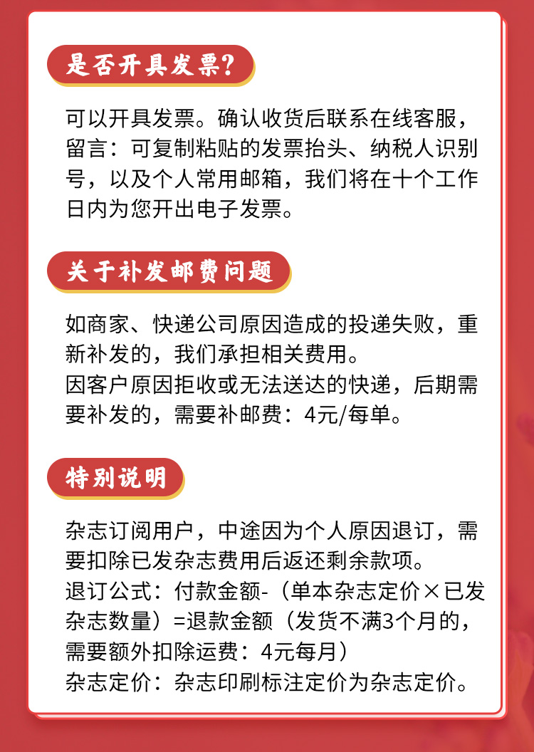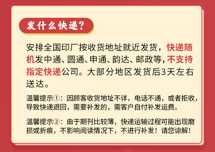 订阅期内,每月15号前发出当月的2本杂志,举个例子,3.15号前发出三月刊(第5期+第6期)。如遇假期或者极端天气,发货稍有延迟