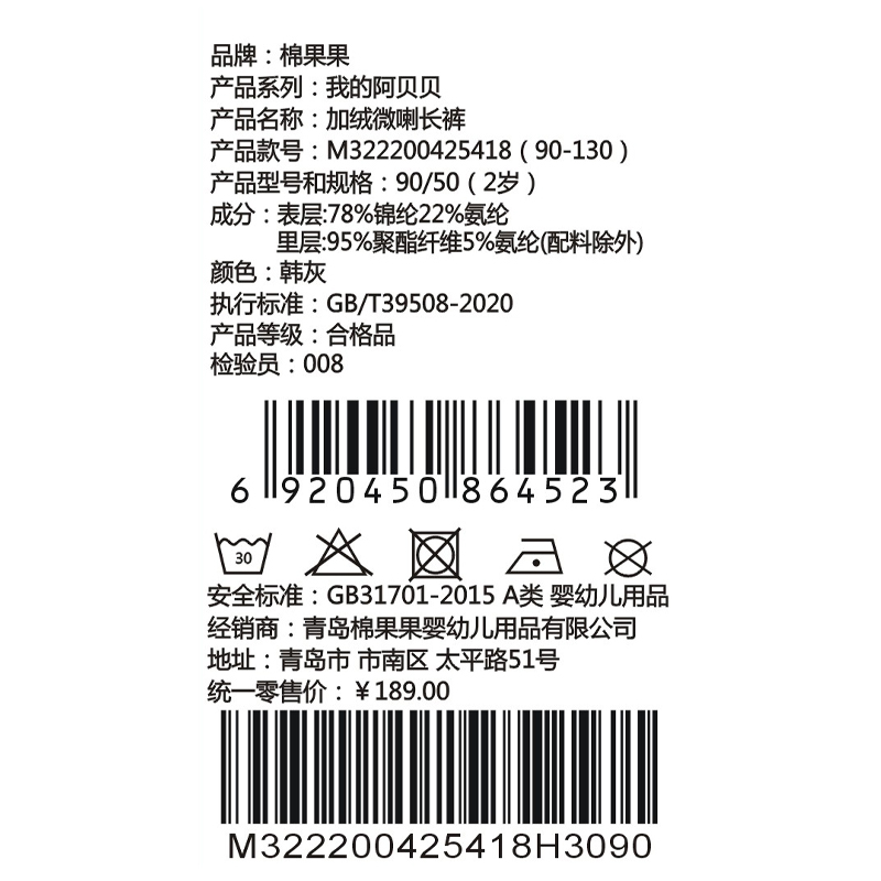 | 裤长 | 49 | 54.5 | 60.5 | 66.5 | 73 |