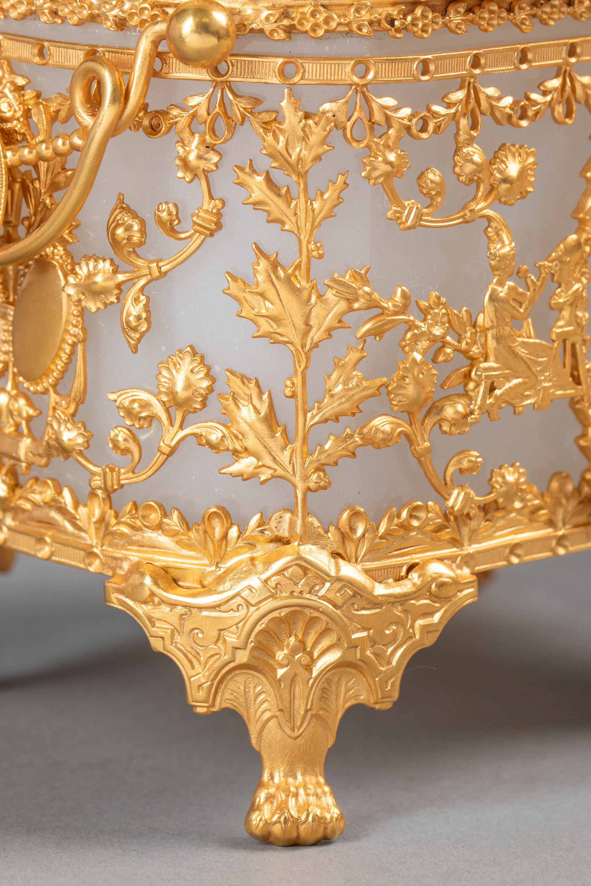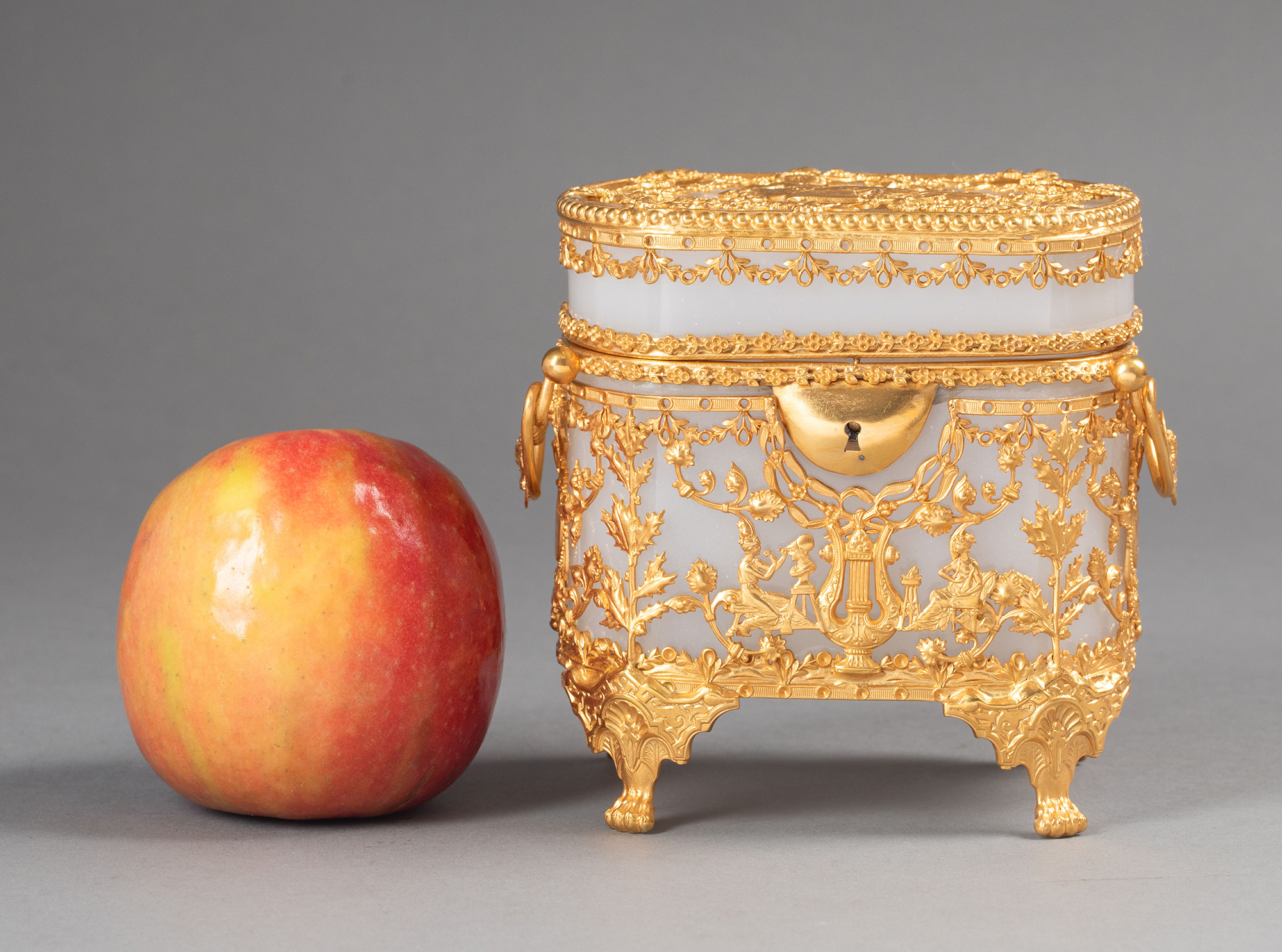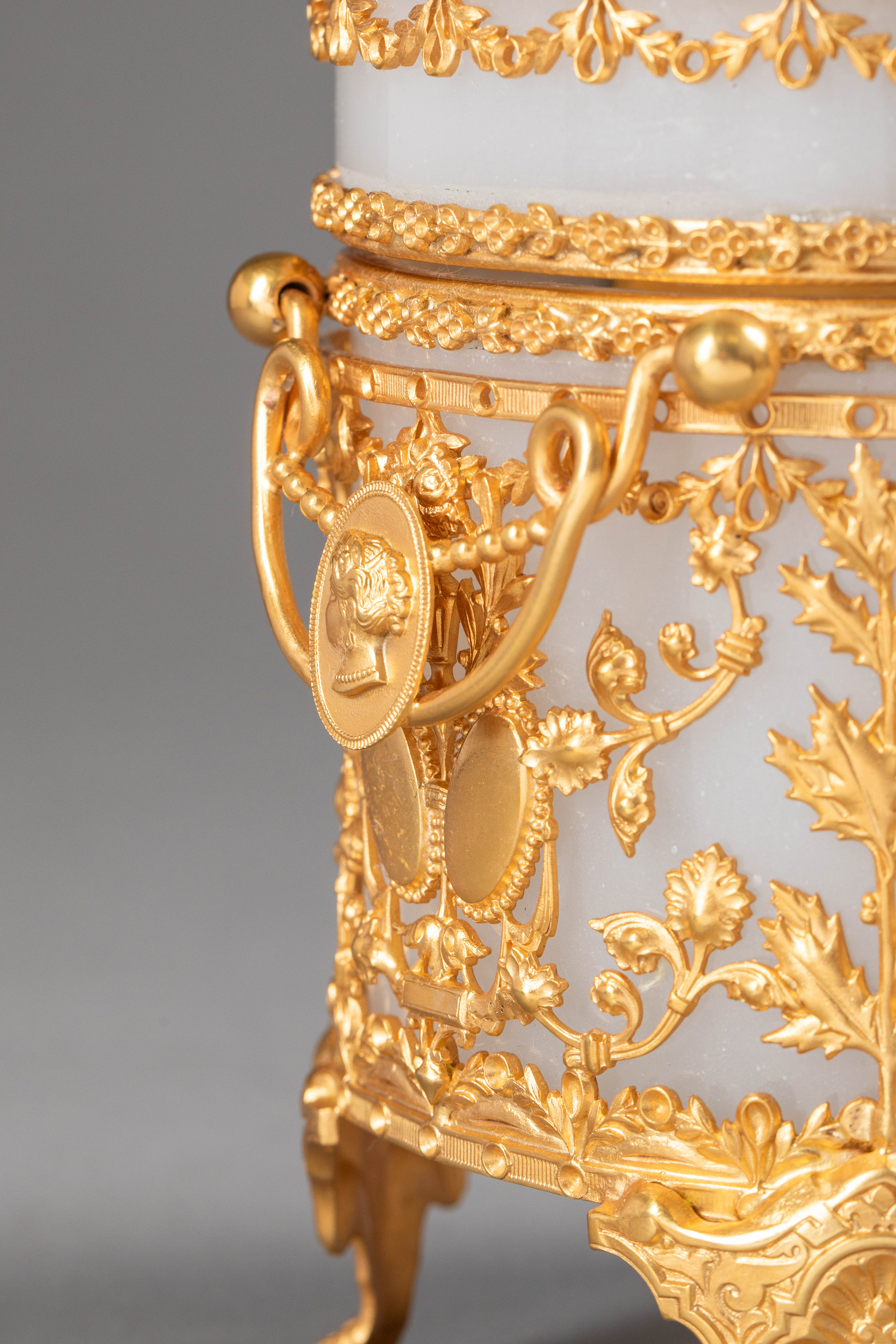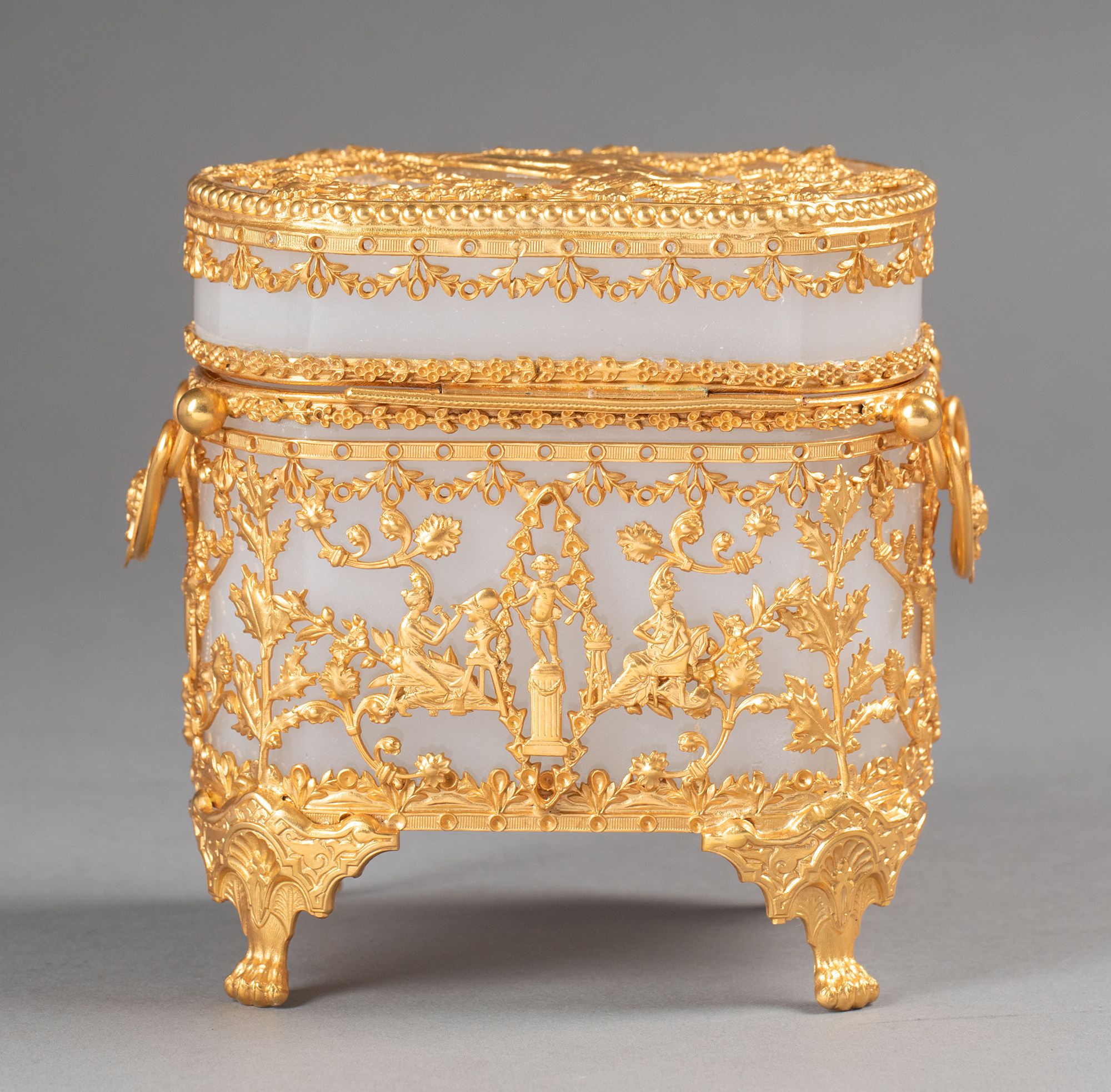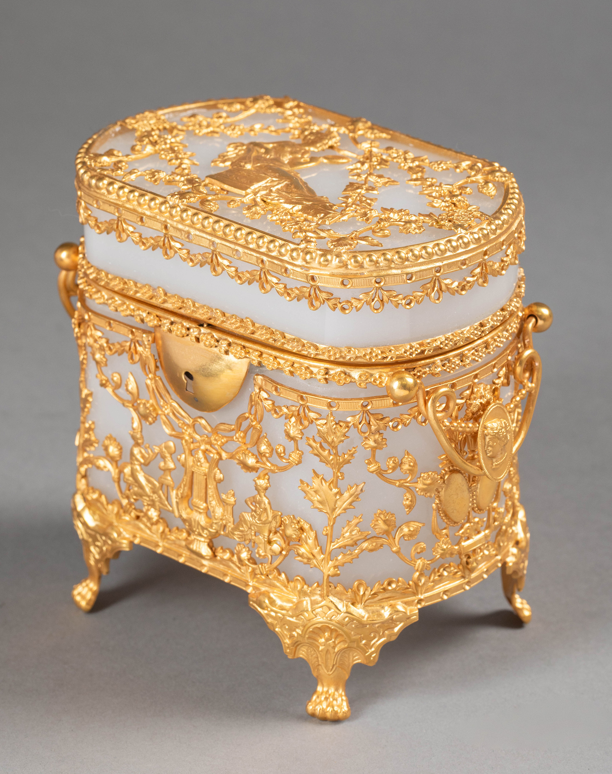 19世纪法国出品古典女子与竖琴藤叶主题铜鎏金精雕装饰乳色欧泊水晶珍宝盒