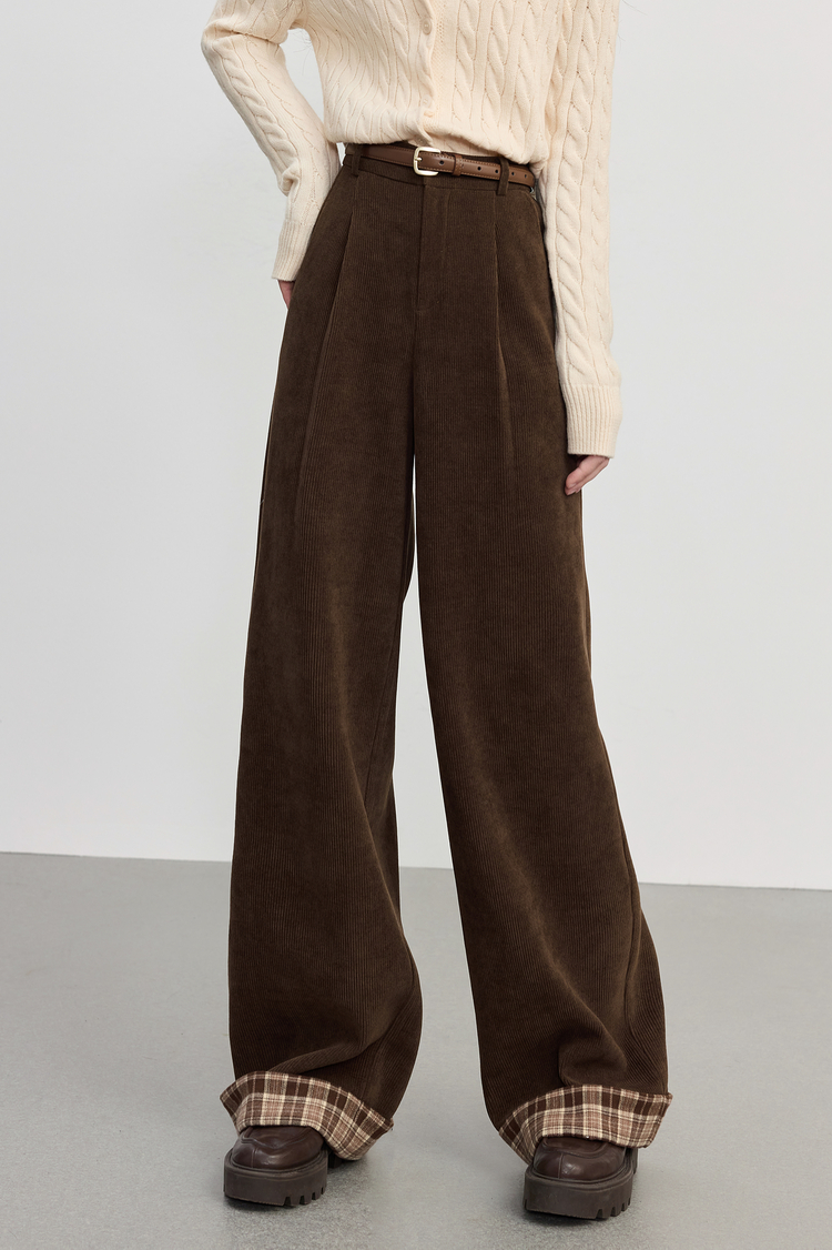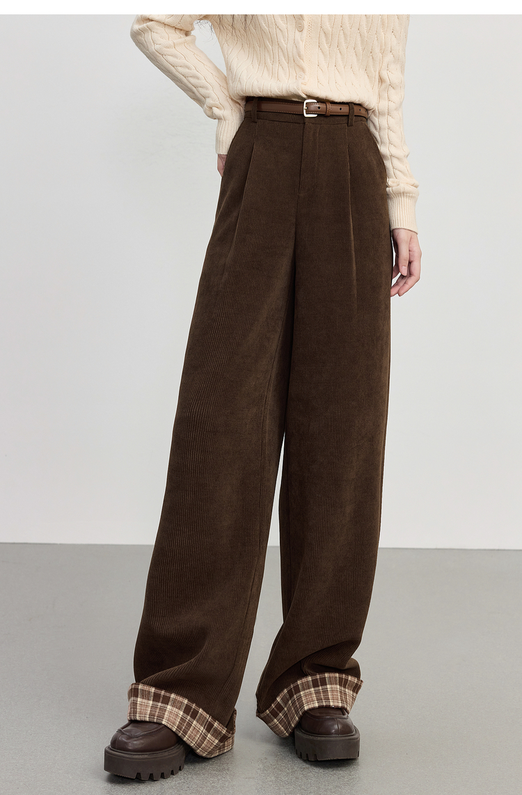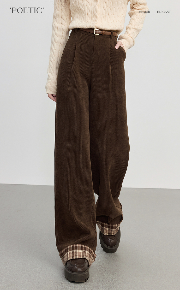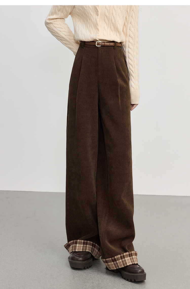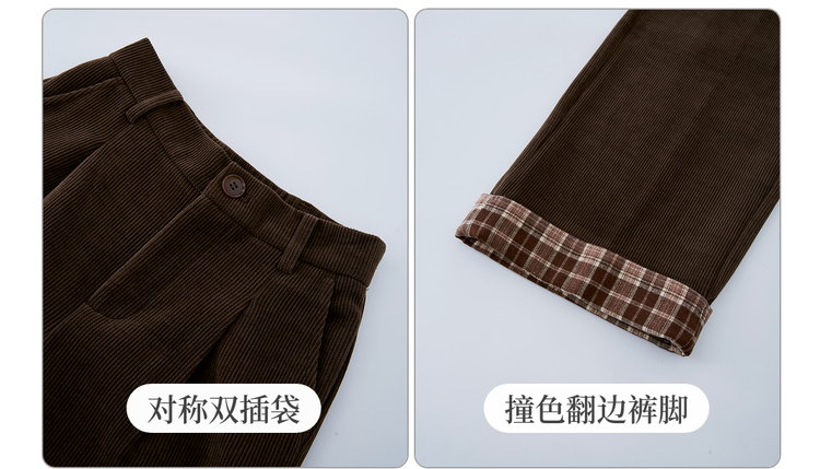 【10/15新品】熙世界老钱风灯芯绒阔腿裤女秋冬新款撞色格纹翻边直筒宽松休闲裤