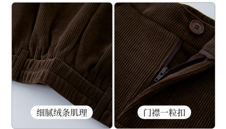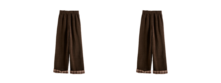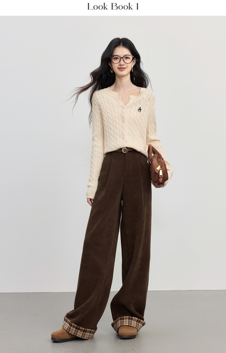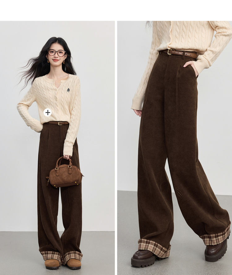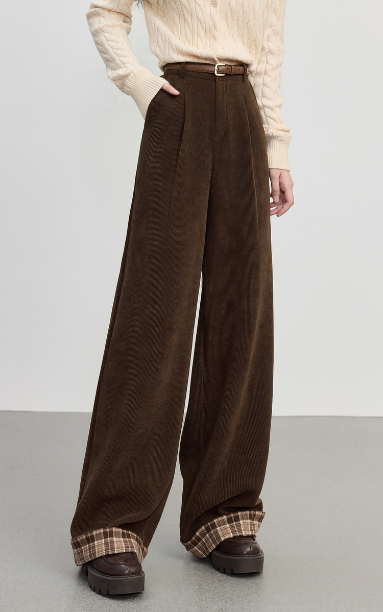 【10/15新品】熙世界老钱风灯芯绒阔腿裤女秋冬新款撞色格纹翻边直筒宽松休闲裤