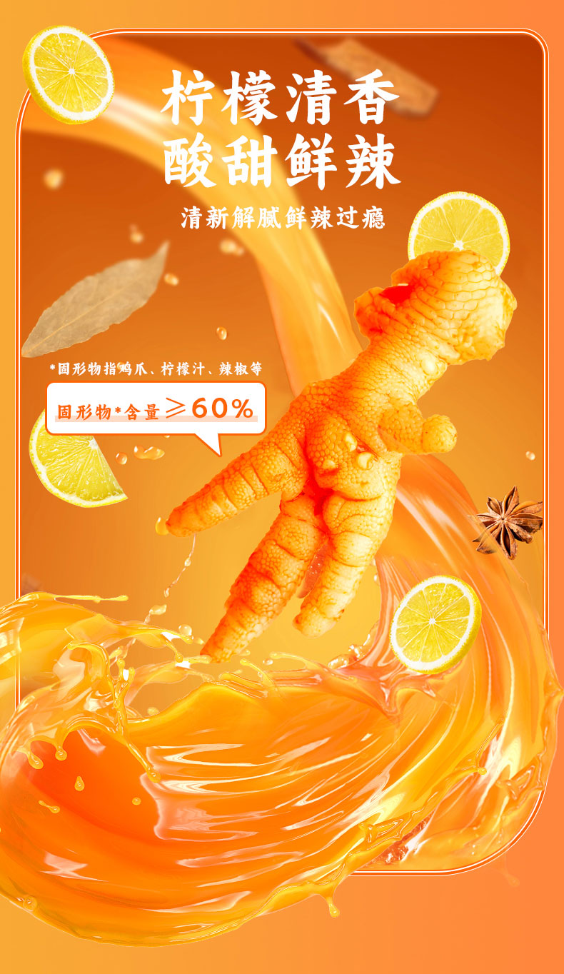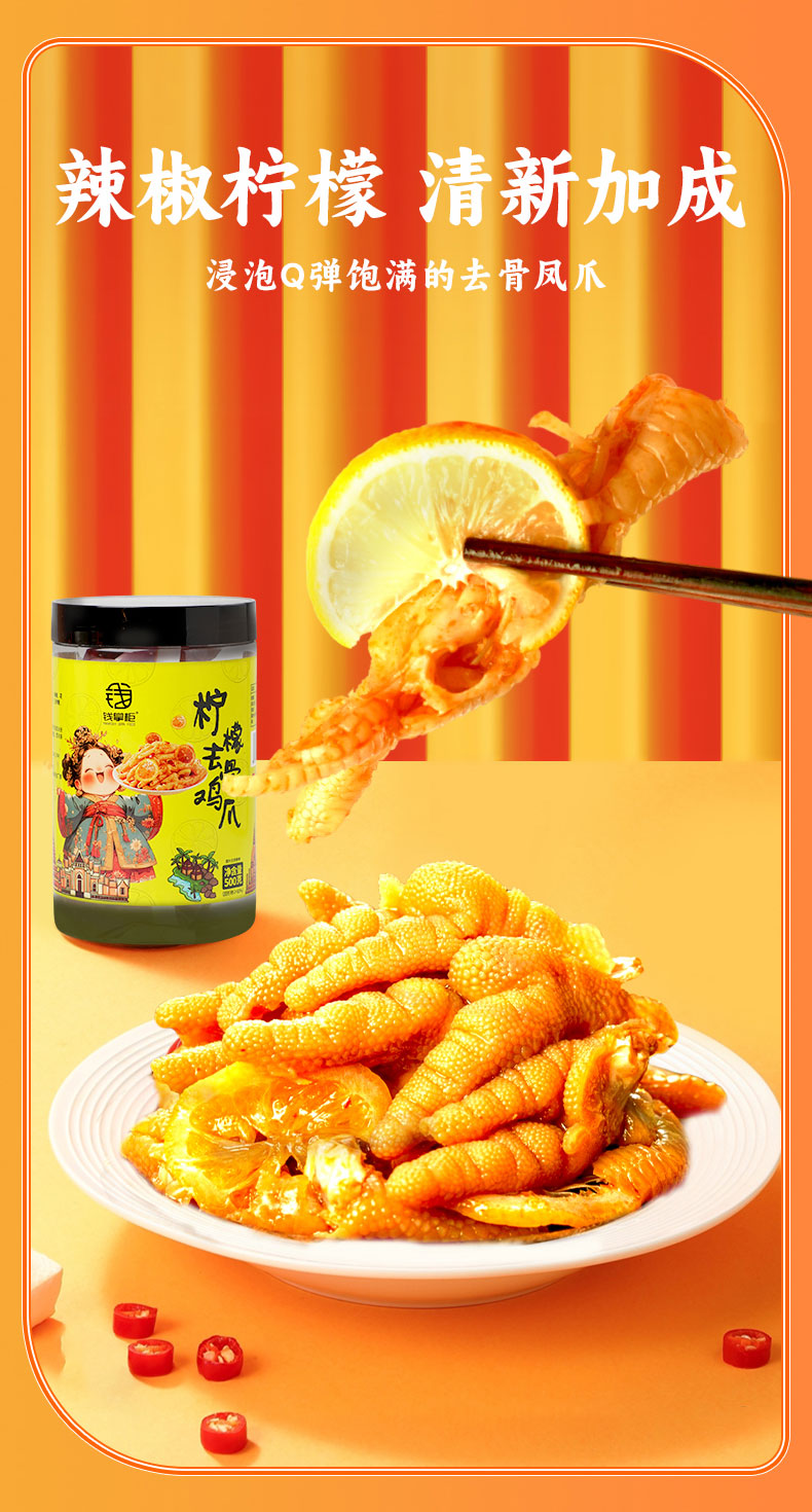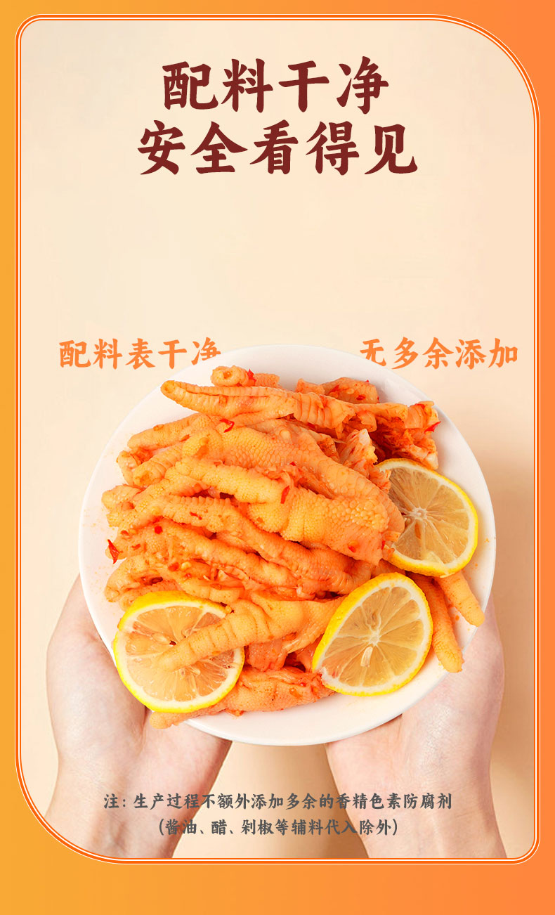 2、柠檬:鸡爪、饮用水、柠檬汁、辣椒、花椒、酿造食醋、酿造酱油、香辛料、白砂糖、鸡精调味料、味精、食用盐