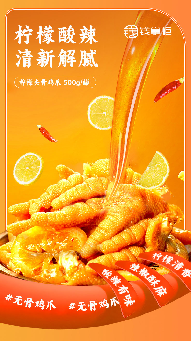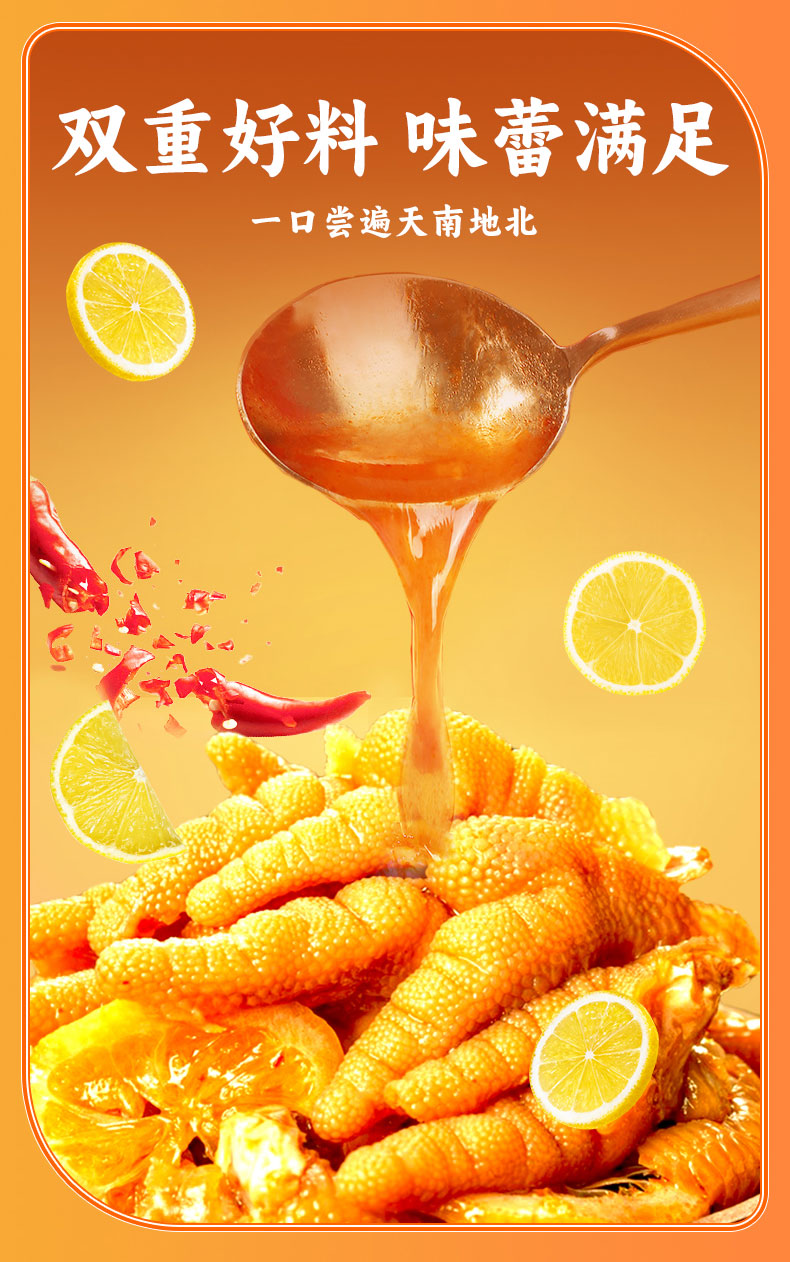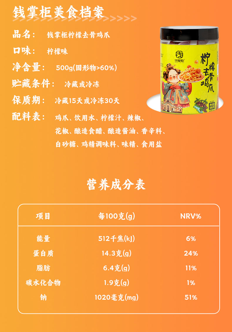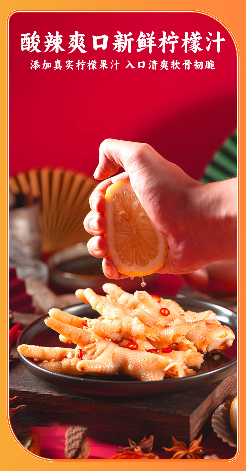 2、柠檬:鸡爪、饮用水、柠檬汁、辣椒、花椒、酿造食醋、酿造酱油、香辛料、白砂糖、鸡精调味料、味精、食用盐