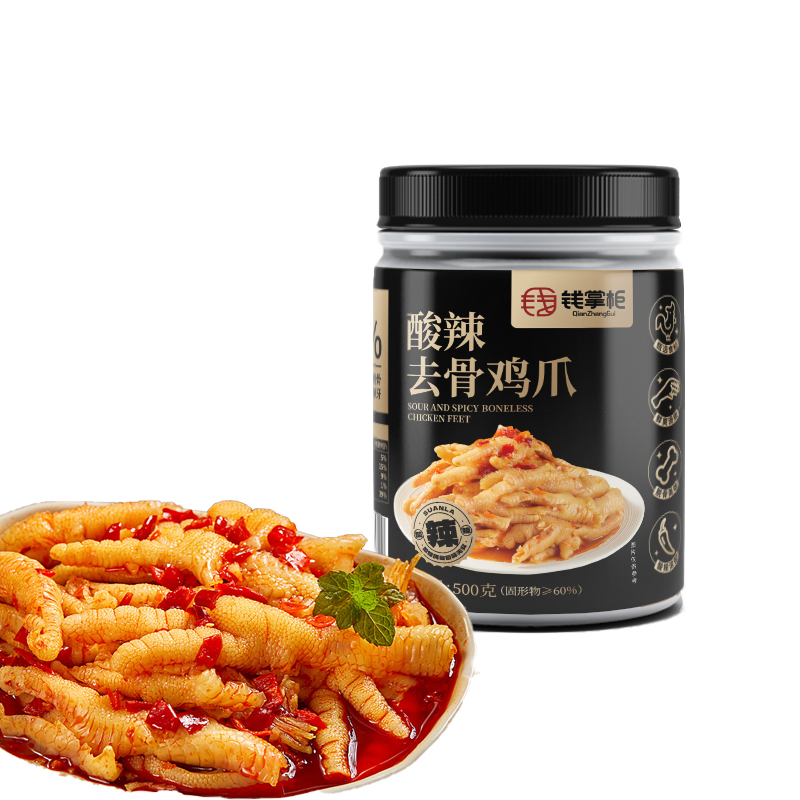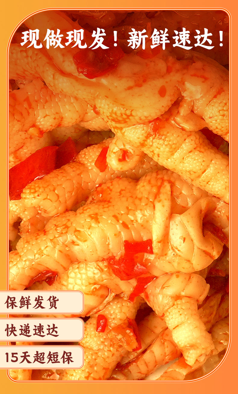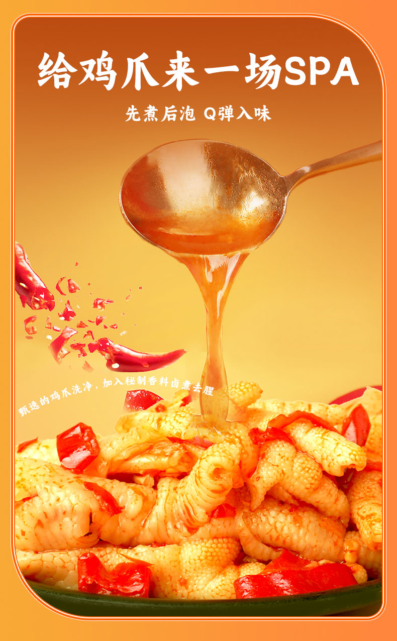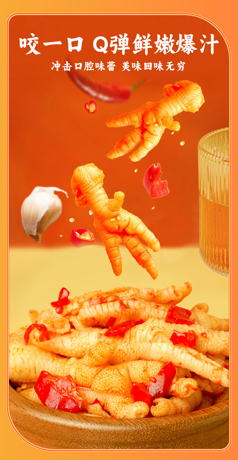 3、酸辣:鸡爪、饮用水、辣椒、辣椒油、芝麻油、酿造食醋、白砂糖、酿造酱油、复合调味料、味精、食用盐、香辛料