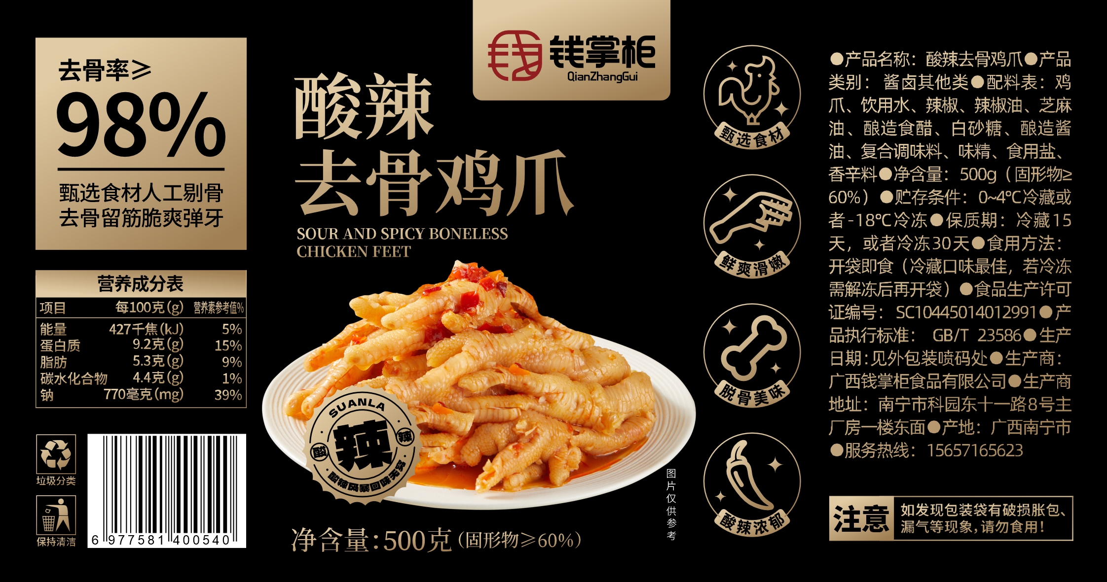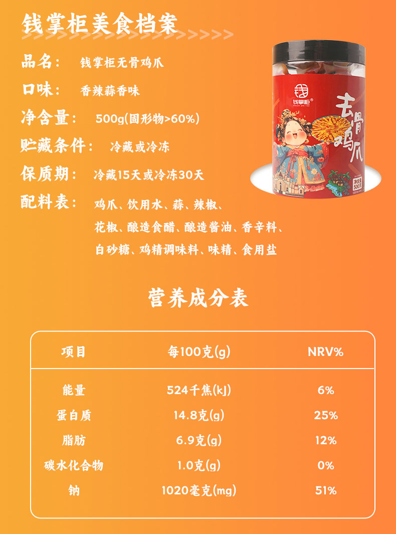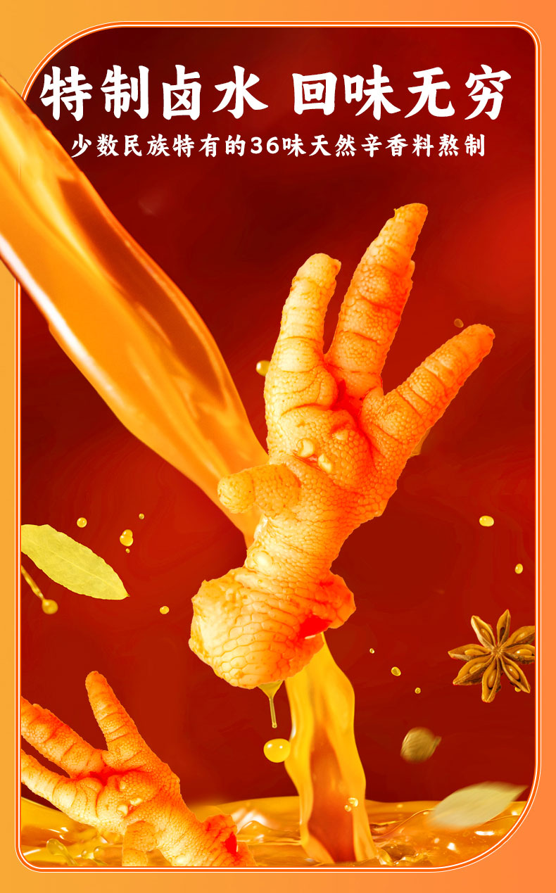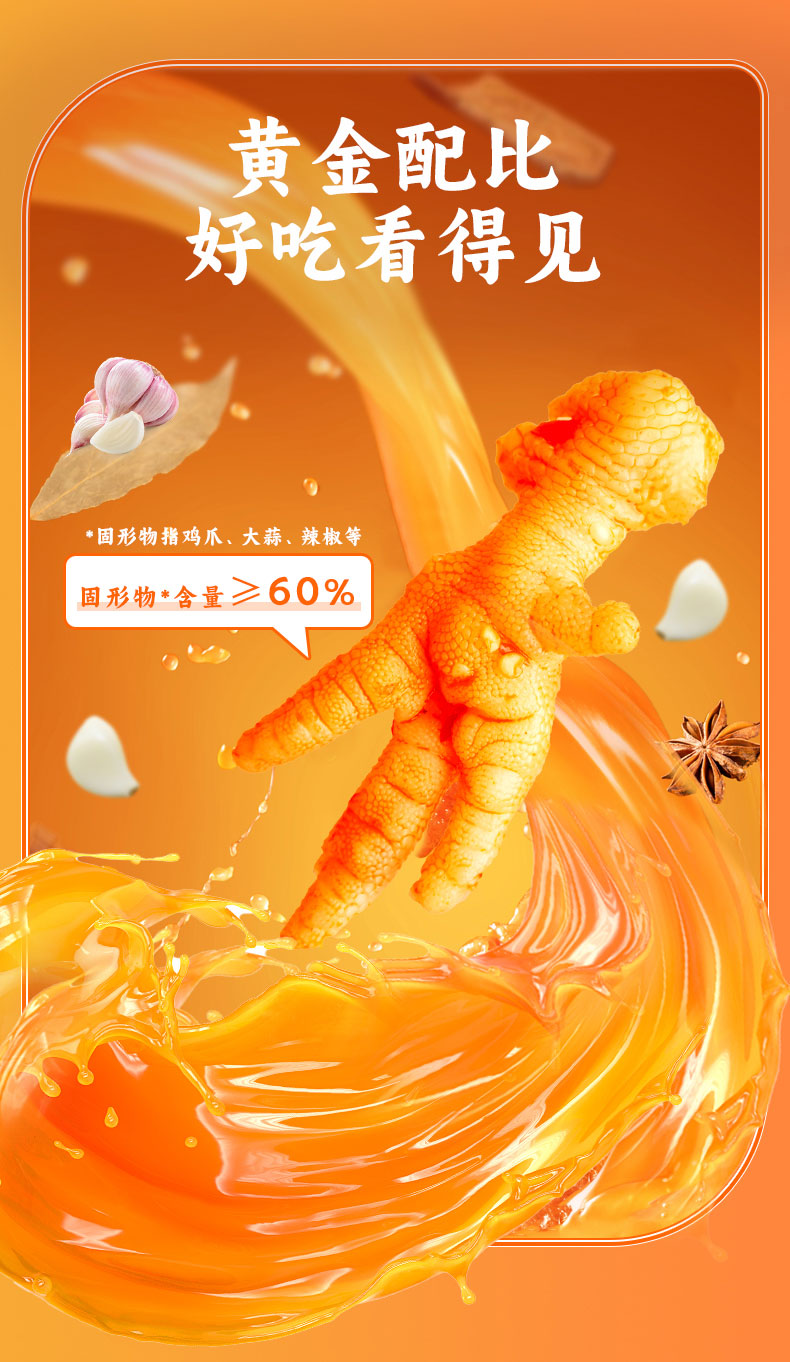 3、酸辣:鸡爪、饮用水、辣椒、辣椒油、芝麻油、酿造食醋、白砂糖、酿造酱油、复合调味料、味精、食用盐、香辛料