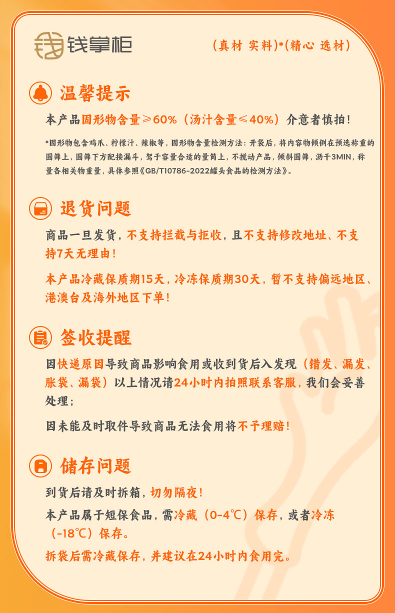 【注意事项】到货后请及时拆箱冷藏/冷冻,切勿隔夜!拆袋后需冷藏保存,并建议在24小时内食用完。