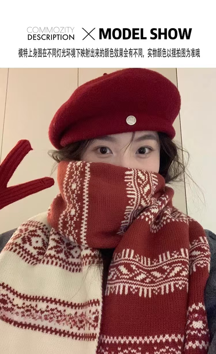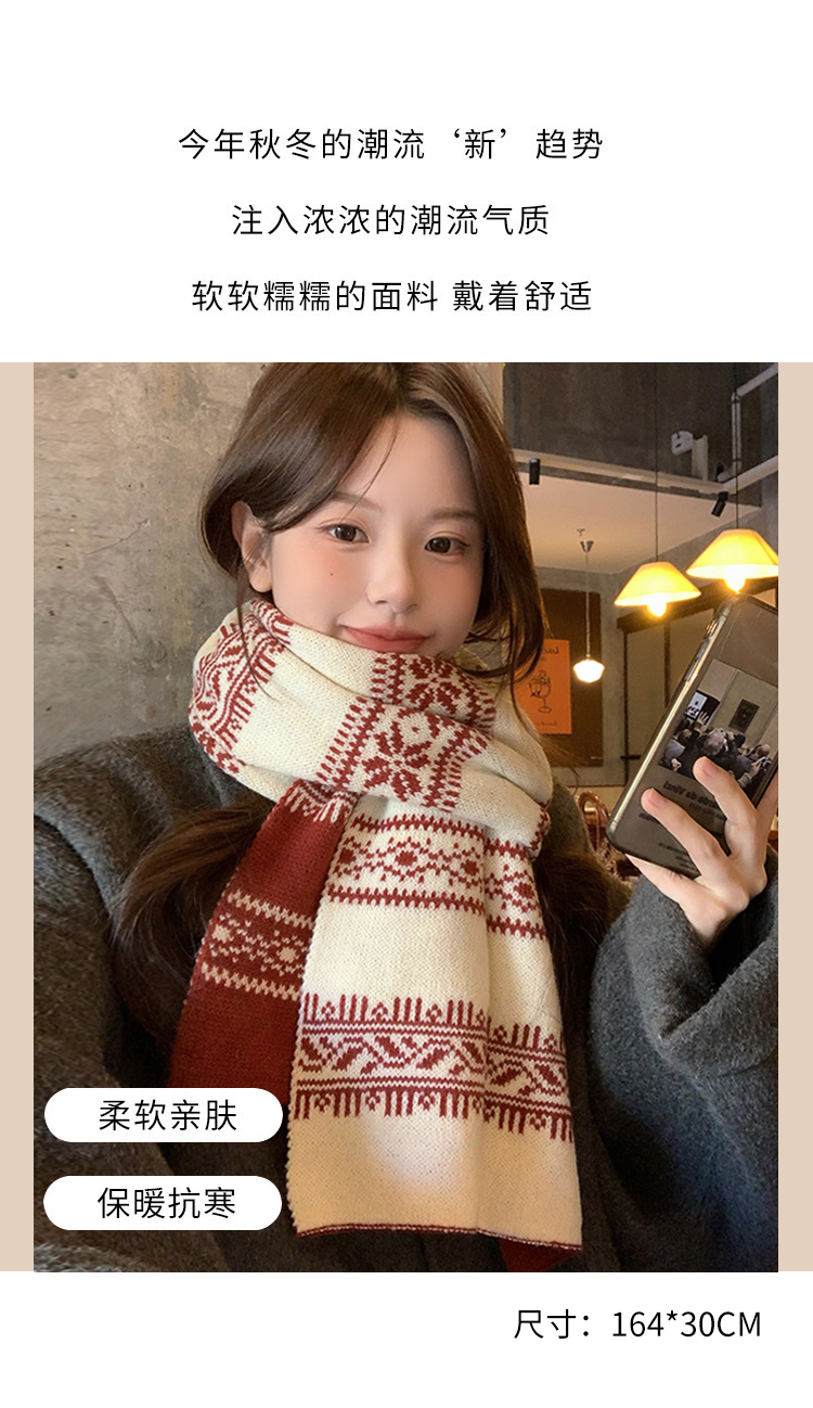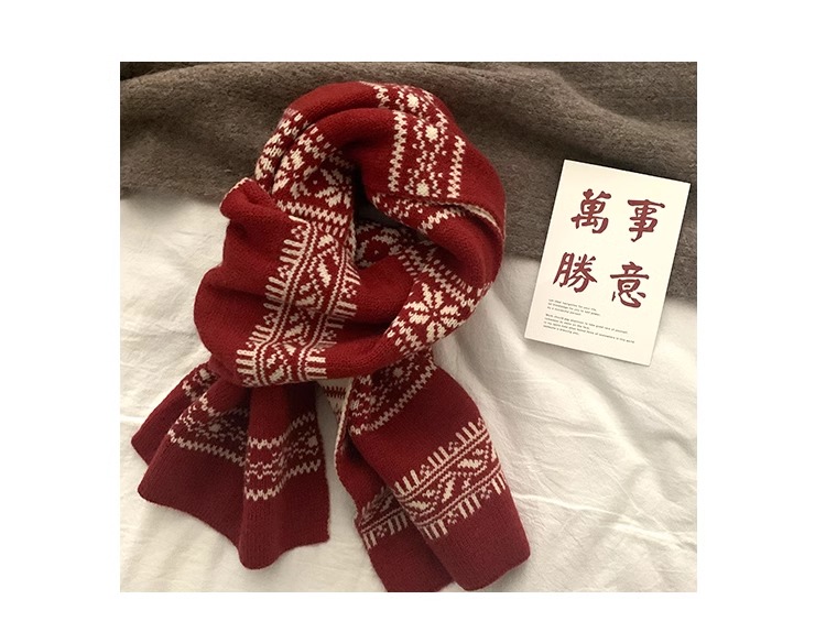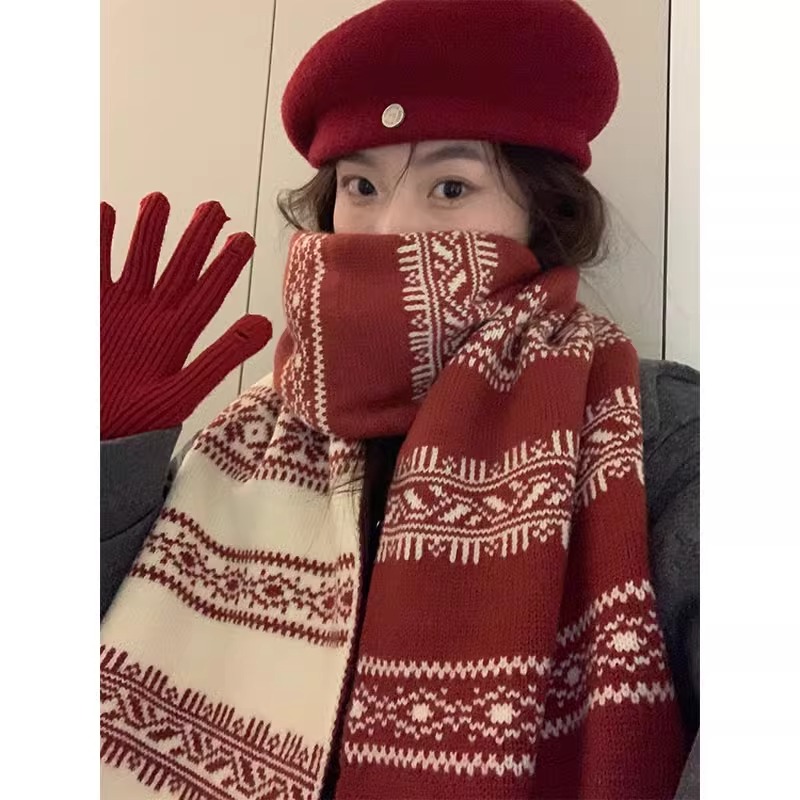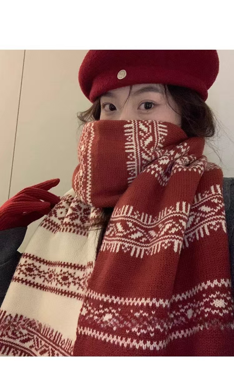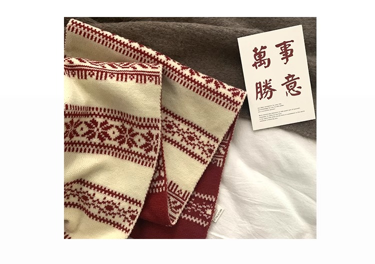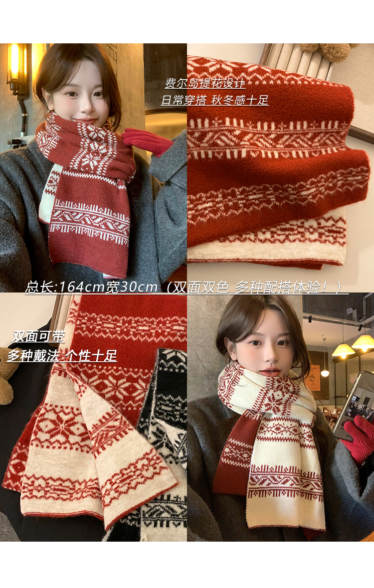 费尔岛风新年红双面针织羊绒围巾 女冬季氛围感百搭披肩保暖围脖
