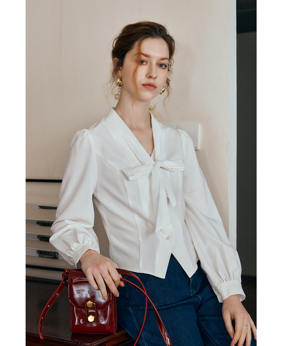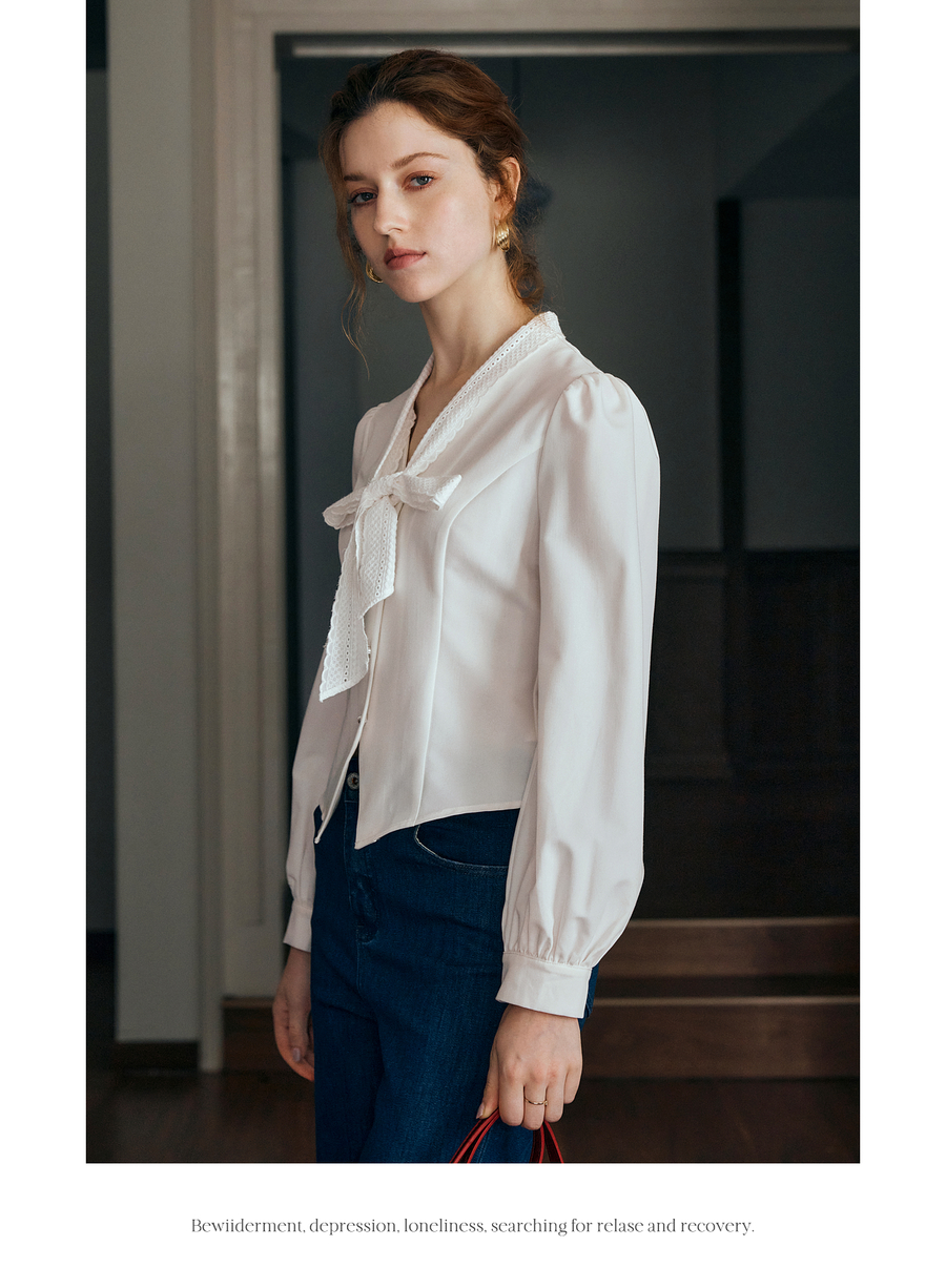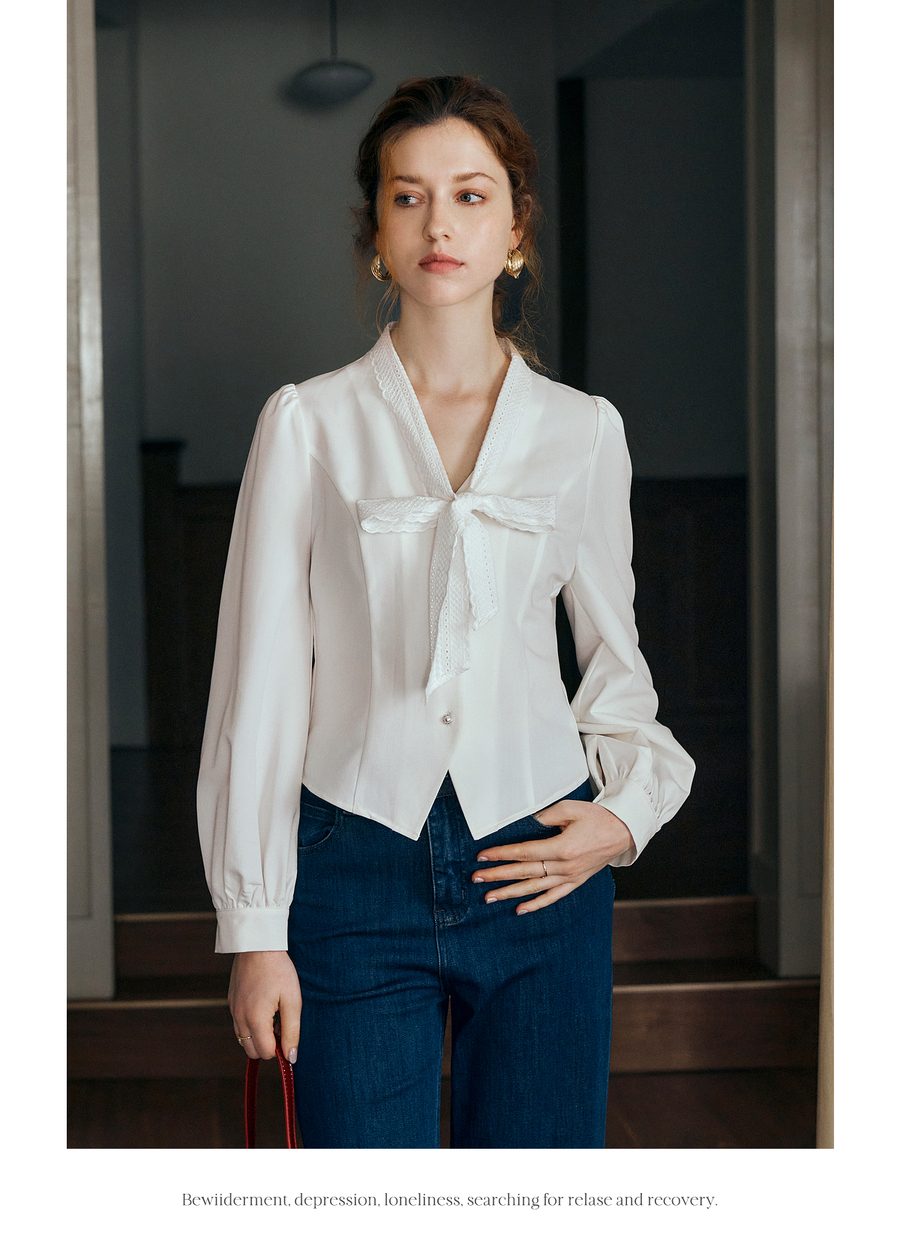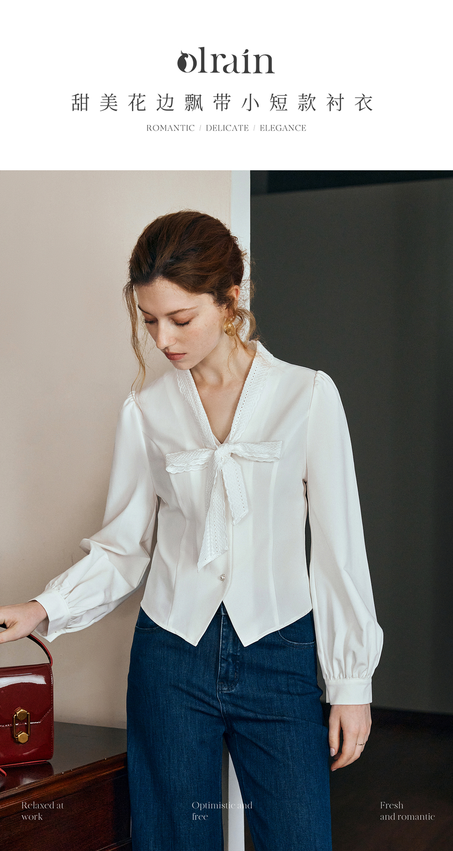 OLrain欧芮儿法式甜美短款衬衣女秋季2025新款花边飘带慵懒上衣