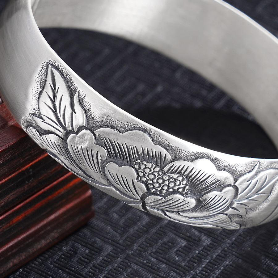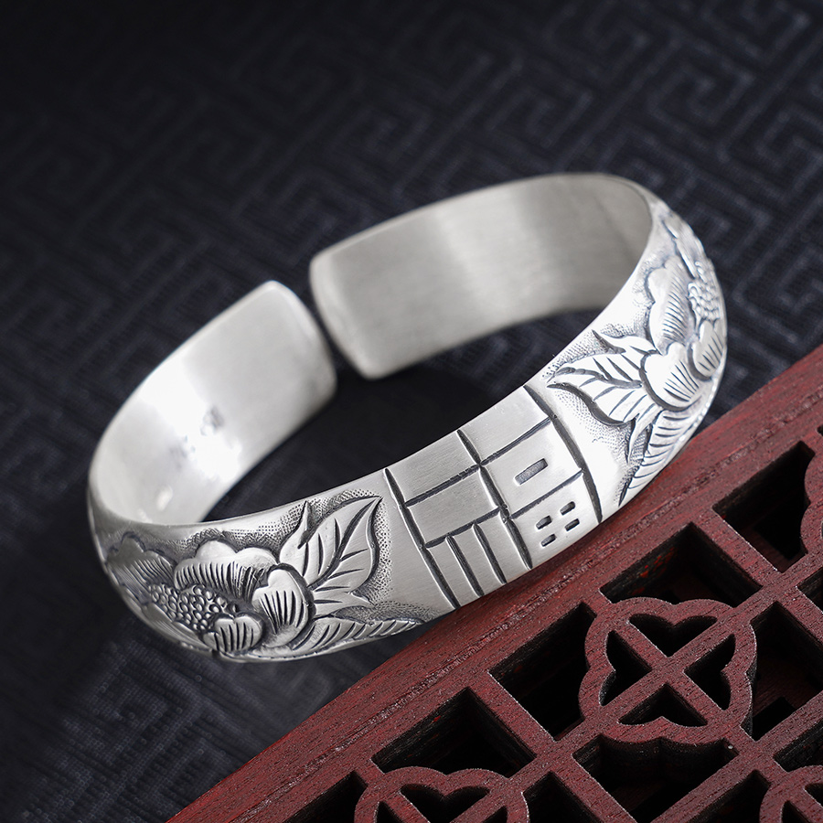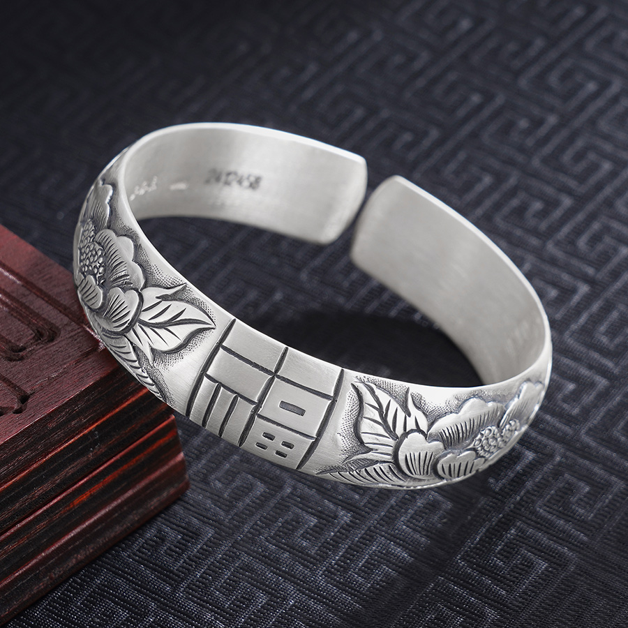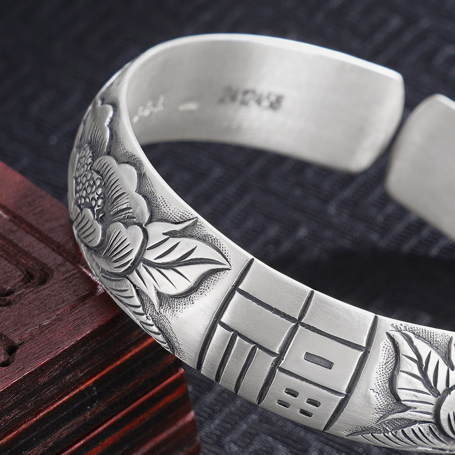 【寓意】:子佩集匠心手作银镯,采用成都金银器制作技艺,于镯体之上錾刻牡丹纹样,福字点缀设计,寓意花开富贵,幸福吉祥。