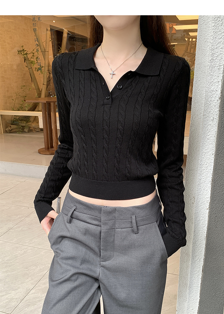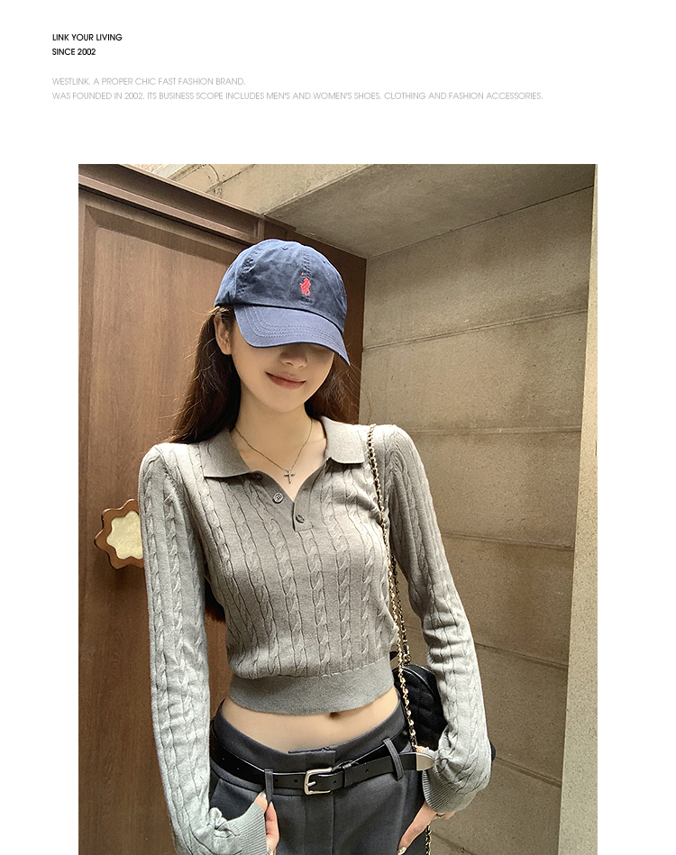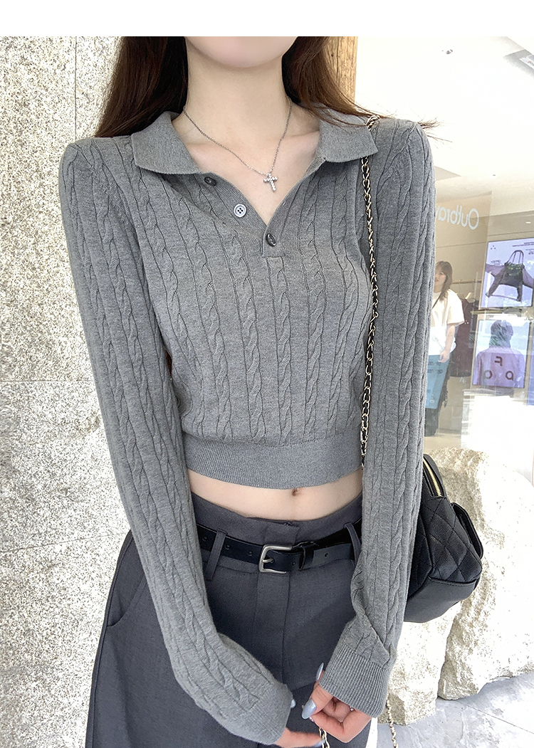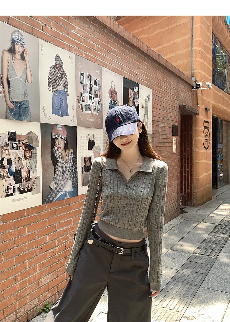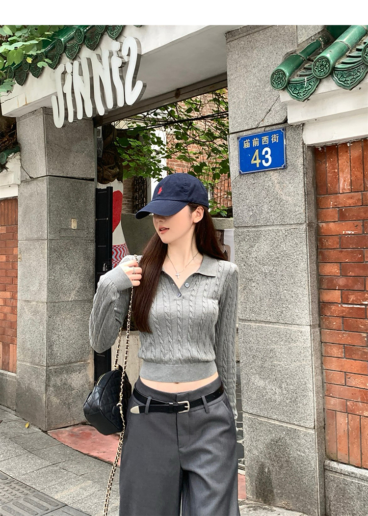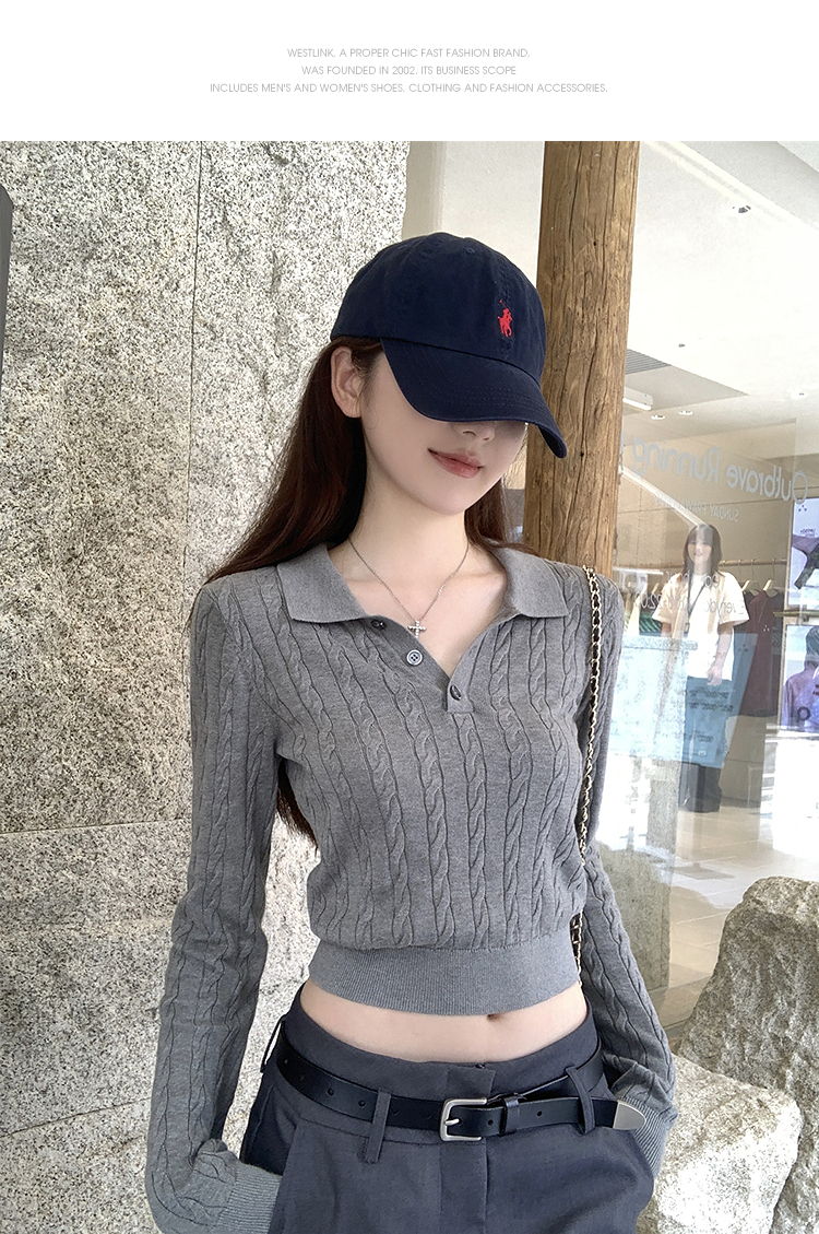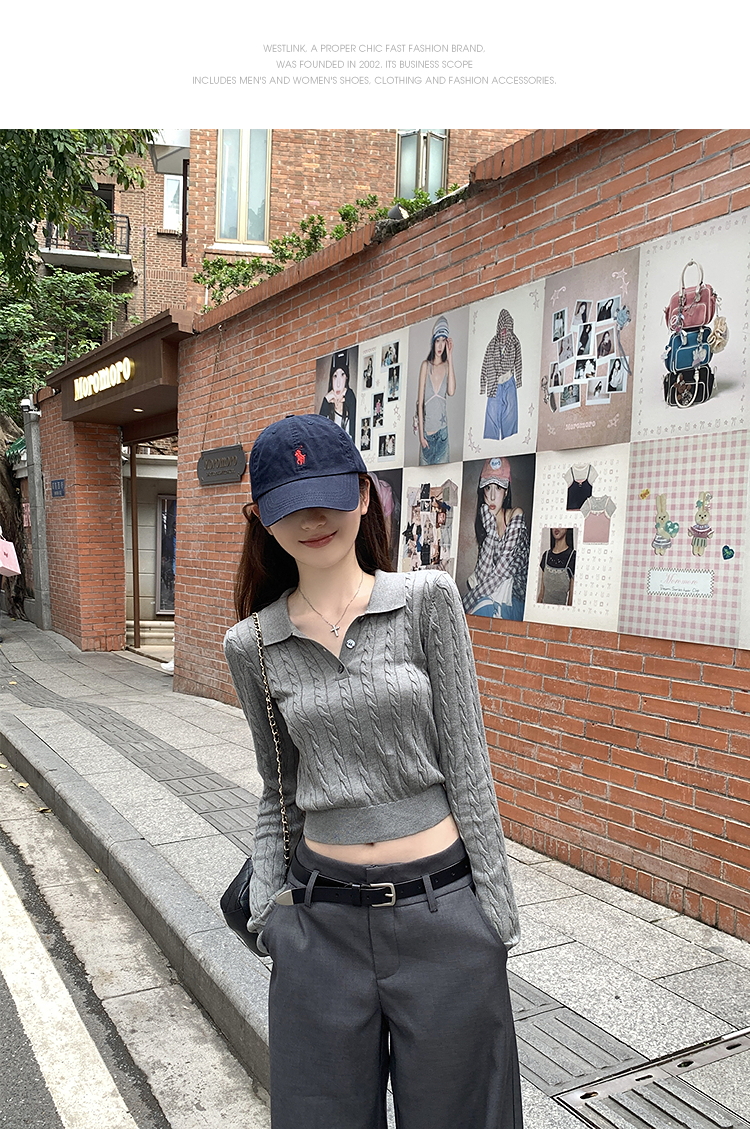 西遇修身长袖针织衫女2025年秋季新款复古麻花内搭灰色短款毛衣SS051503
