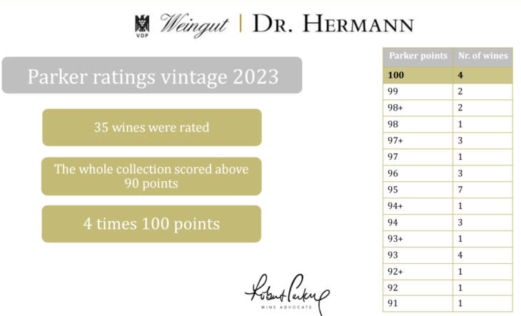 酒庄出产的酒款个性十足,多样性和品质都常年在线,从Kabinett到TBA各类型雷司令都有酿造。知名葡萄酒杂志Gault & Millau将其评为四串葡萄酒庄,Vinum葡萄酒杂志给予4.5颗星的高度评价,Wine Advocate已经给出7个满分(2023年份一年便拿下4个满分),摩泽尔权威杂志Mosel Fine Wines同样也给出7个满分,并赞美Dr Hermann酒庄精湛地诠释了雷司令优雅精致和纯净明亮的风格,在甜酒的酿造方面已经达到了“大师”水准。