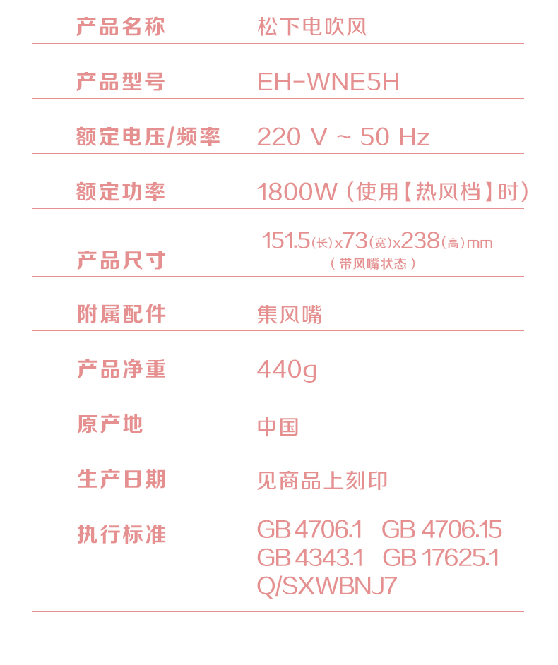 Panasonic/松下 电吹风EH-WNE5H 家用护发恒温负离子大功率速干[福利品]