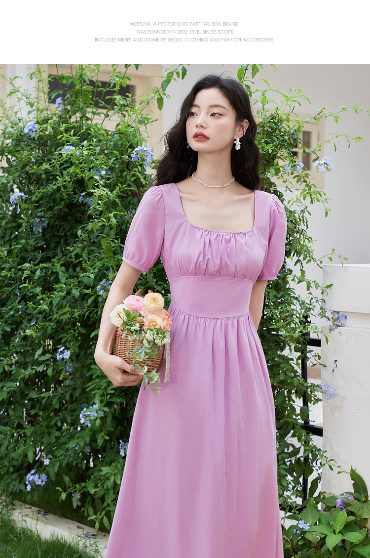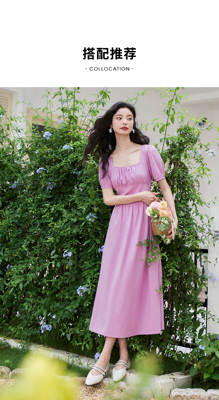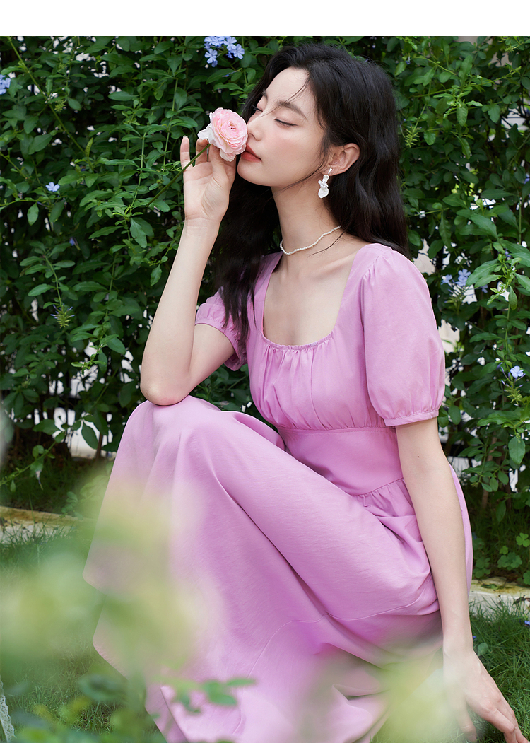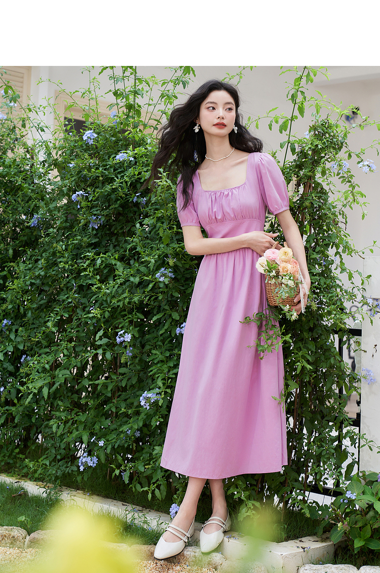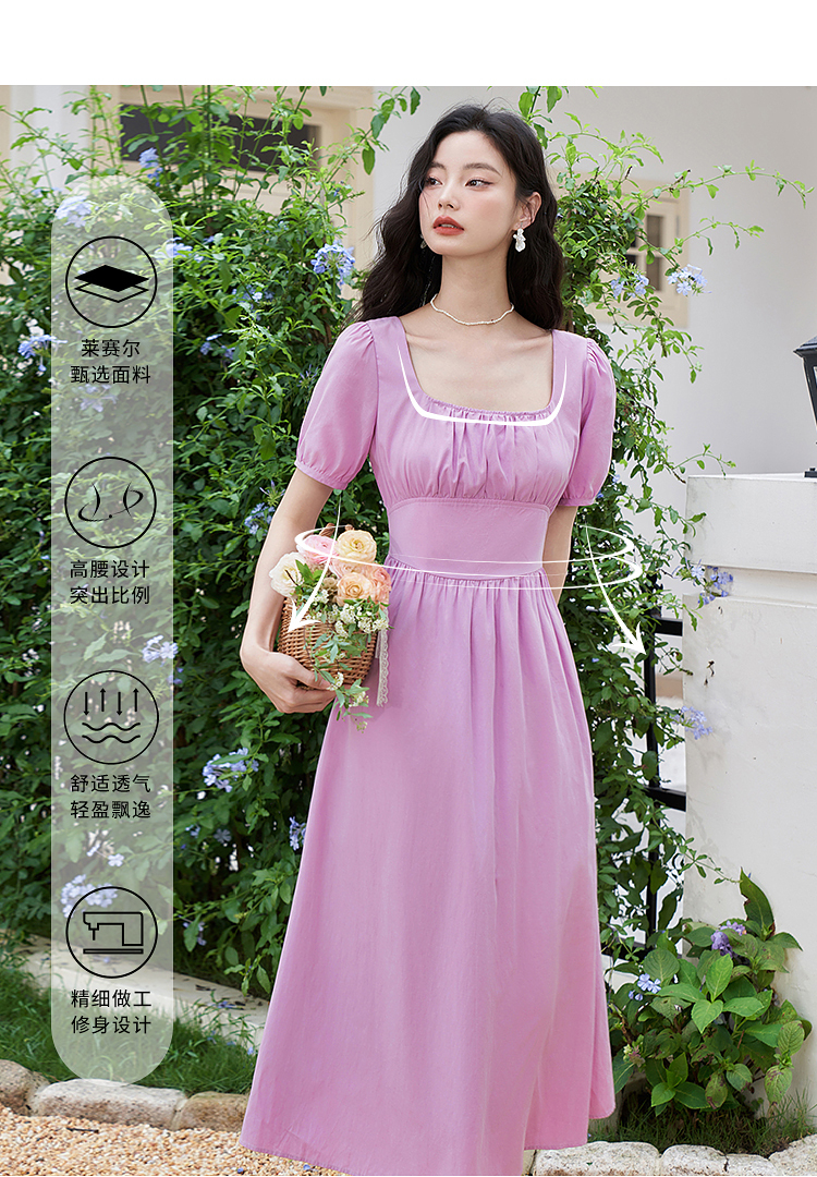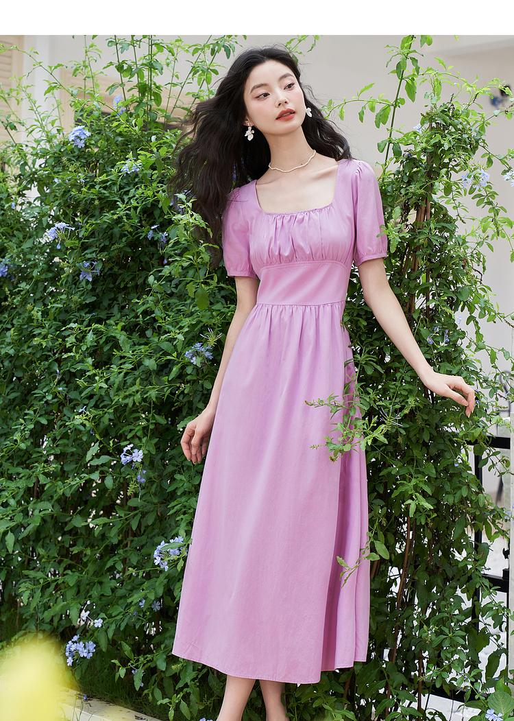 法式浪漫文艺泡泡袖连衣裙女夏季收腰方领短袖连衣裙V1241053