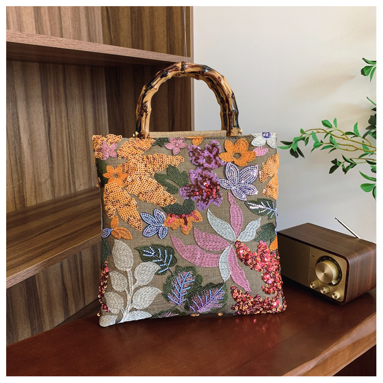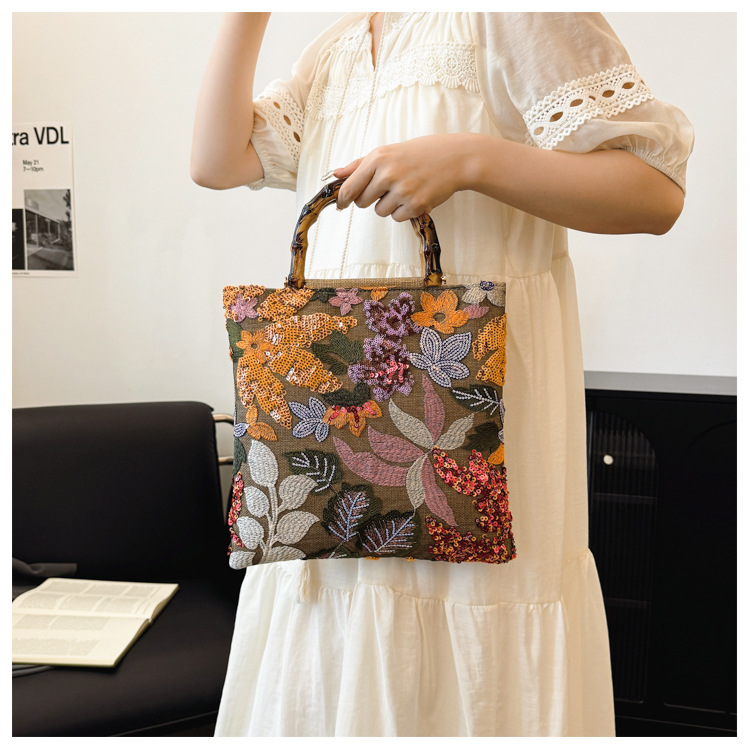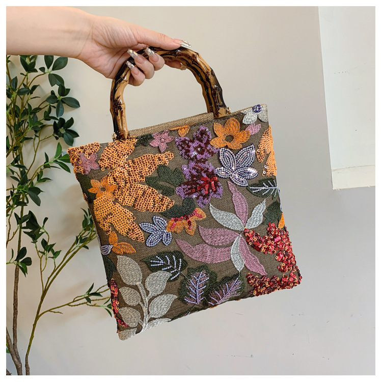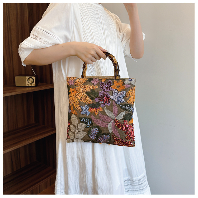 【刺绣复古竹节包】新款竹节手提包 高奢彩色亮片复古女士手拎包 重工刺绣潮晚宴包