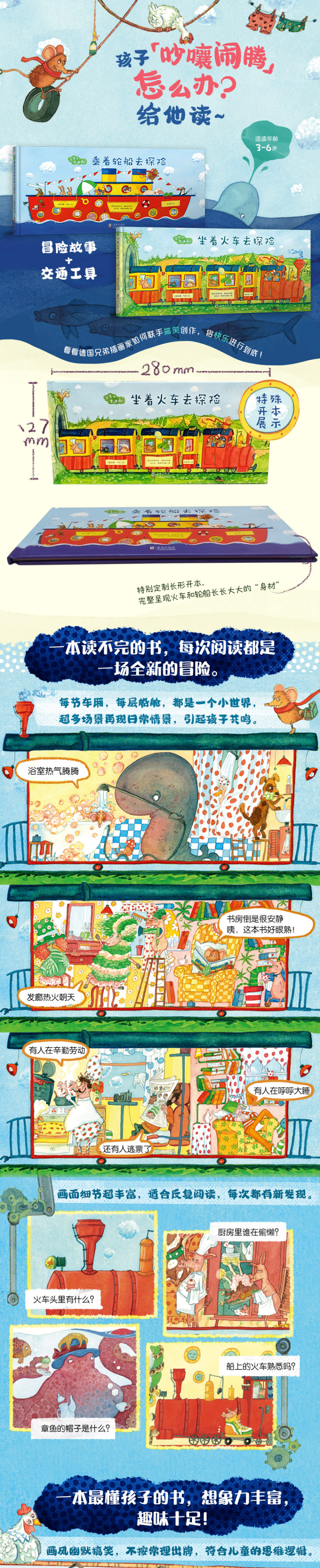 1.故事惊喜不断,每节车厢都是来自日常生活的一个场景,熟悉亲切有共鸣。在接连不断的场景变化里,小老鼠费迪南从火车车头走到车尾,从轮船下一层爬到顶层,在一路寻找的过程中,经历了一系列充满想象的好玩冒险。