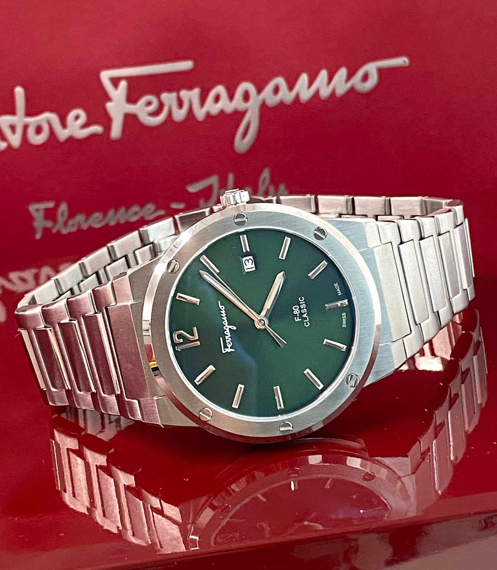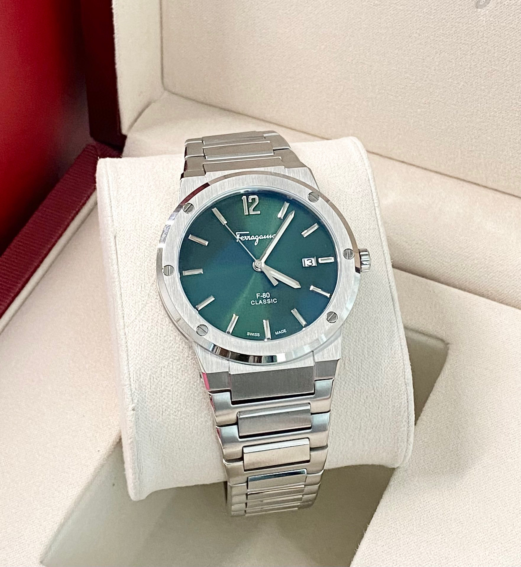 菲拉格慕F80 石英男表,瑞士机芯,表径41mm,防炫目蓝宝石镜面(反光见蓝色),316L不锈钢拉丝表壳 表带 防水50m,现货好价出