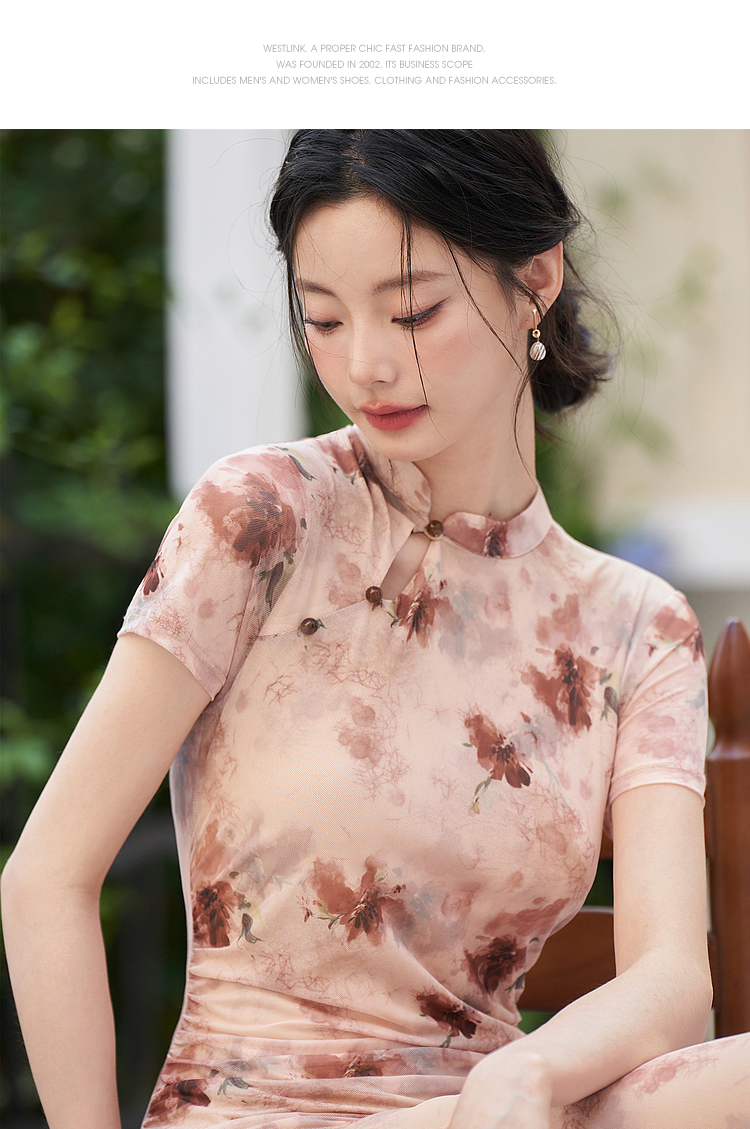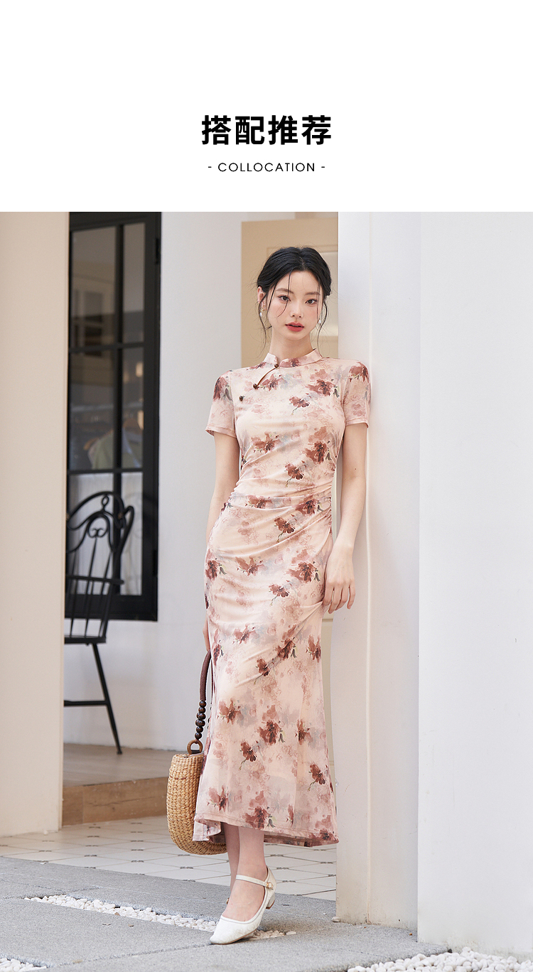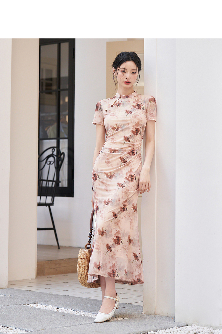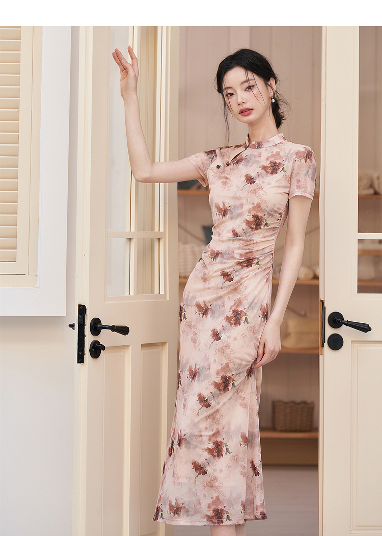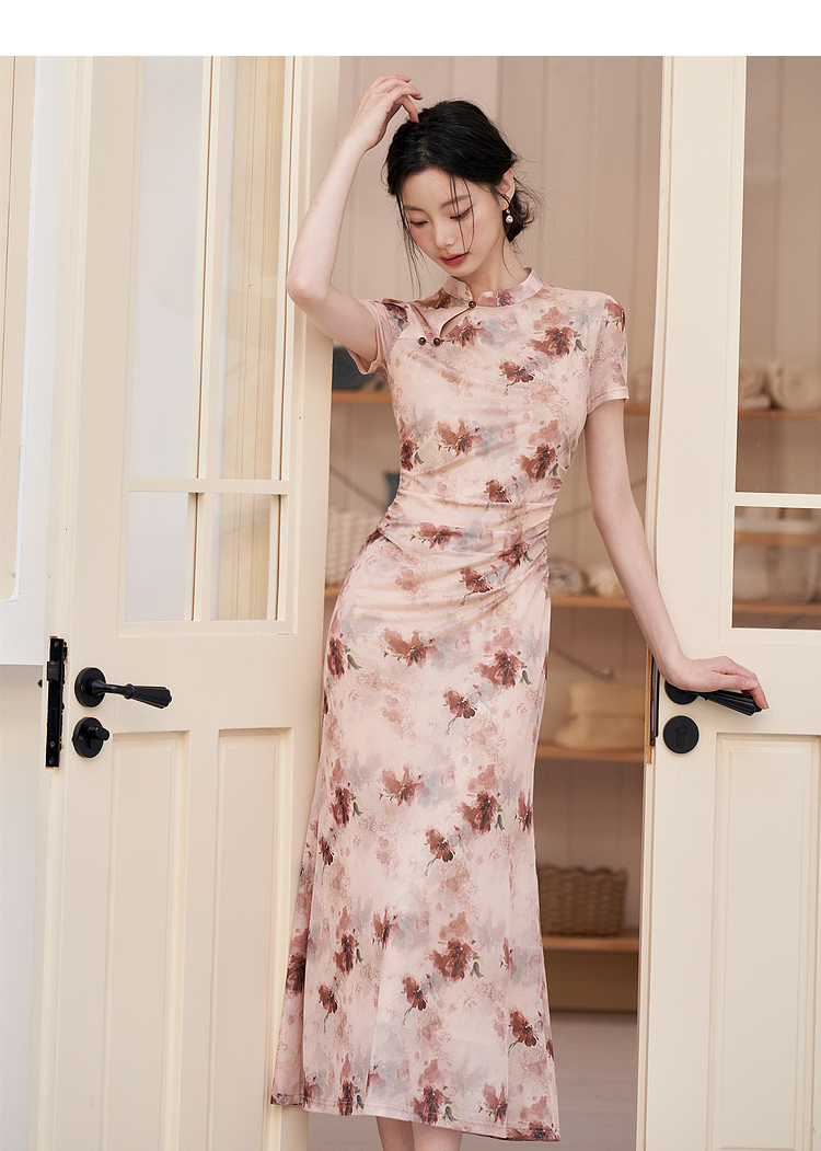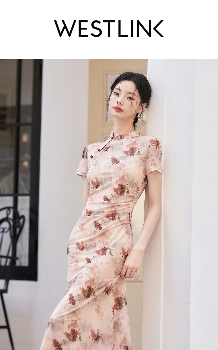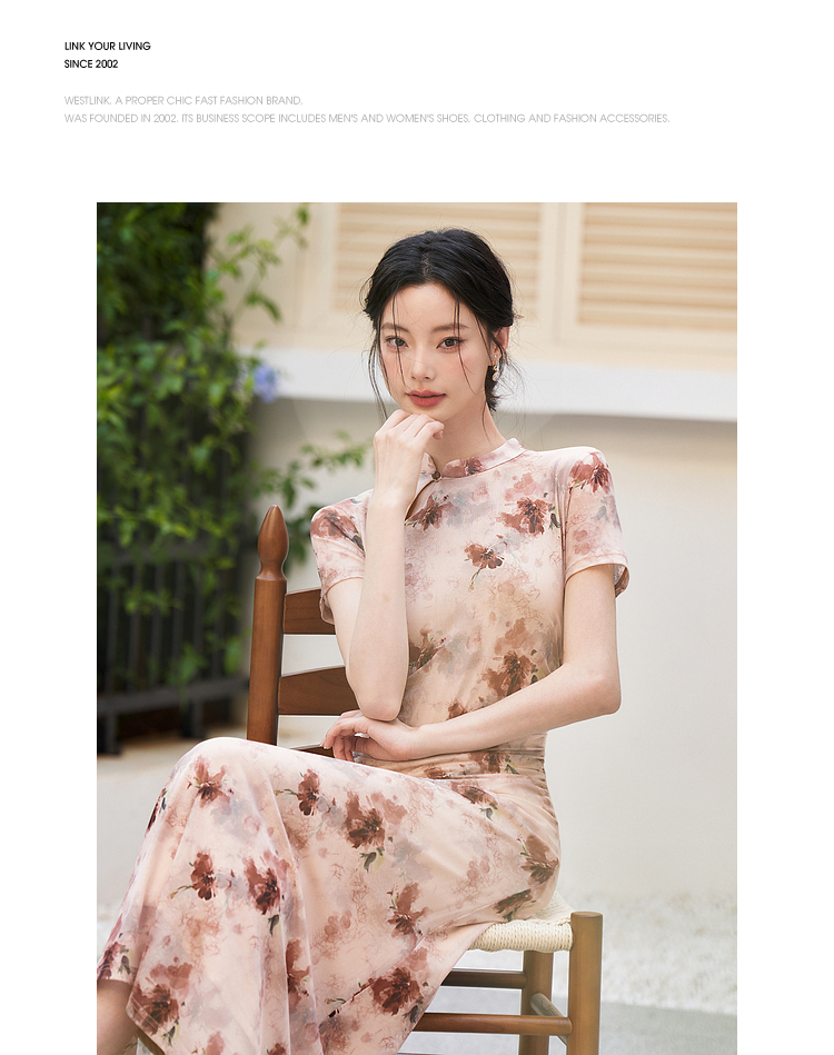 【限时秒杀】新中式国风旗袍领连衣裙女新款精致印花A摆针织裙V0050531