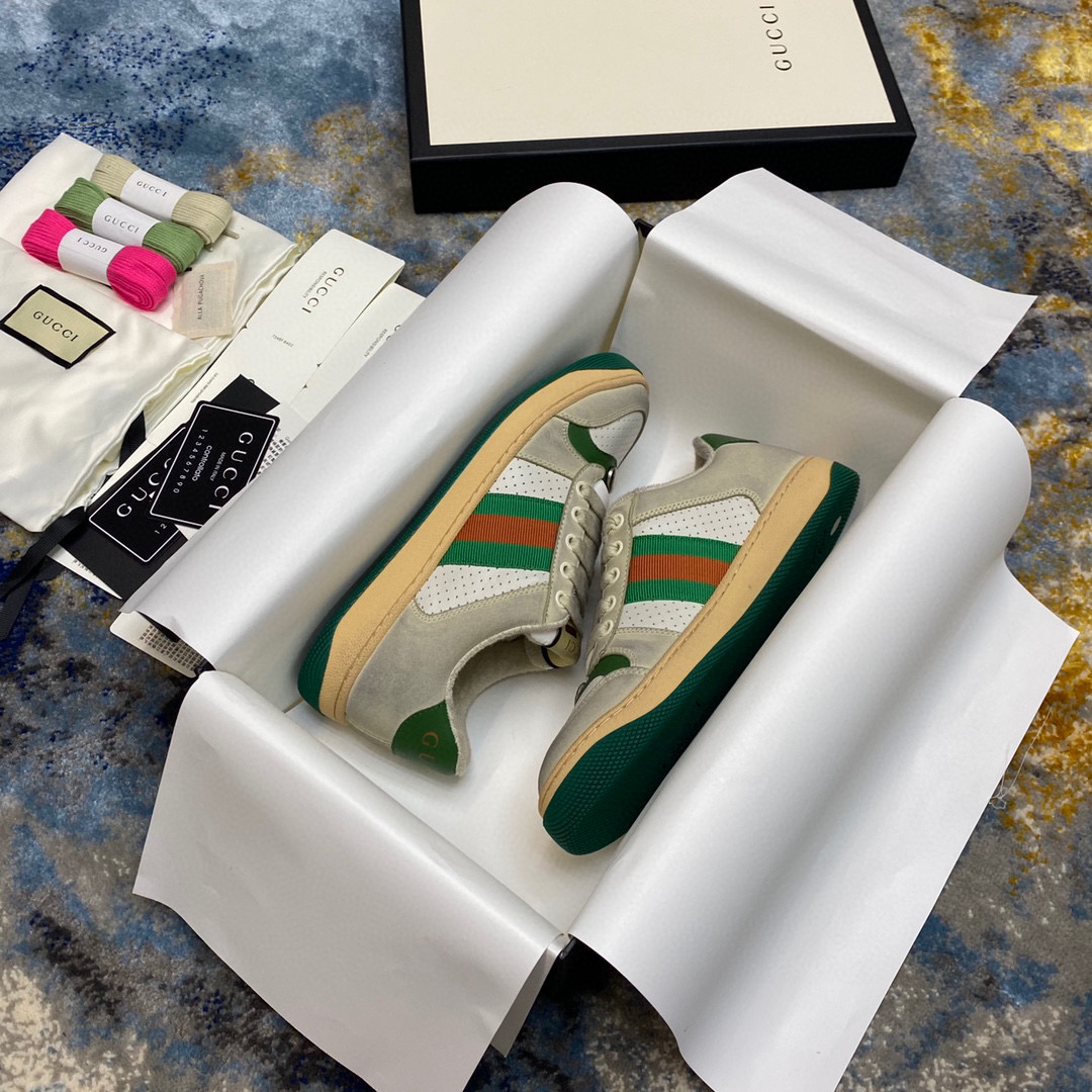 鞋面擦色牛皮拼接经典双G布面料,皮面切口全油边封口工艺,原版毛巾布里细腻柔软更舒适透气,垫脚乳胶注塑一体,私模钢印双色原版TPU大底(下层宽,上层窄)