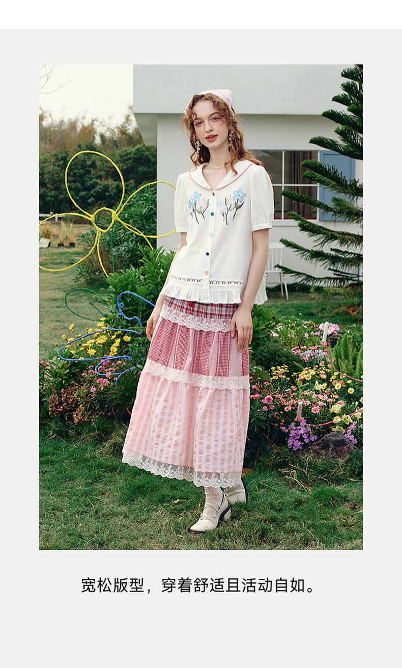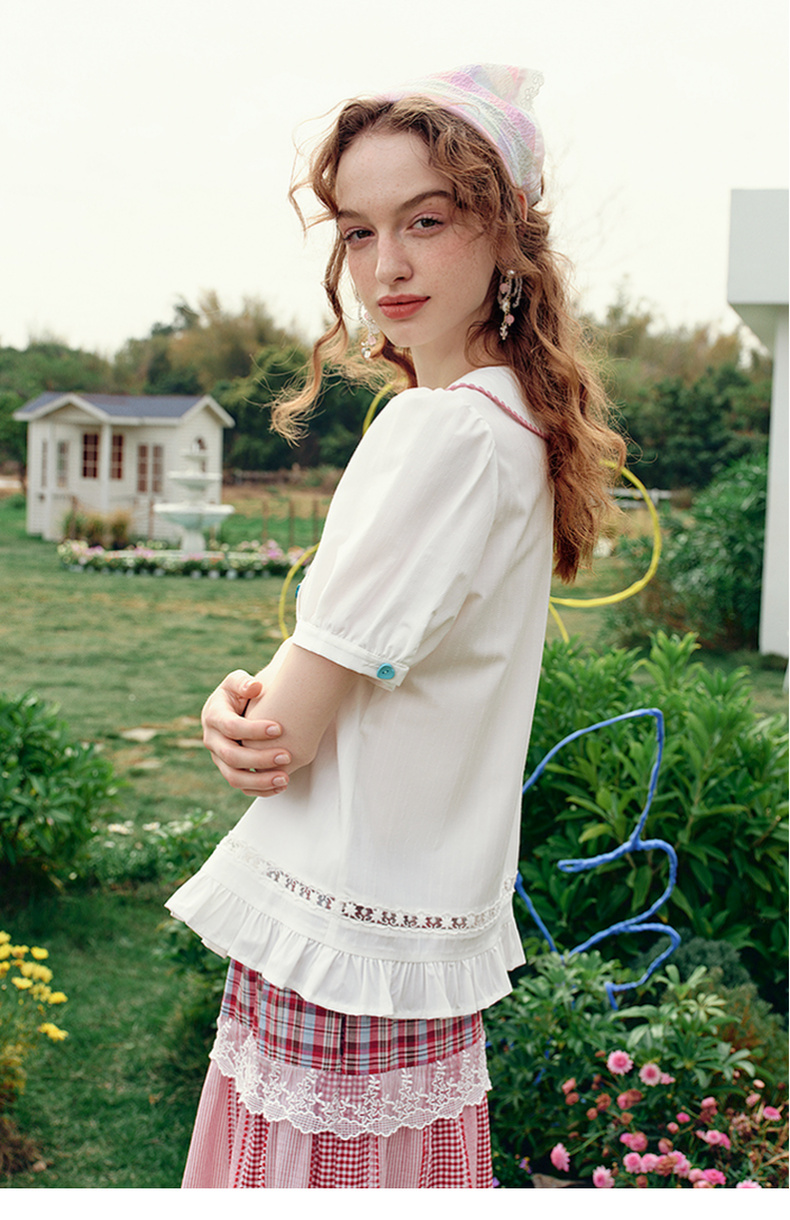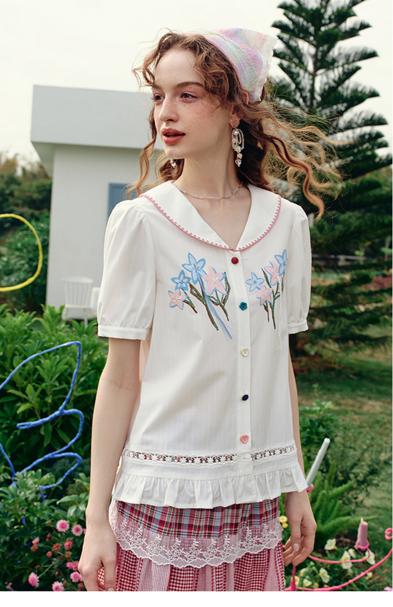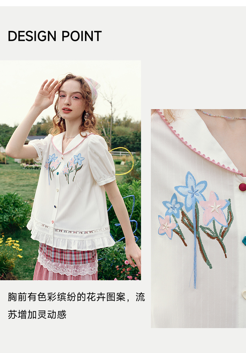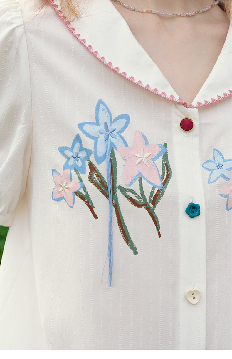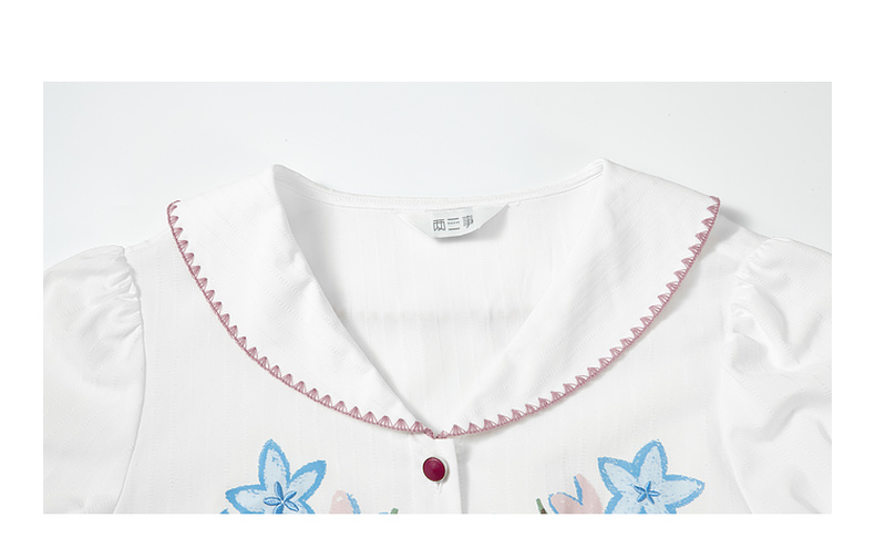 两三事采花朝露2025夏新款小清新流苏印花荷叶边下摆娃娃领衬衫女
