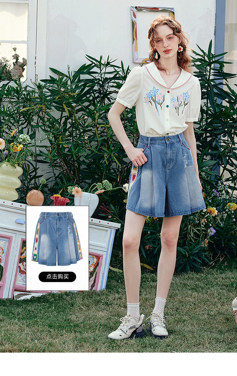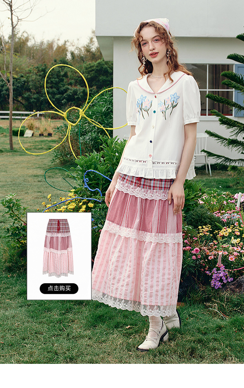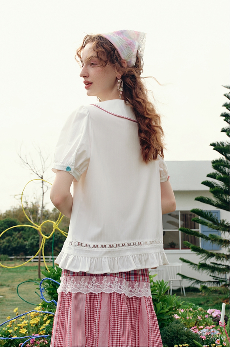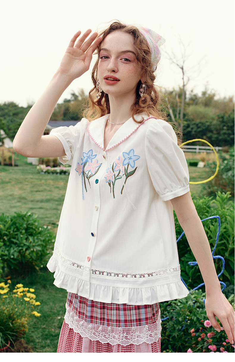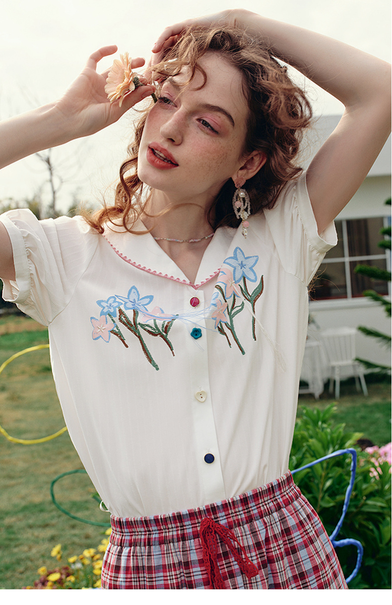 两三事采花朝露2025夏新款小清新流苏印花荷叶边下摆娃娃领衬衫女