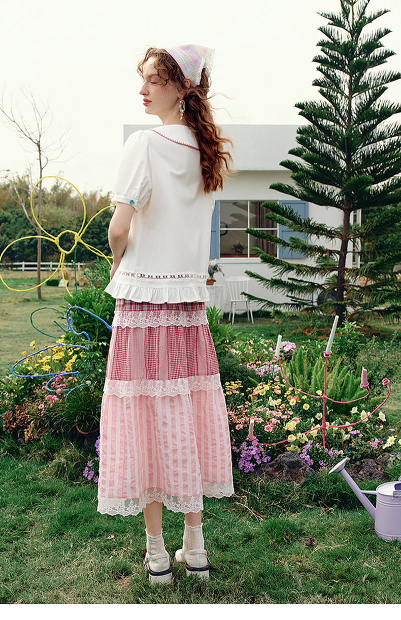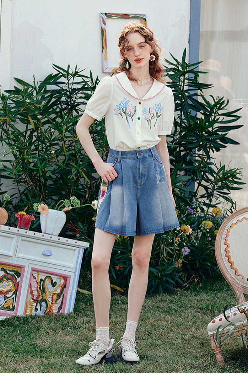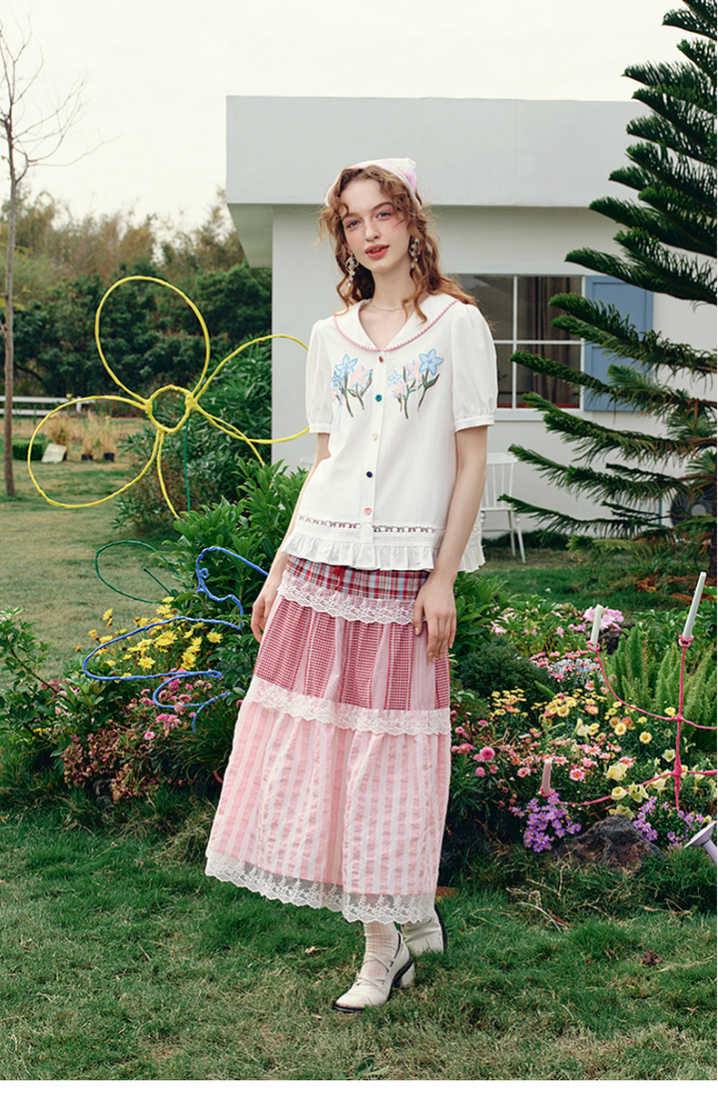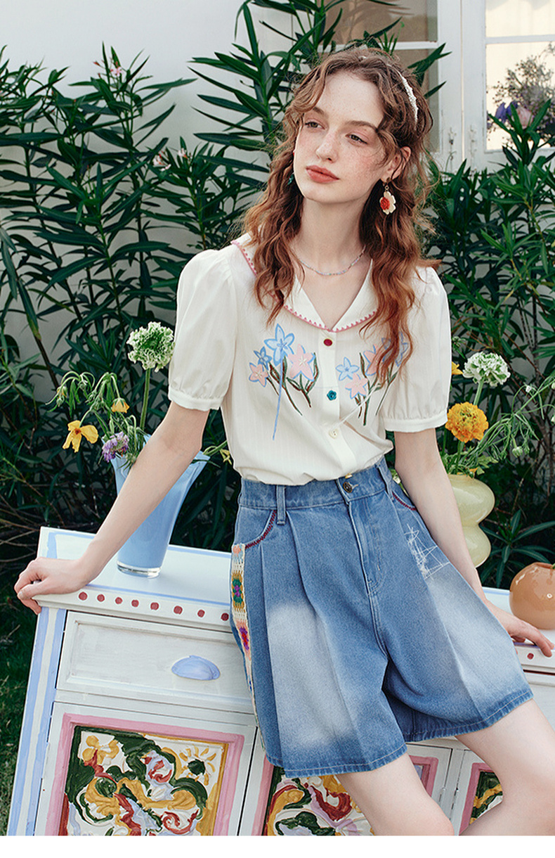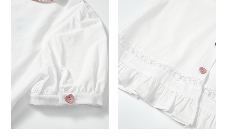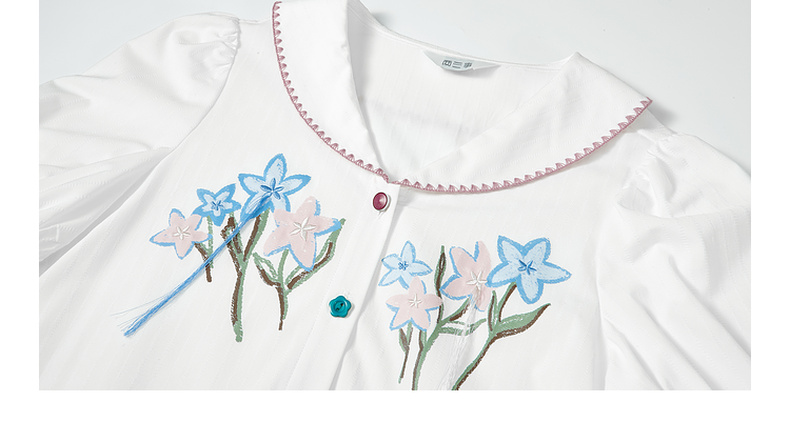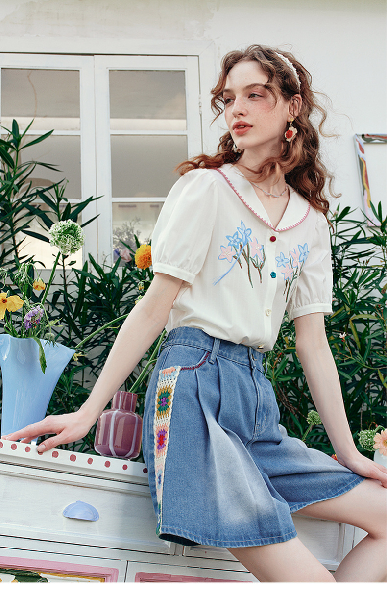 两三事采花朝露2025夏新款小清新流苏印花荷叶边下摆娃娃领衬衫女