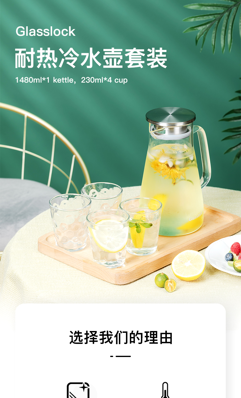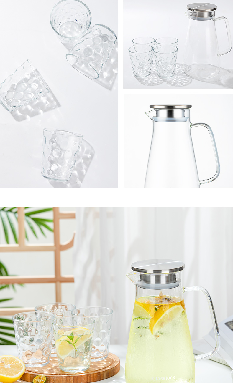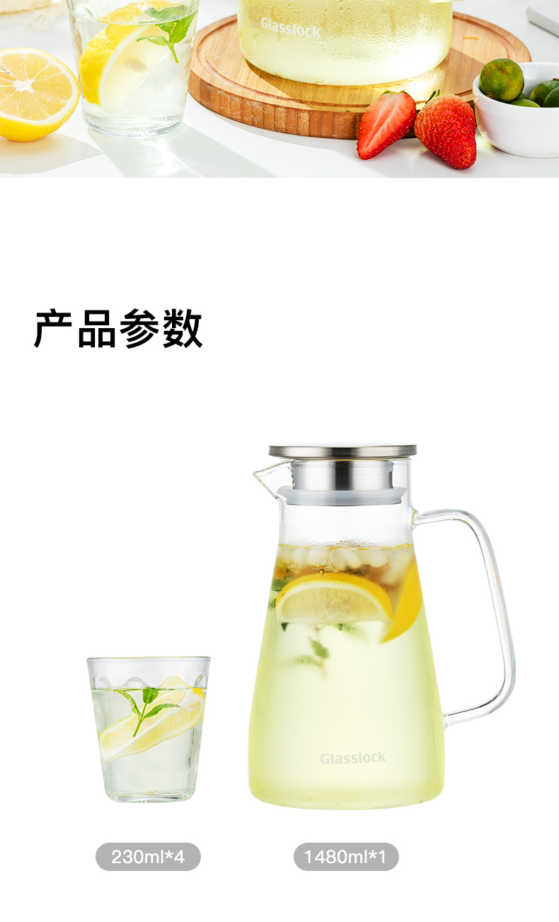 【清仓特惠6折,仅2套,无货退款】韩国Glasslock耐高温玻璃冷水壶家用冰箱大容量凉水杯凉开水壶 水具组(一壶四杯)