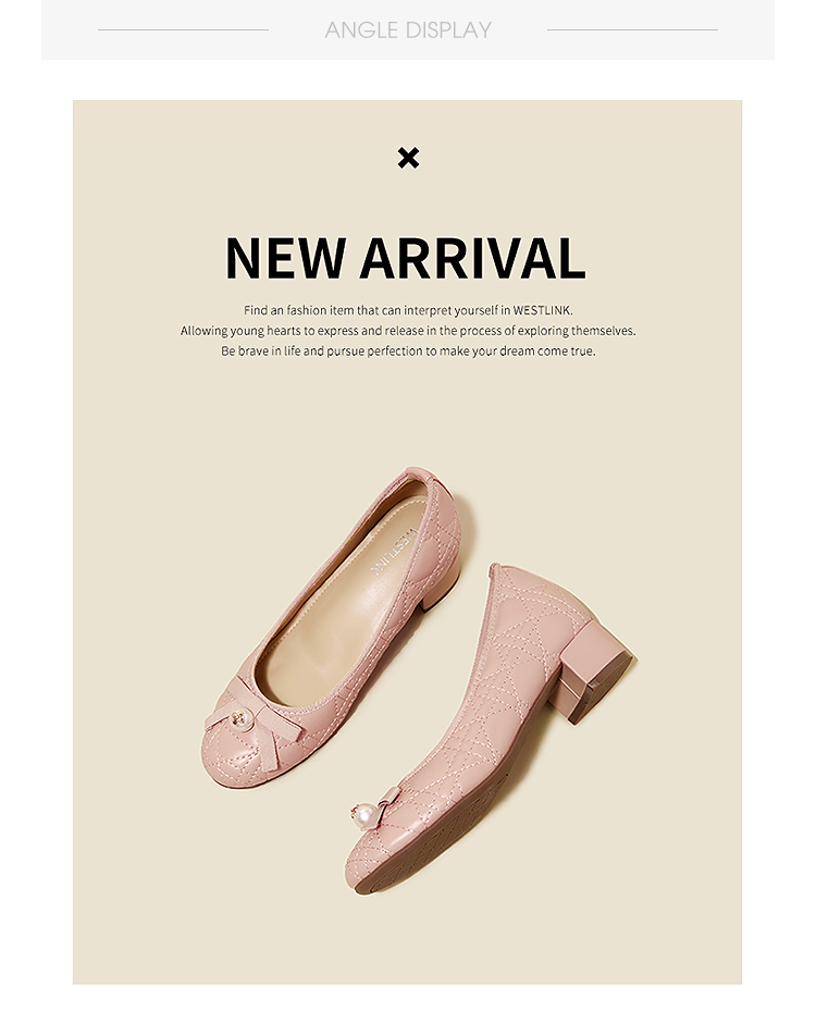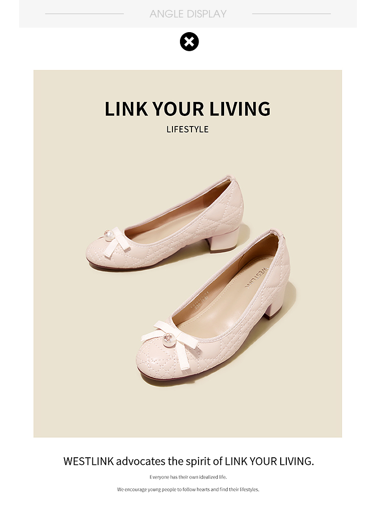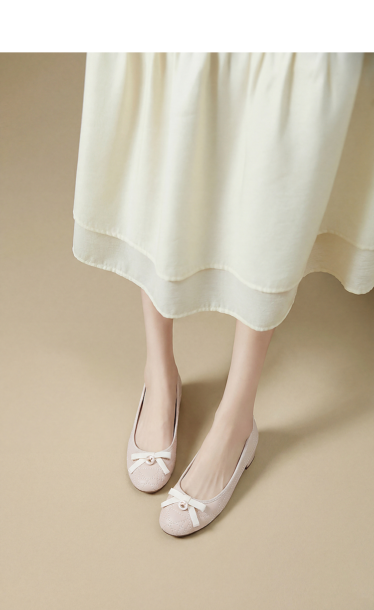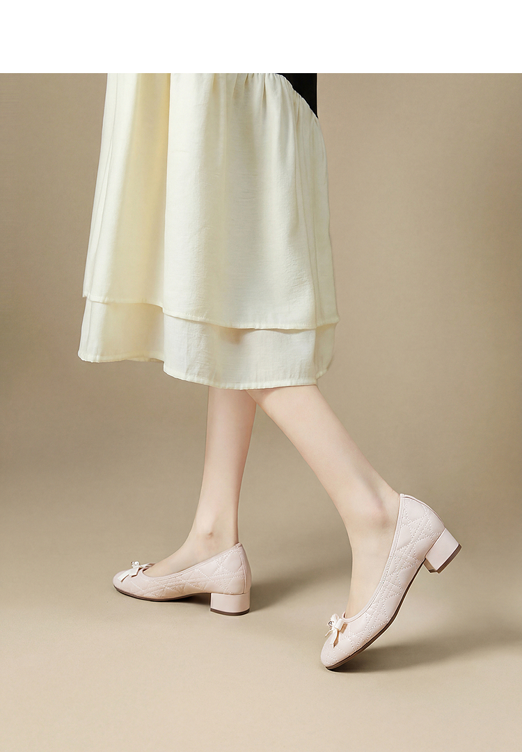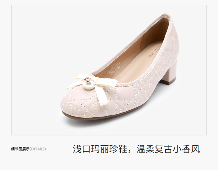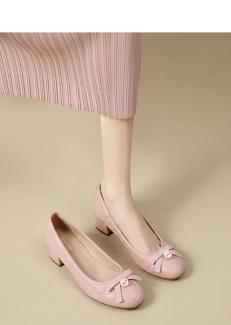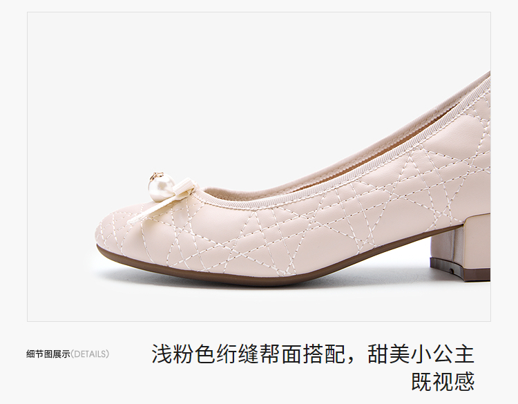 西遇浅口单鞋女鞋2026春季新款粗跟粉色蝴蝶结小香风高跟鞋V0166281