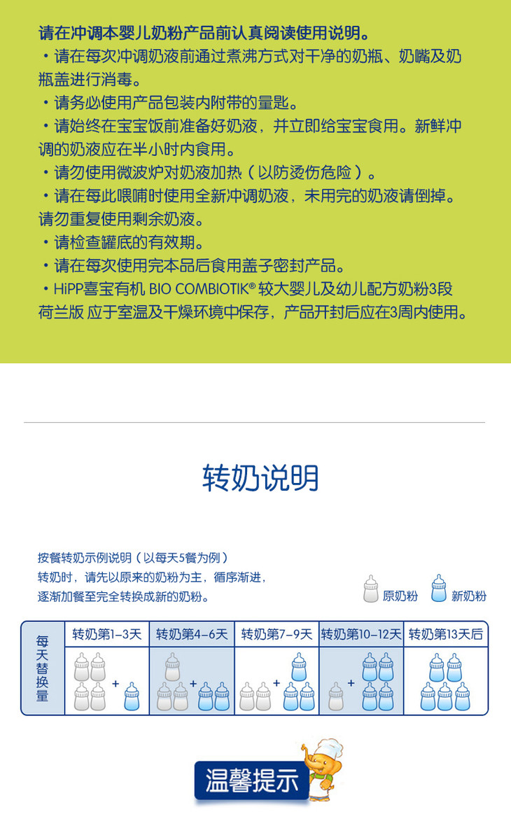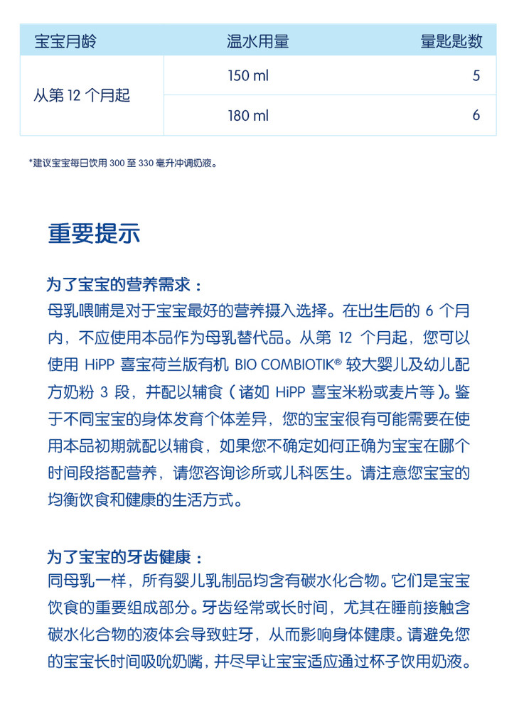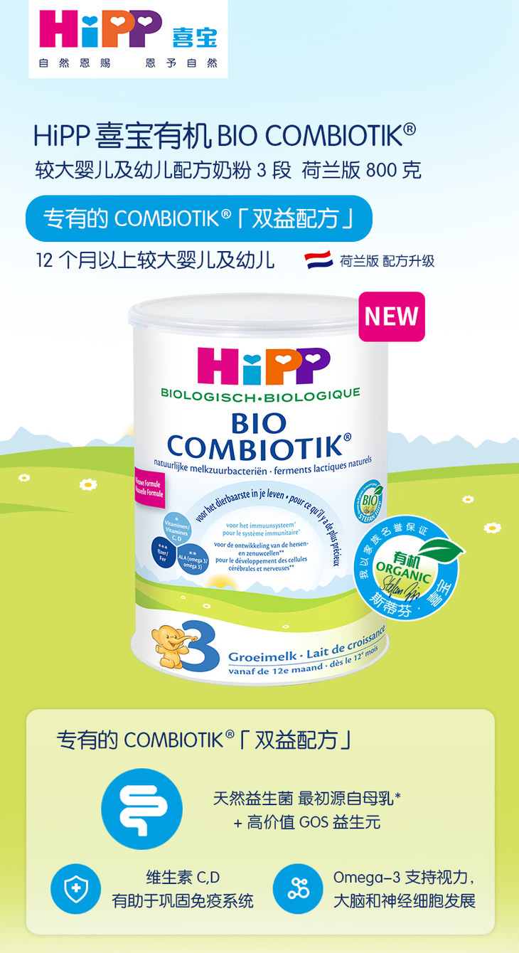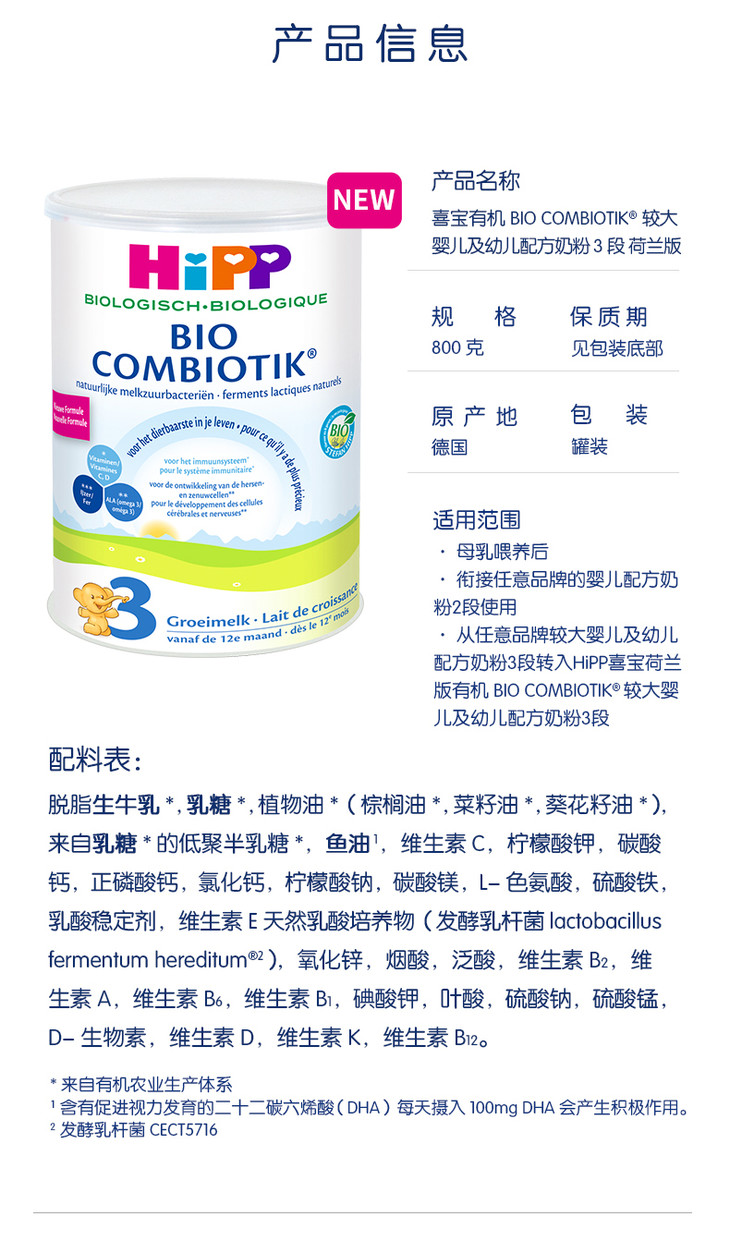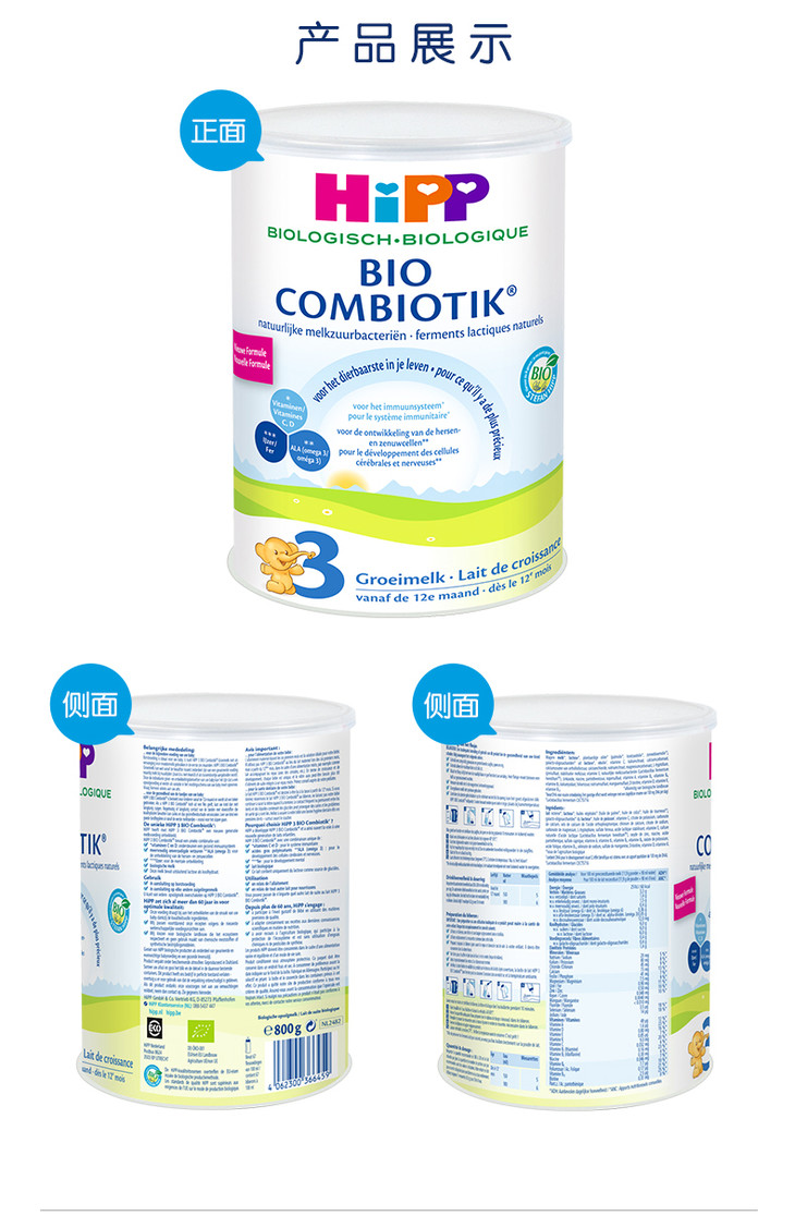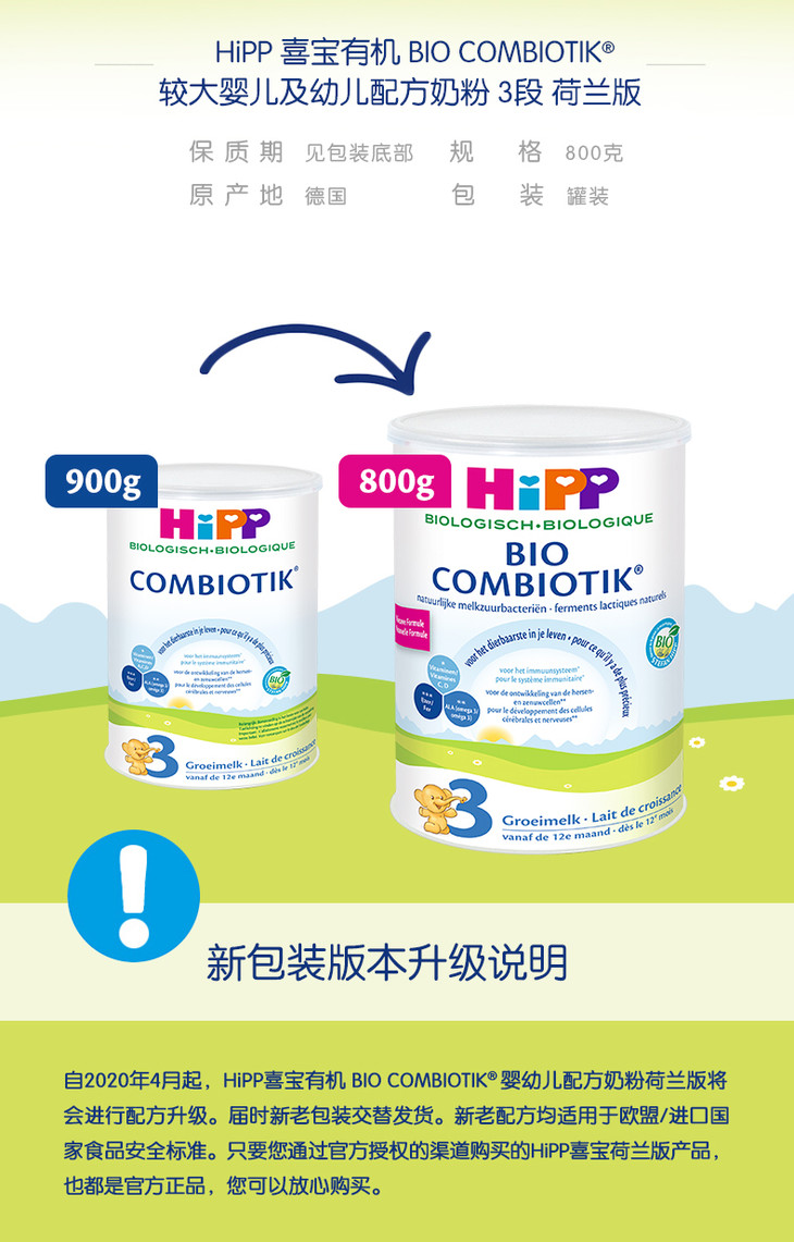 新包装800g/罐,老包装900g/罐,适合12个月以上宝宝。有机婴幼儿食品,天然无污染,根据德国的营养研究结果调整配方,添加益生元组合,有效促进肠道益生菌生长,减少便秘的发生,合理的配比,无需额外添加益生元和益生菌。