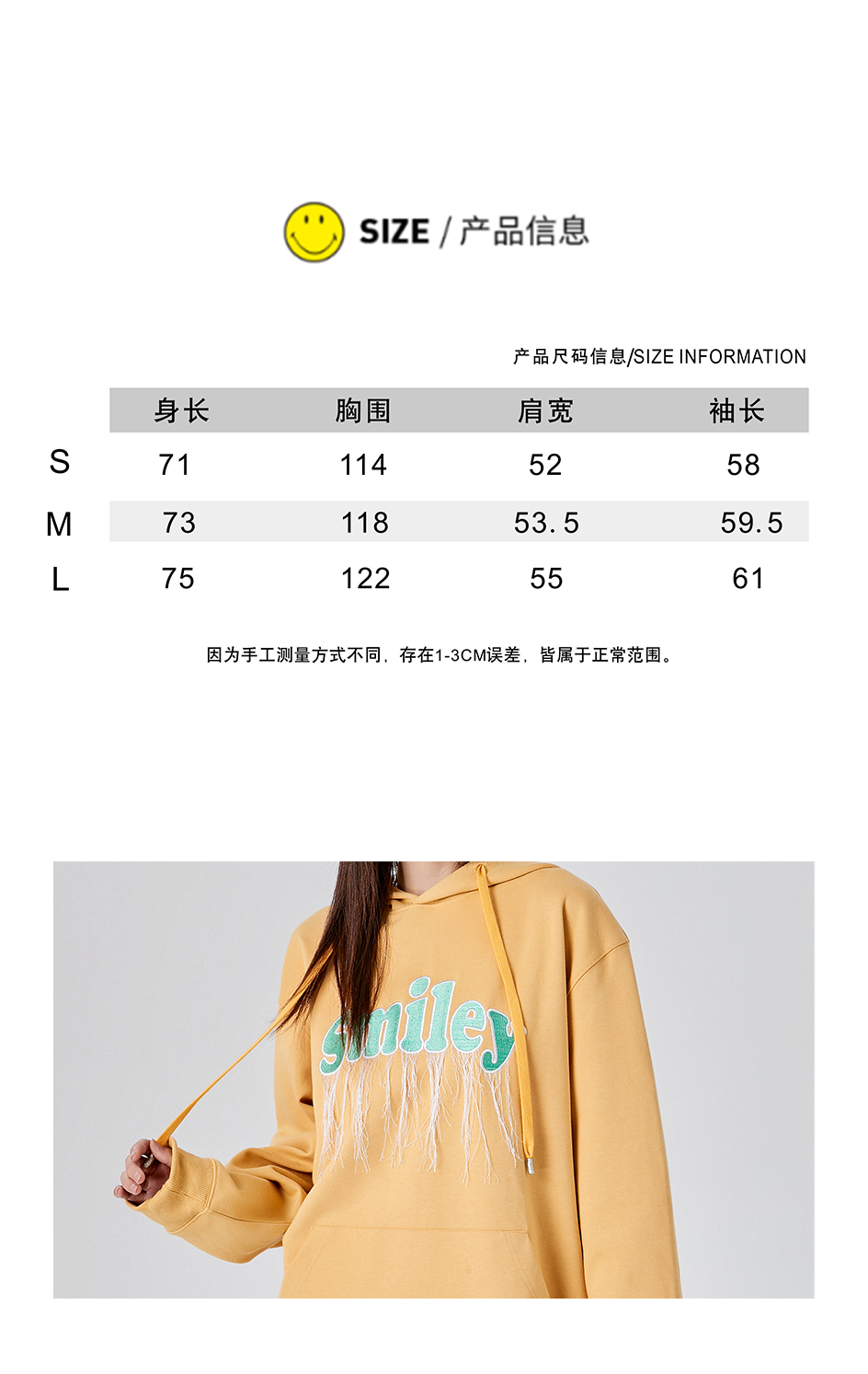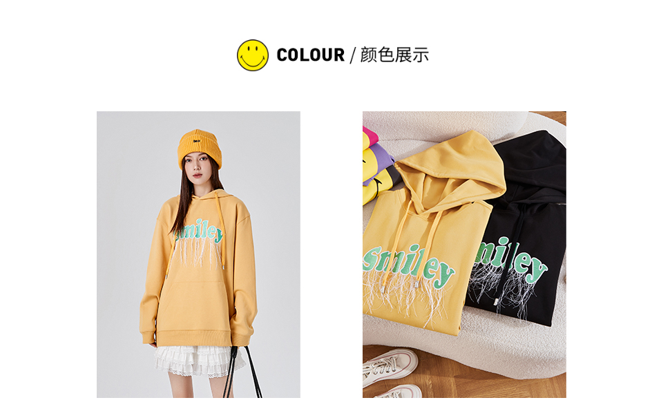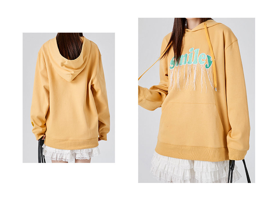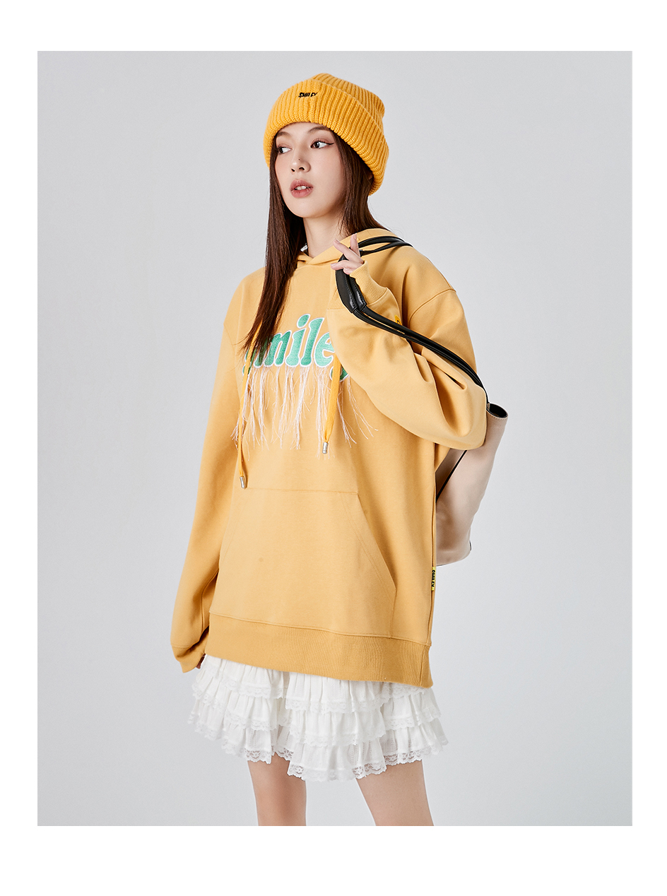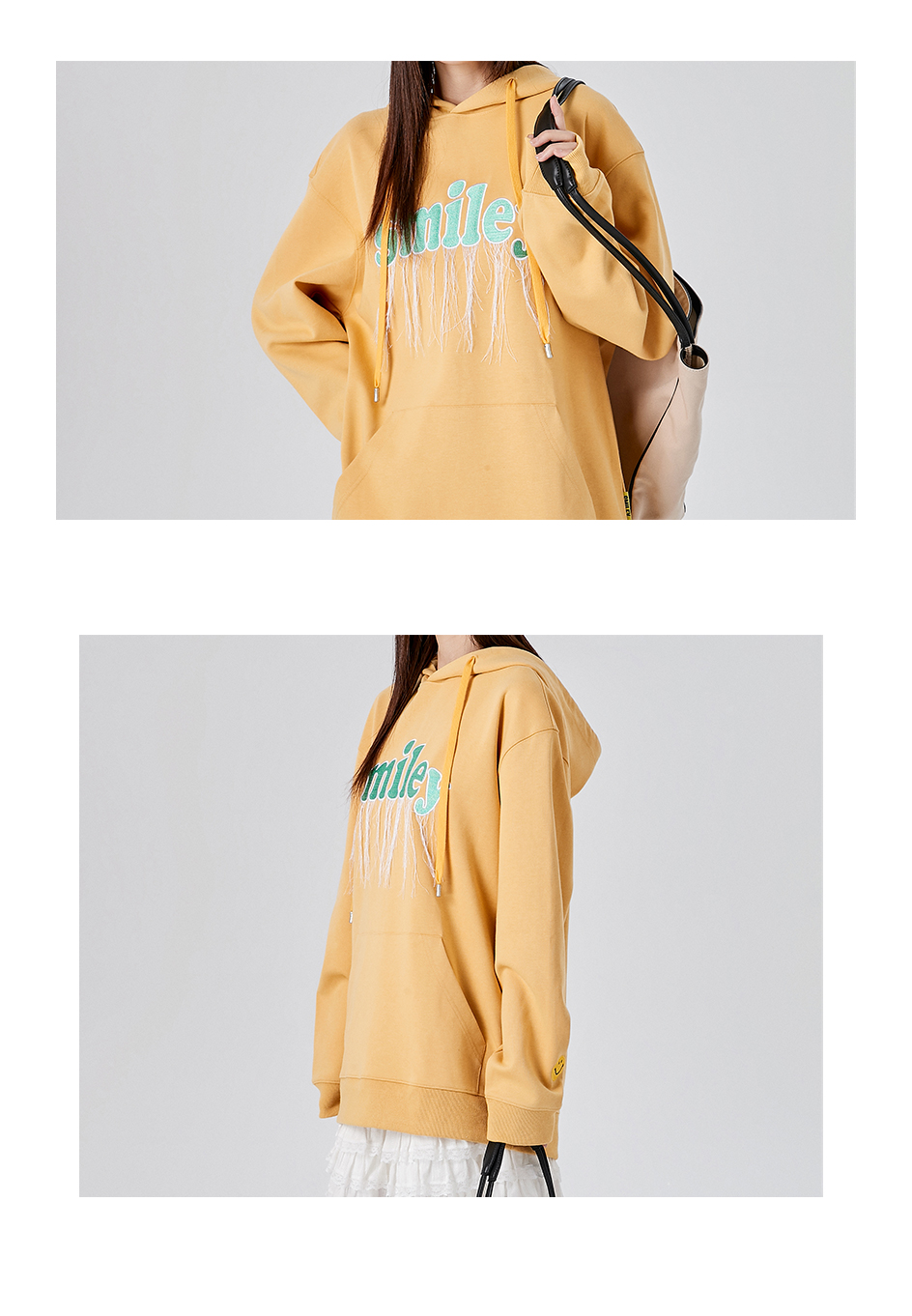 【品名】:字母毛巾刺绣流苏笑脸标连帽卫衣