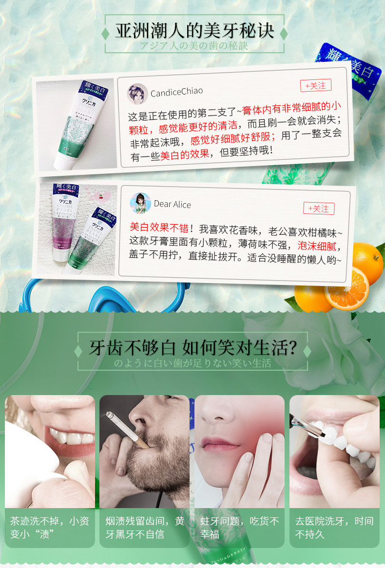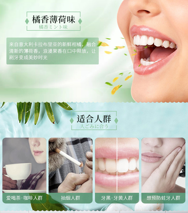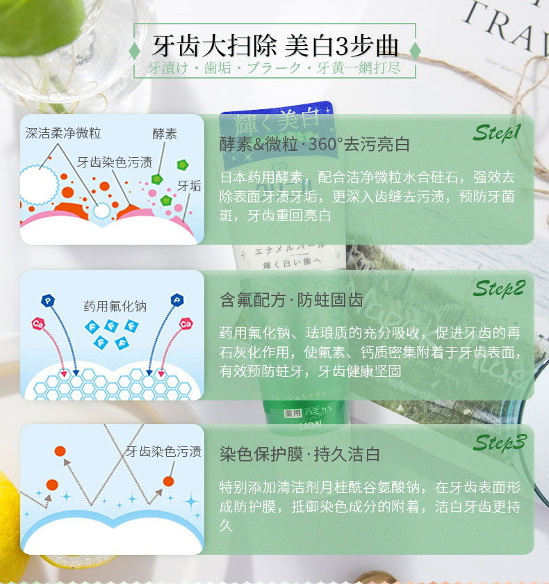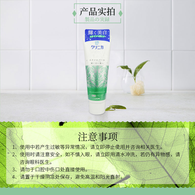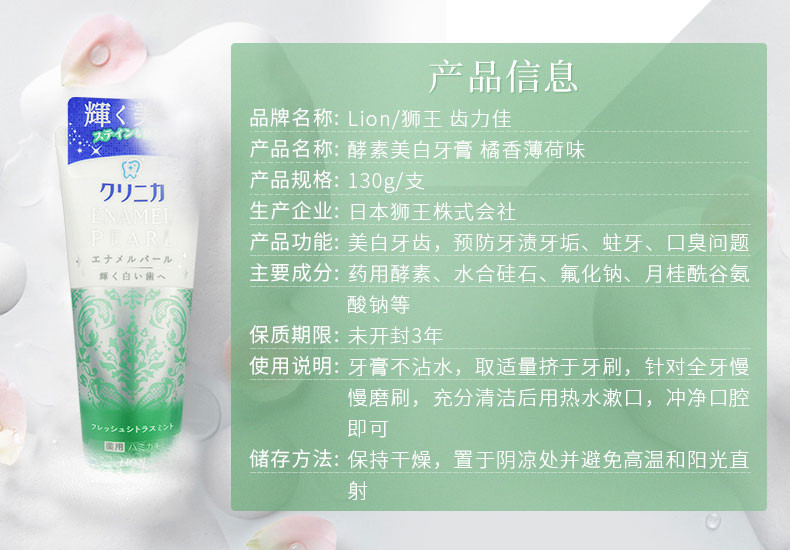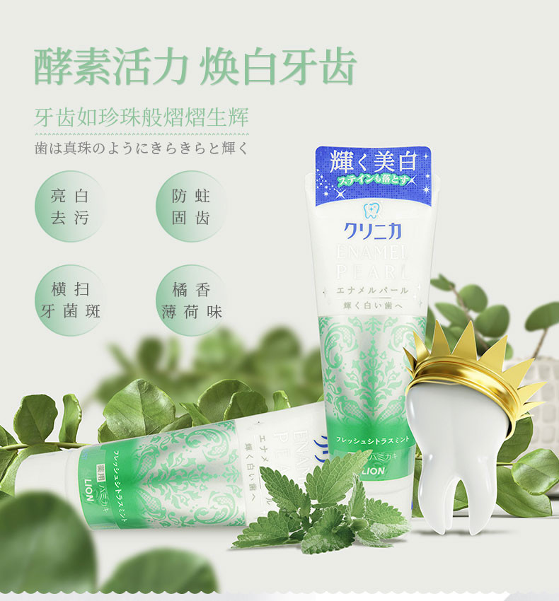 柑橘味薄荷牙膏。牙齿,一直都是美丽笑容的杀手锏。怎么样的人能给你好的印象?笑颜动人!7秒钟,决定印象,这是个看脸的世界。是的,来不及秀内涵。研究表明,嘴巴与可亲近程度的印象相关。牙黄、牙渍、无光泽,甚至蛀牙,好像感觉到了来自这个世界深深的恶意。日本狮王珍珠亮白超精细研磨颗粒美白牙膏,高密度酵素强力美白牙膏,含珍珠瓷白配方,高结晶密度,牙齿白亮强健;彻底清除牙菌斑,分解牙垢,有效预防蛀牙;抑制牙垢附着在牙齿表面,氟素可提高牙齿的抗酸能力。让你自信微笑,做一枚爱笑的美女纸或者美男纸~