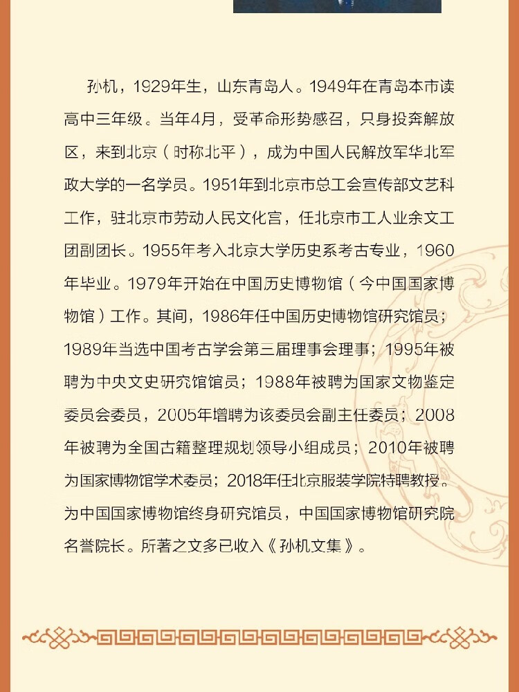 孙机,1929年生,山东青岛人。1949年在青岛本市读高中三年级。当年4月,受革命形势感召,只身投奔解放区,来到北京(时称北平),成为中国人民解放军华北军政大学的一名学员。1951年到北京市总工会宣传部文艺科工作,驻北京市劳动人民文化宫,任北京市工人业余文工团副团长。1955年考入北京大学历史系考古专业,1960年毕业。1979年开始在中国历史博物馆(今中国国家博物馆)工作。其间,1986年任中国历史博物馆研究馆员;1989年当选中国考古学会第三届理事会理事;1995年被聘为中央文史研究馆馆员;1988年被聘为国家文物鉴定委员会委员,2005年增聘为该委员会副主任委员;2008 年被聘为全国古籍整理规划领导小组成员;2010年被聘为国家博物馆学术委员;2018年任北京服装学院特聘教授。为中国国家博物馆终身研究馆员,中国国家博物馆研究院名誉院长。所著之文多已收入《孙机文集》。