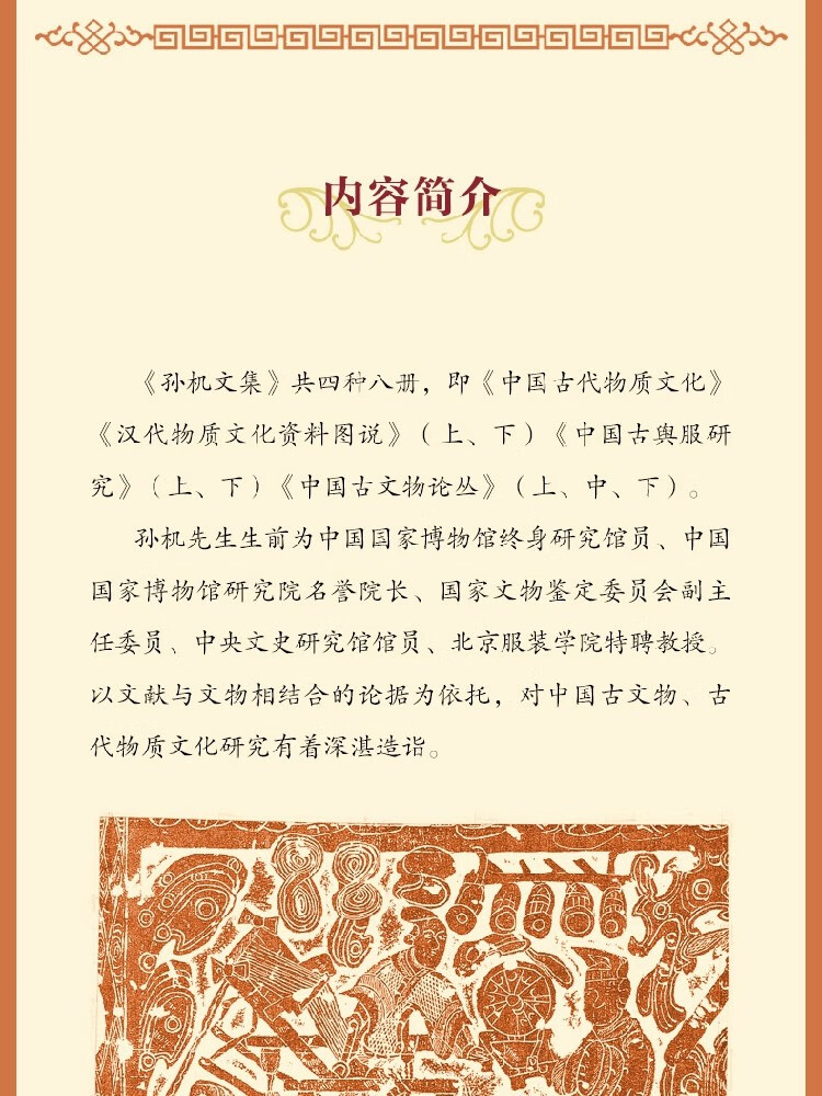 《孙机文集》共四种八册,即《中国古代物质文化》《汉代物质文化资料图说》(上、下)《中国古舆服研究》(上、下)《中国古文物论丛》(上、中、下)。