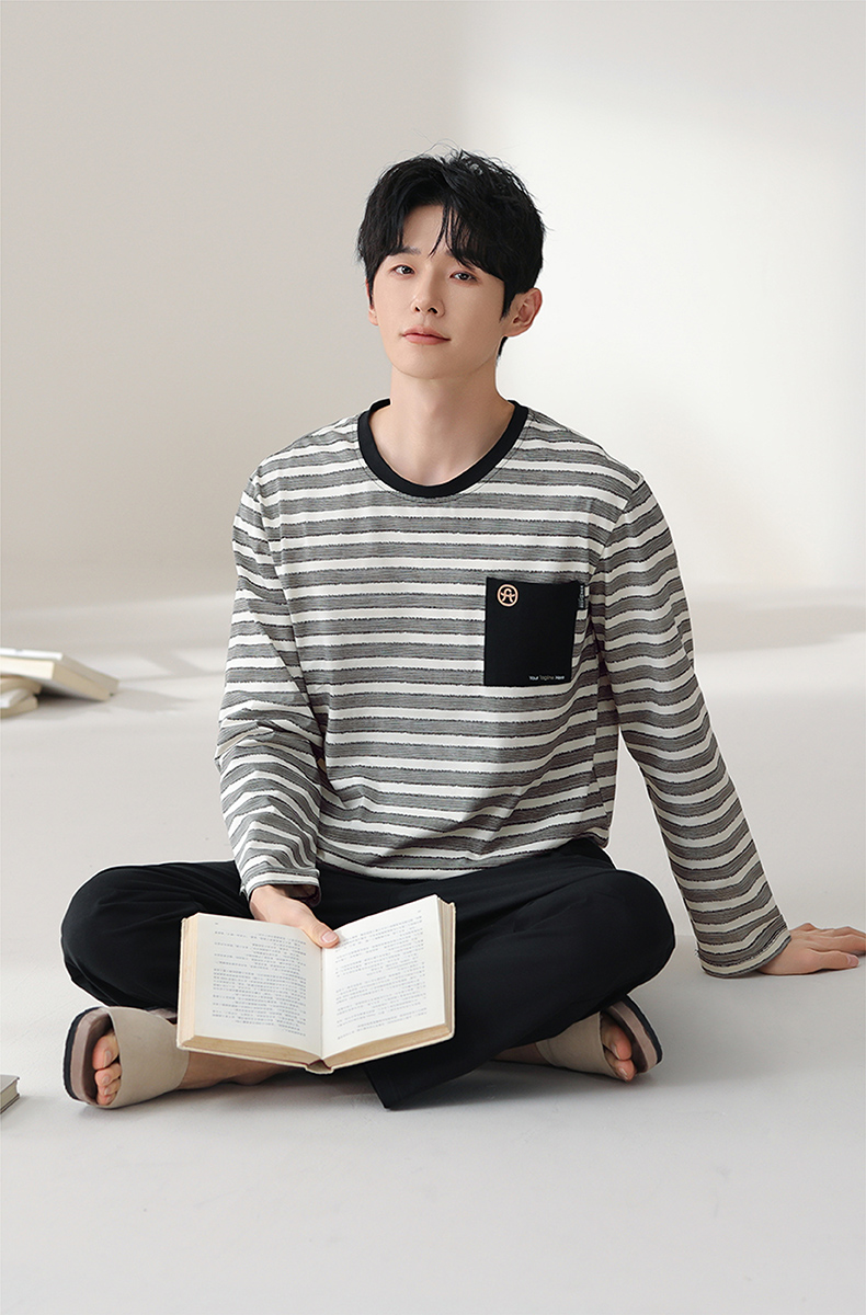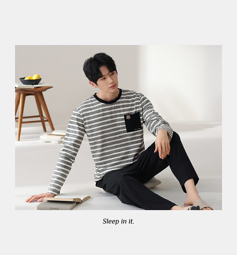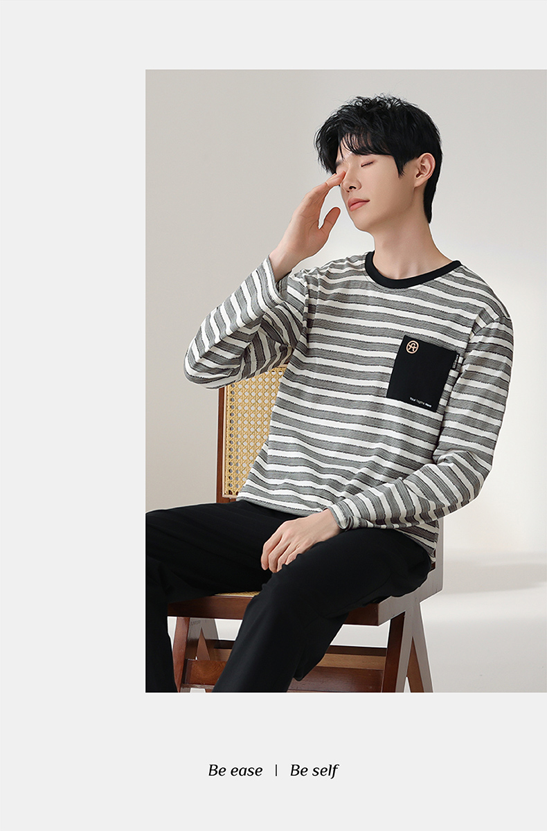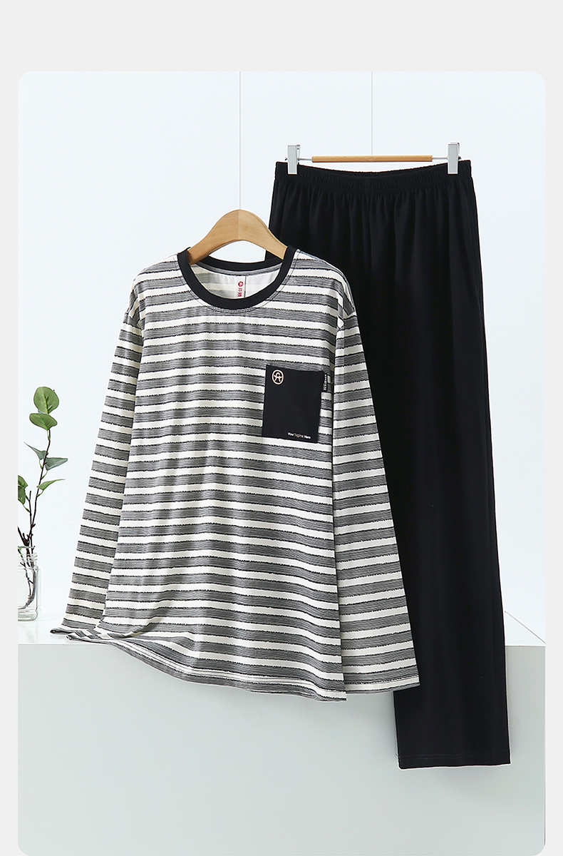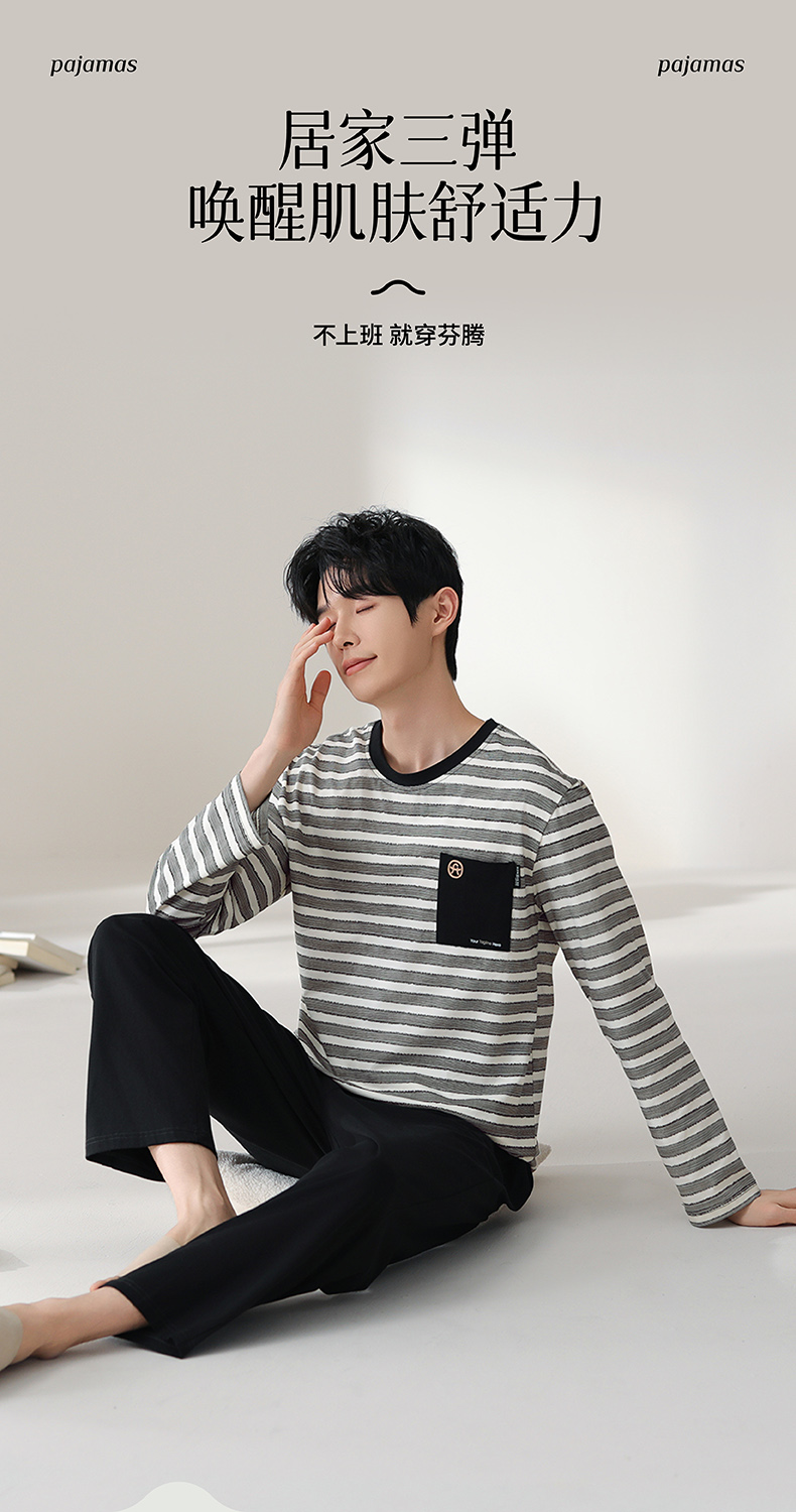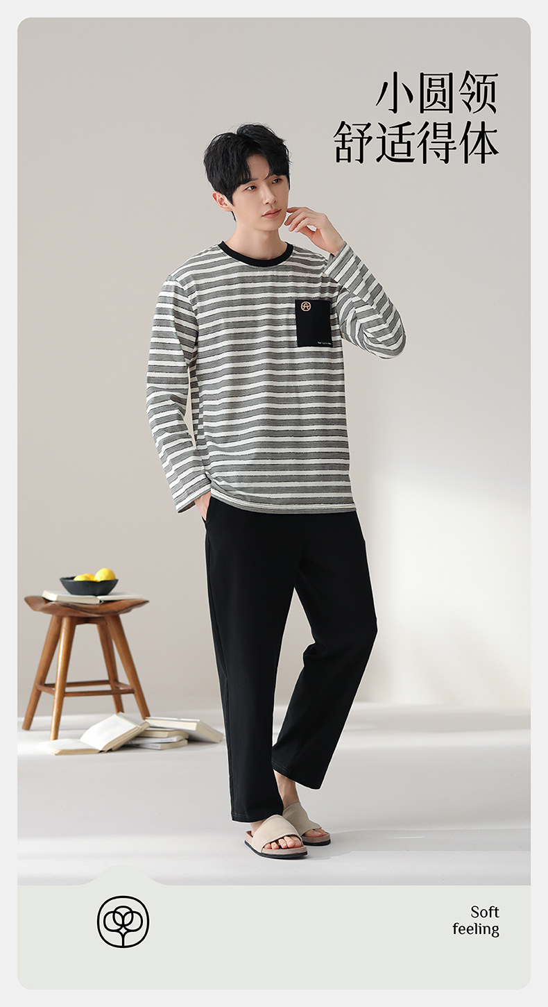 芬腾睡衣套装男士纯春秋款圆领条纹男生男款青年长袖可外穿家居服