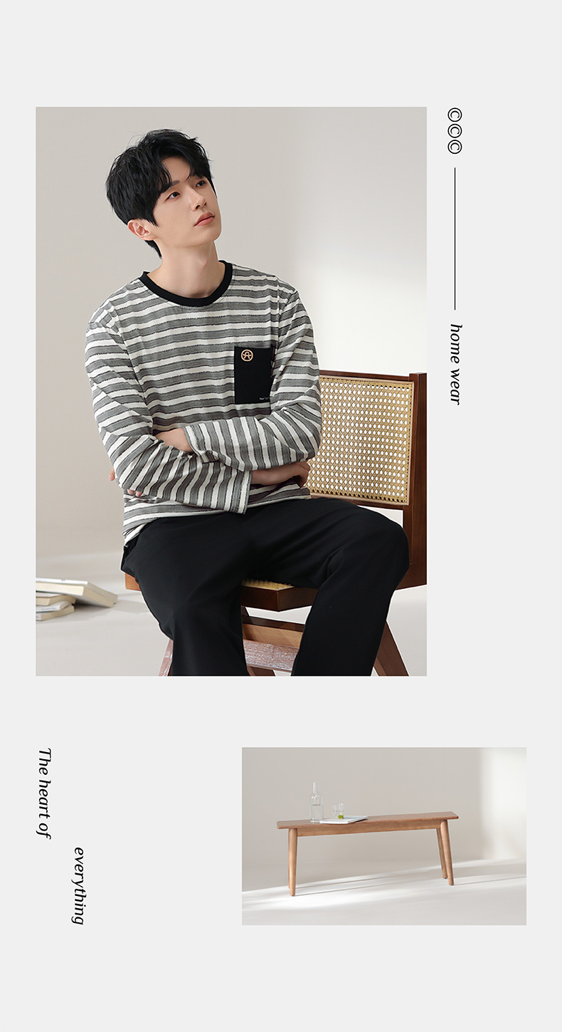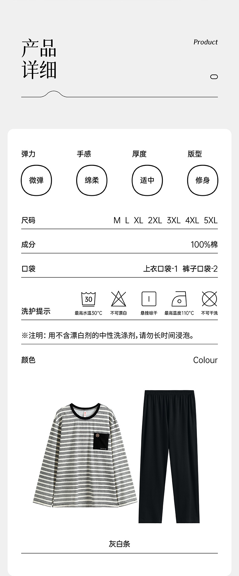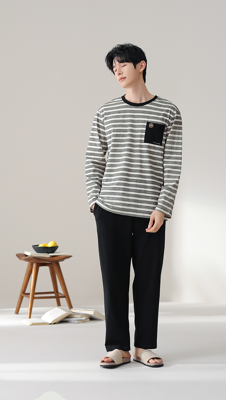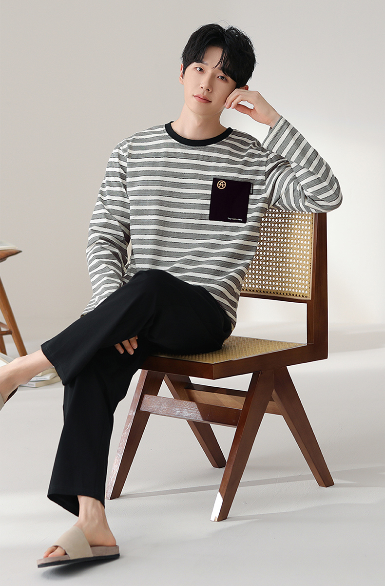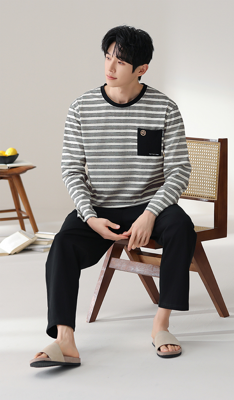 芬腾睡衣套装男士纯春秋款圆领条纹男生男款青年长袖可外穿家居服