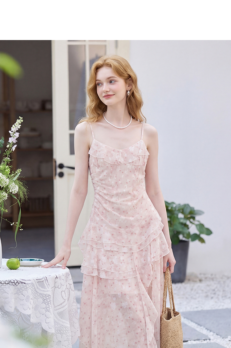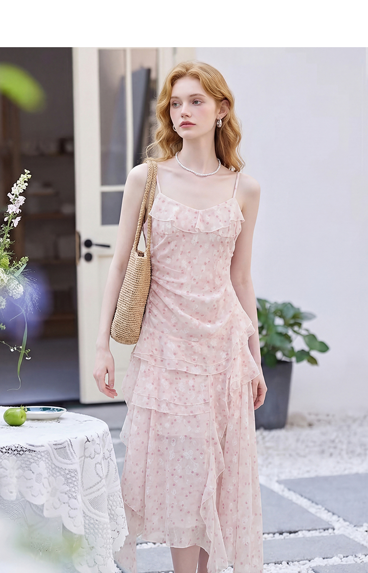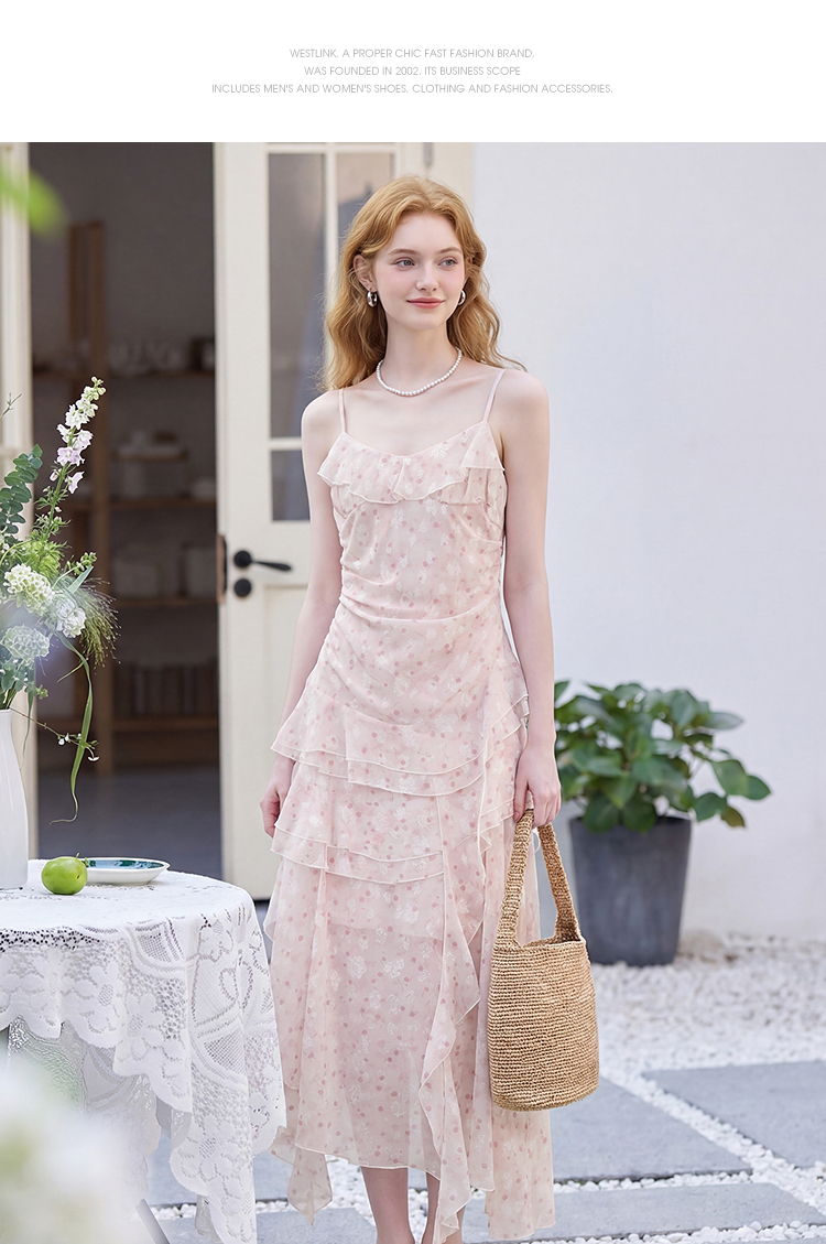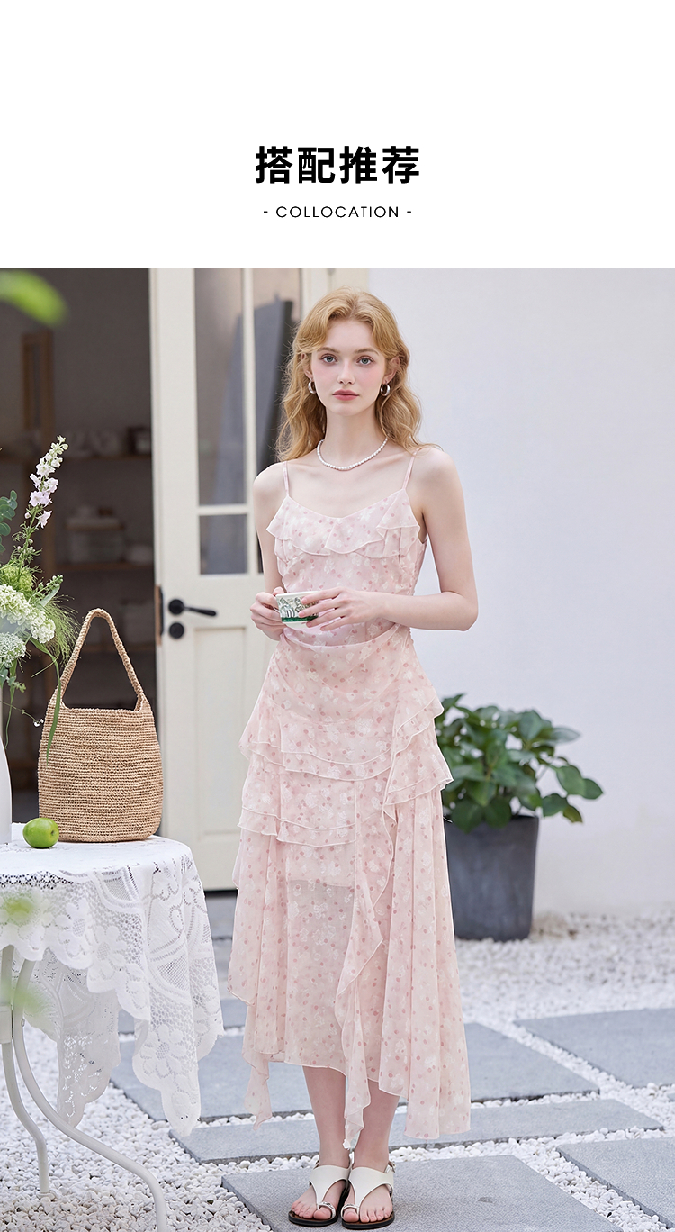 西遇双层荷叶边2026春季新款不规则飘带提花吊带长裙显瘦连衣裙H0060202