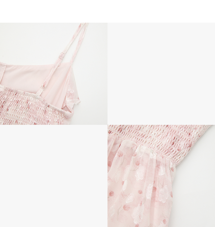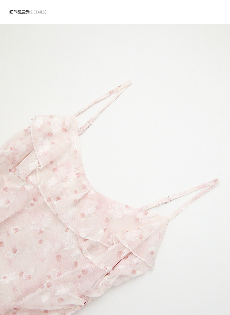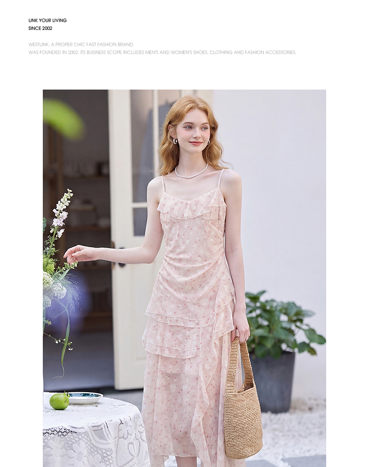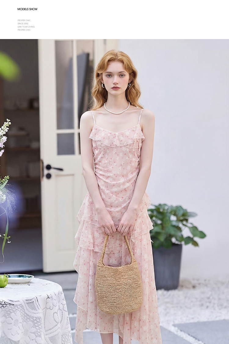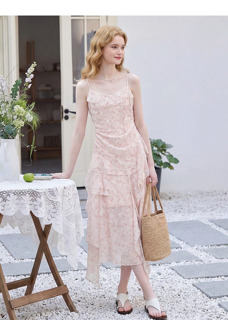 西遇双层荷叶边2026春季新款不规则飘带提花吊带长裙显瘦连衣裙H0060202