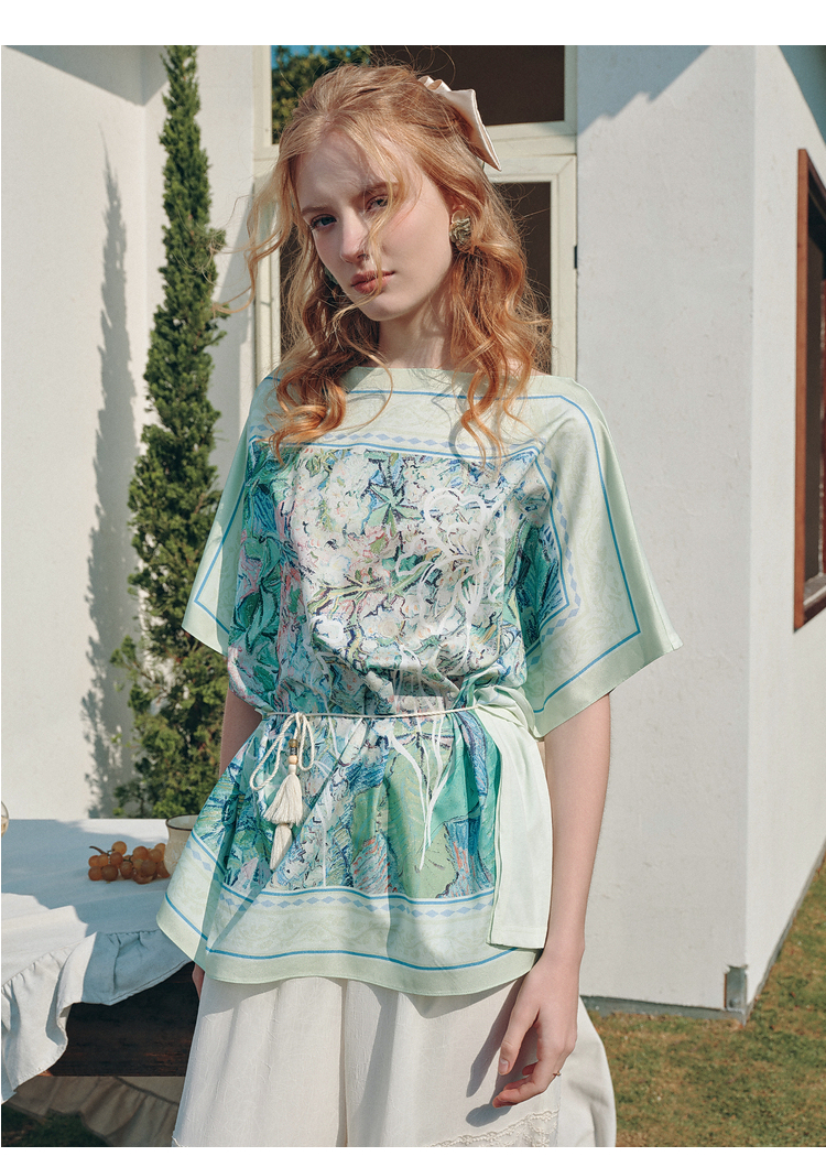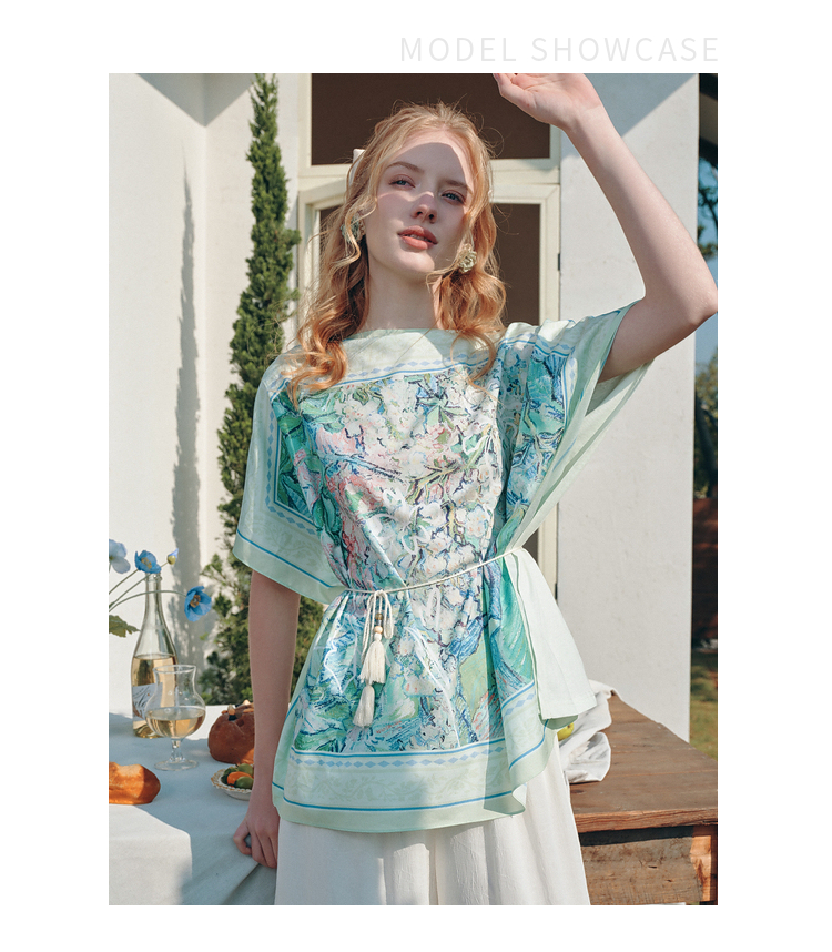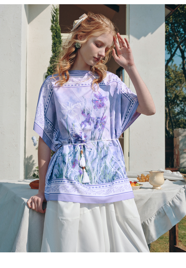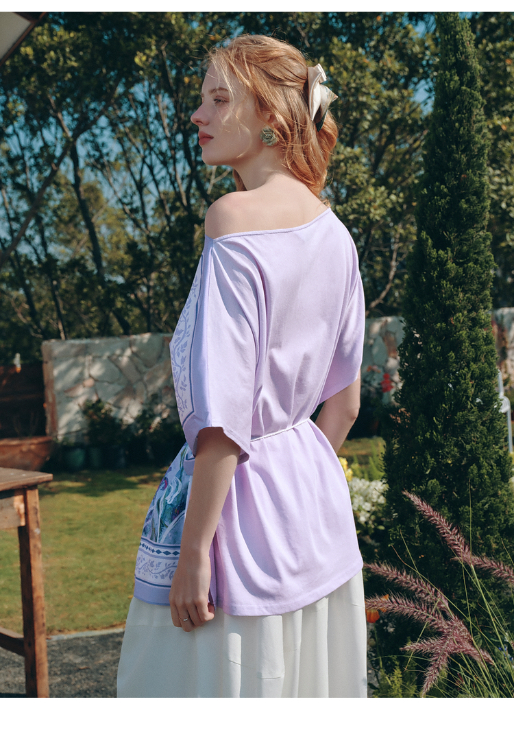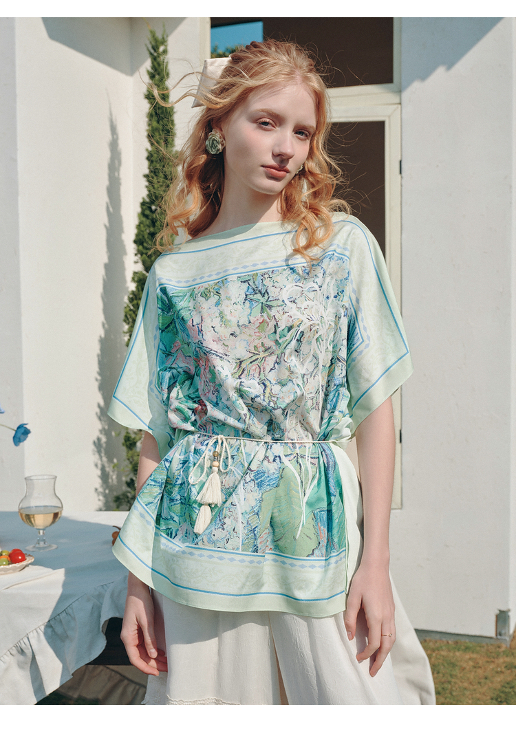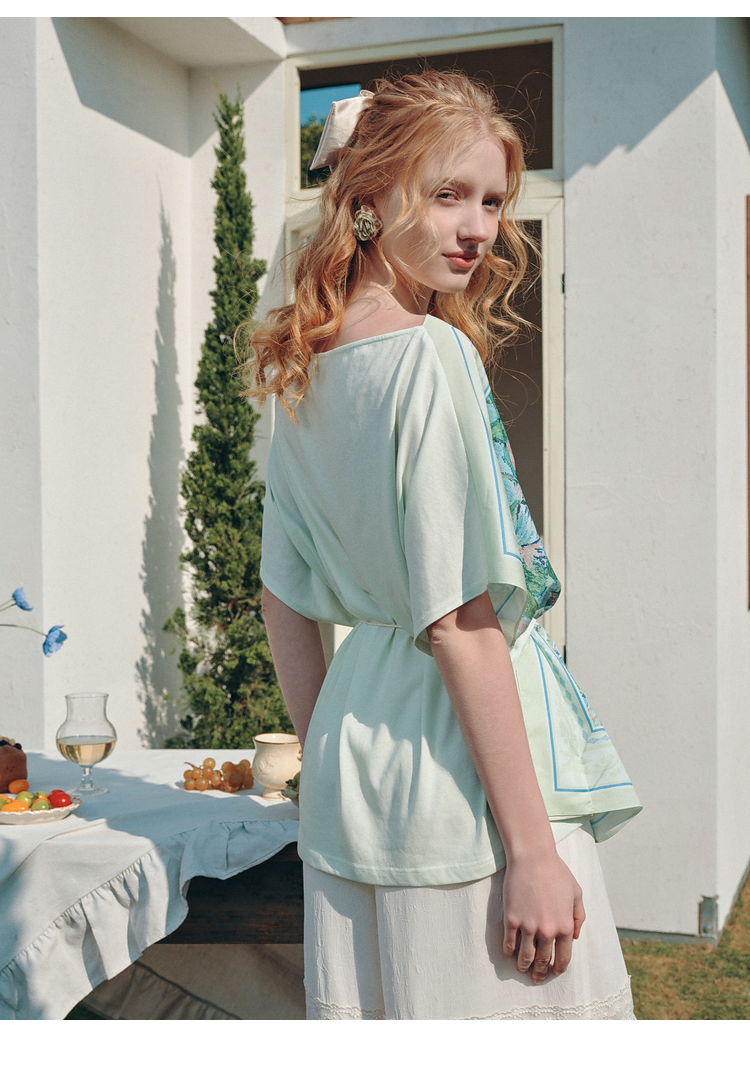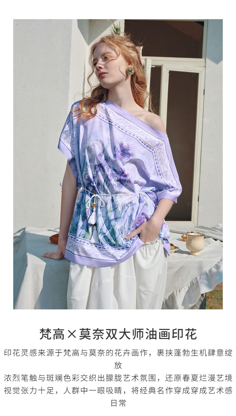 两三事梵高文艺 野境生花 2026夏季新款复古印花绑带一字领t恤女