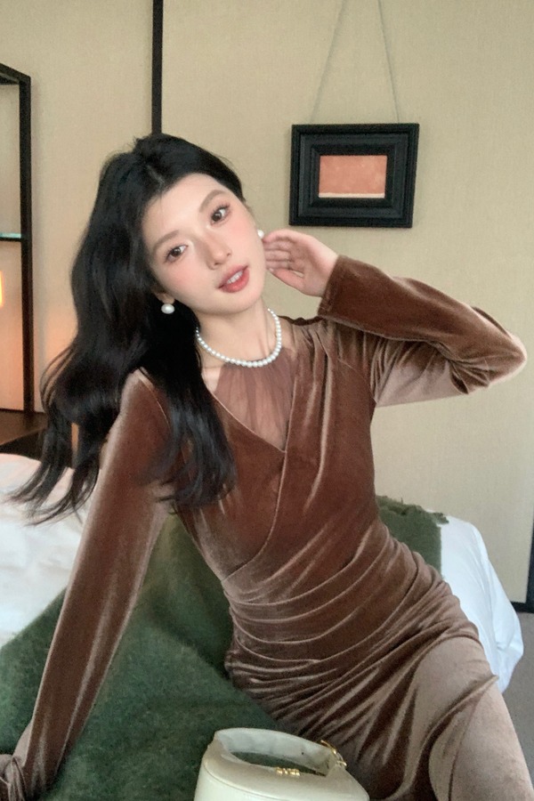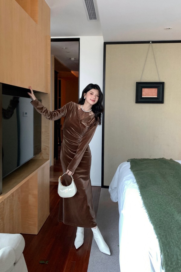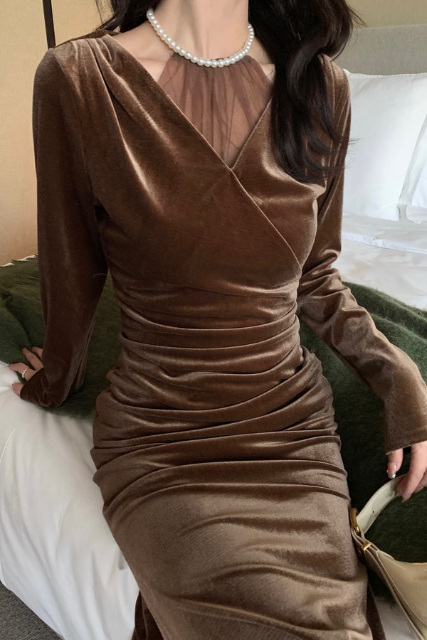 SIA SAYLOR 高级质感珍珠领收腰丝绒连衣裙 21628