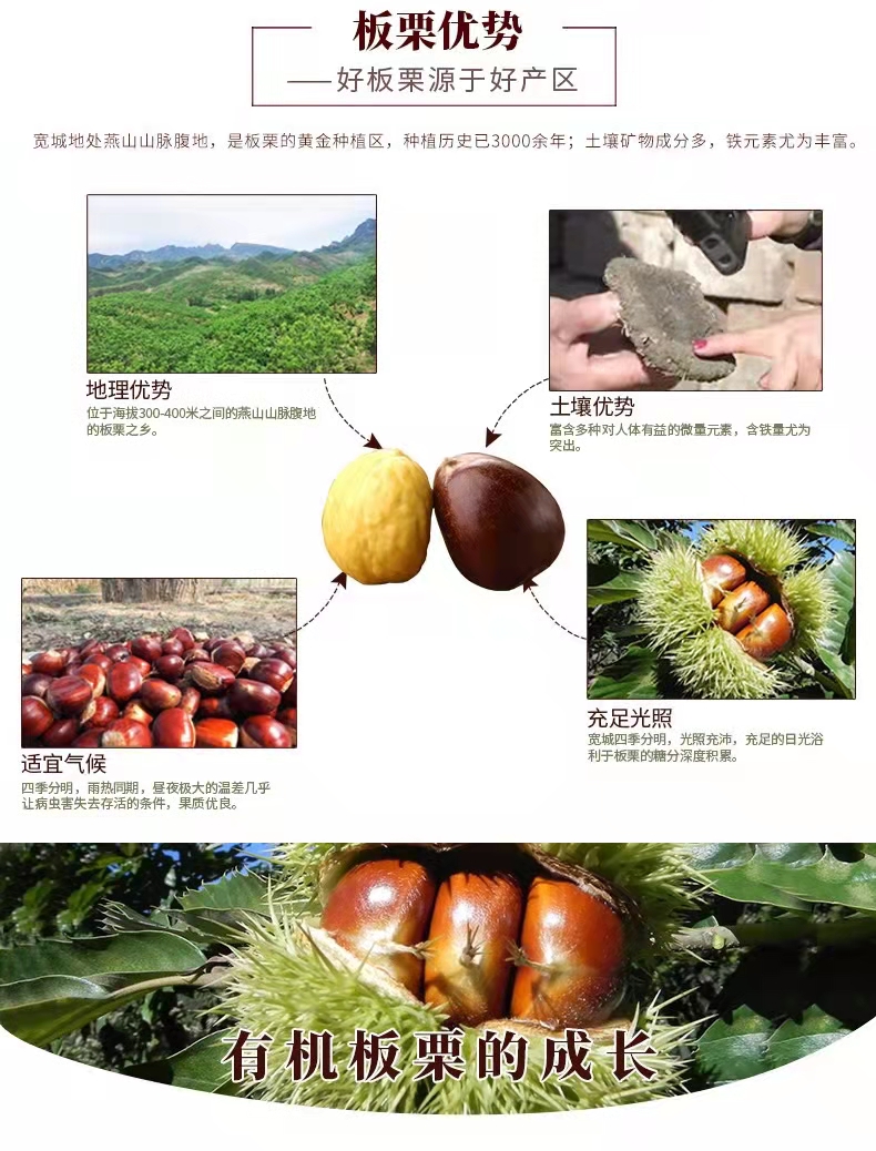 2. 宽城板栗被国内外客户誉为长在铁矿石上的板栗,含有钙铁锌硒等多种矿物质,皮薄好剥,具有糯、软、甜、香的独特品质。板栗种植全程采用人工修枝、科学除草、环保驱虫、深山自然生长,自然树熟,手工采摘。确保了产品的优质质量。