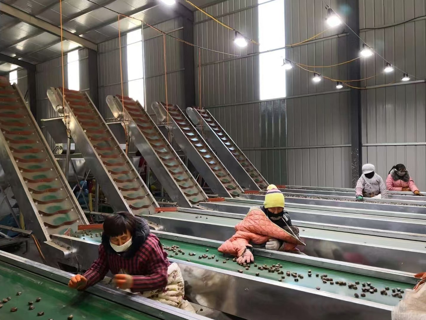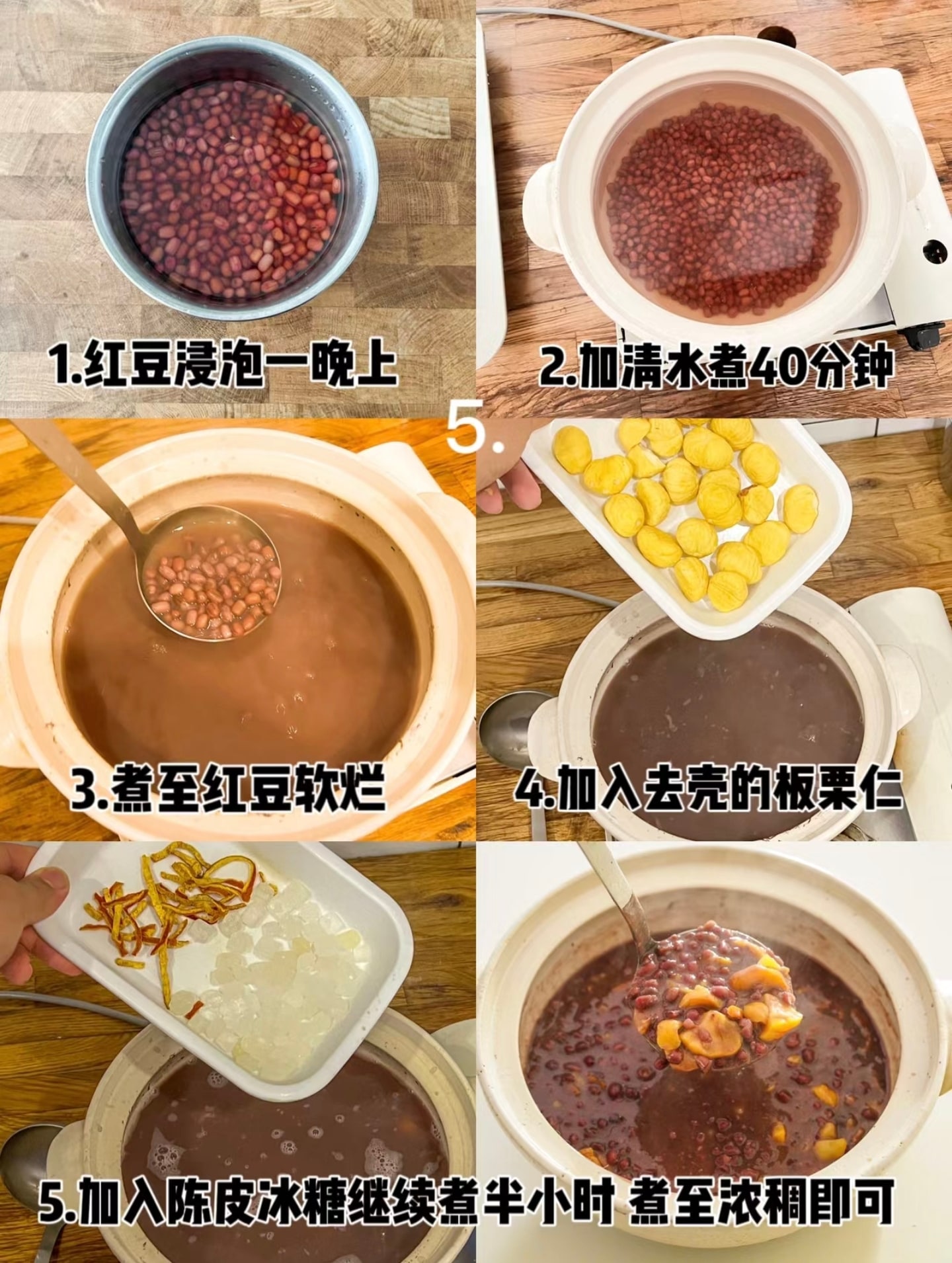 3,重新接一锅凉水把热栗子捞进去,加冰糖5粒煮20分钟,然水煮干,开始翻炒到上色即可。[强]